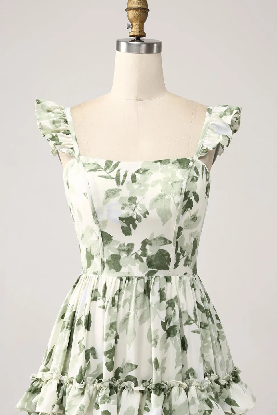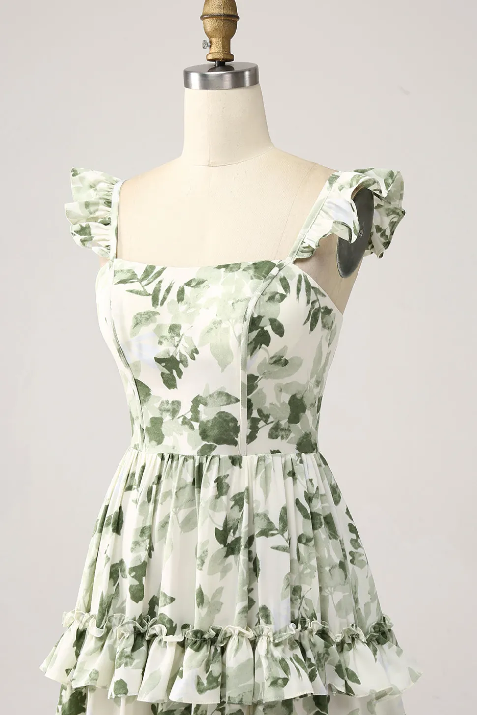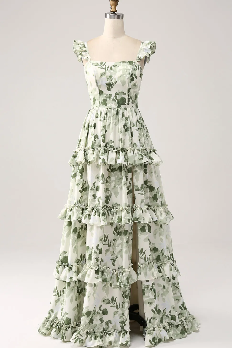 Green Floral Ruffles Tiered Prom Dress with Slit