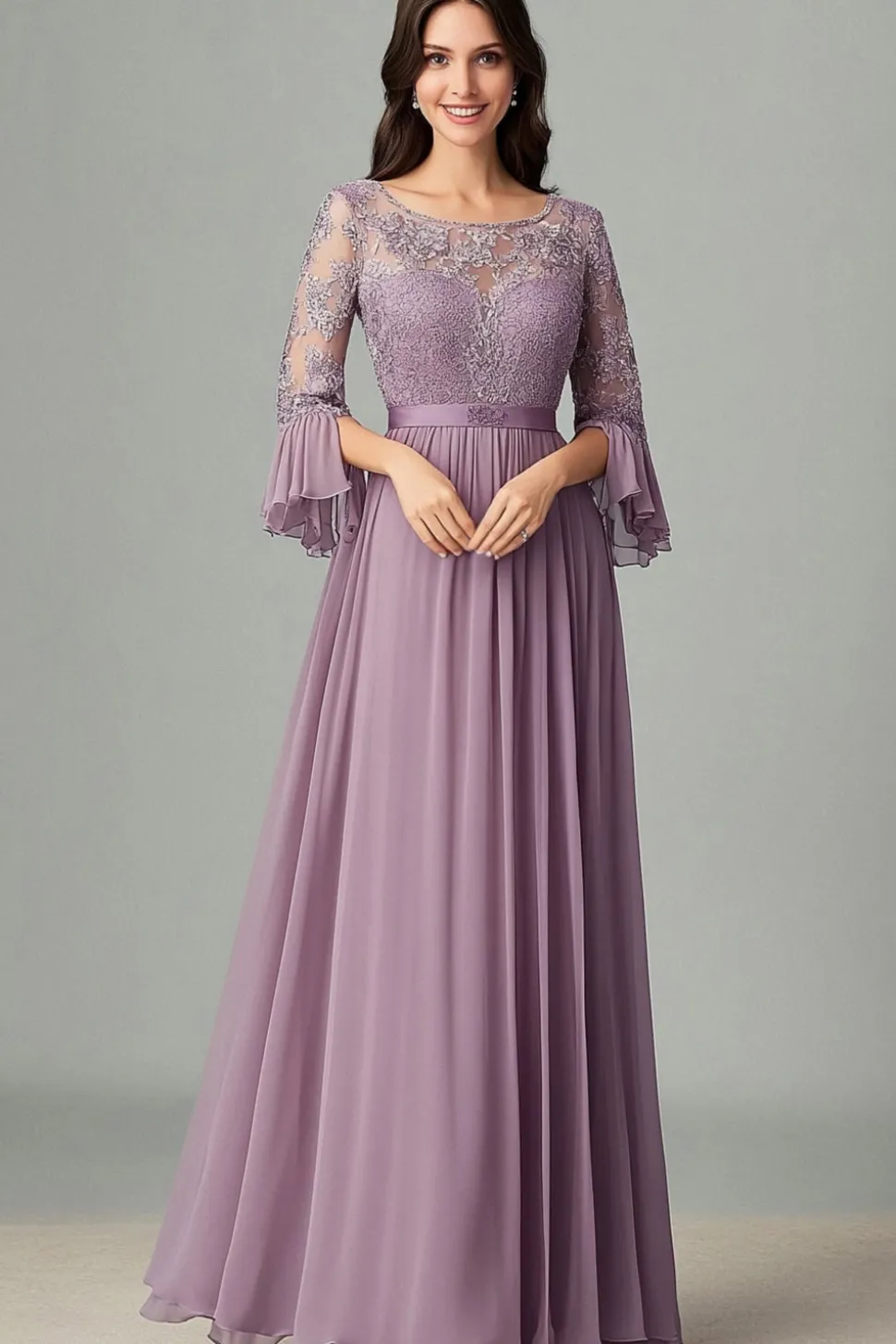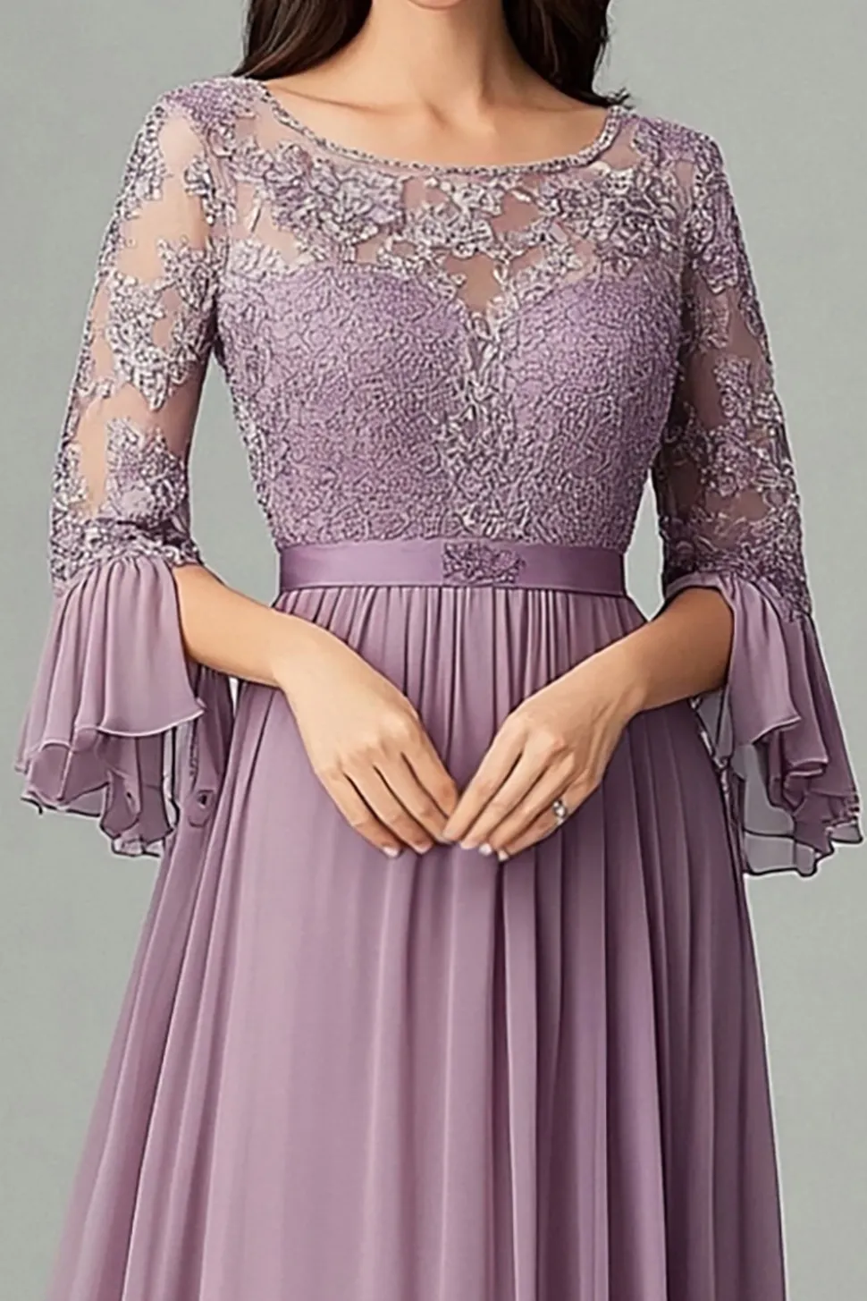 Taro Purple Lace Chiffon Mother Of the Bride Dress with 3/4 Sleeves