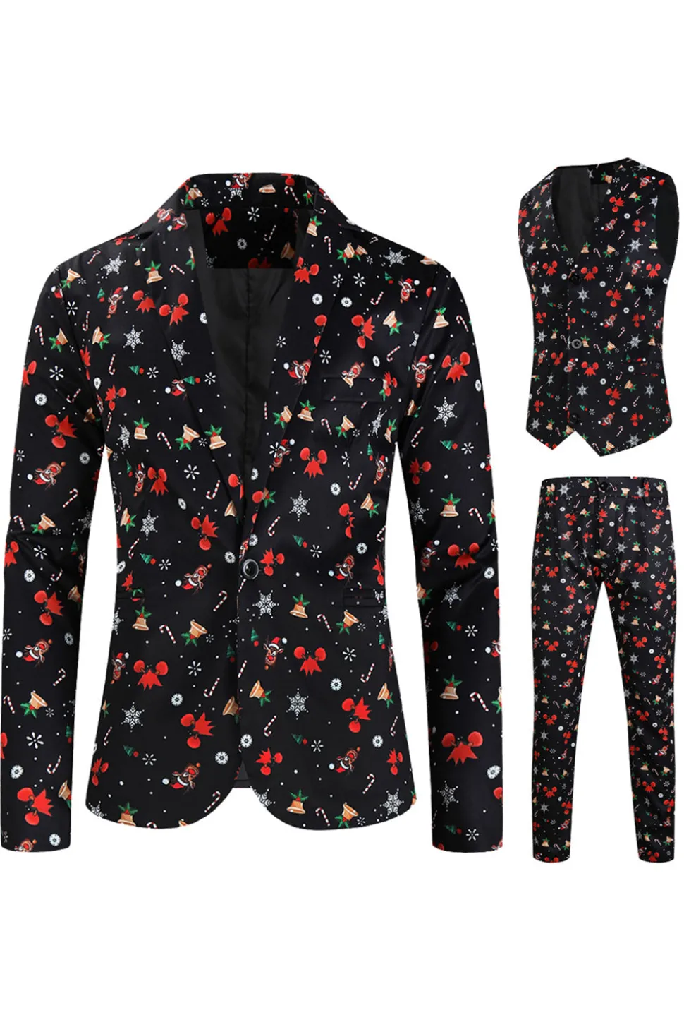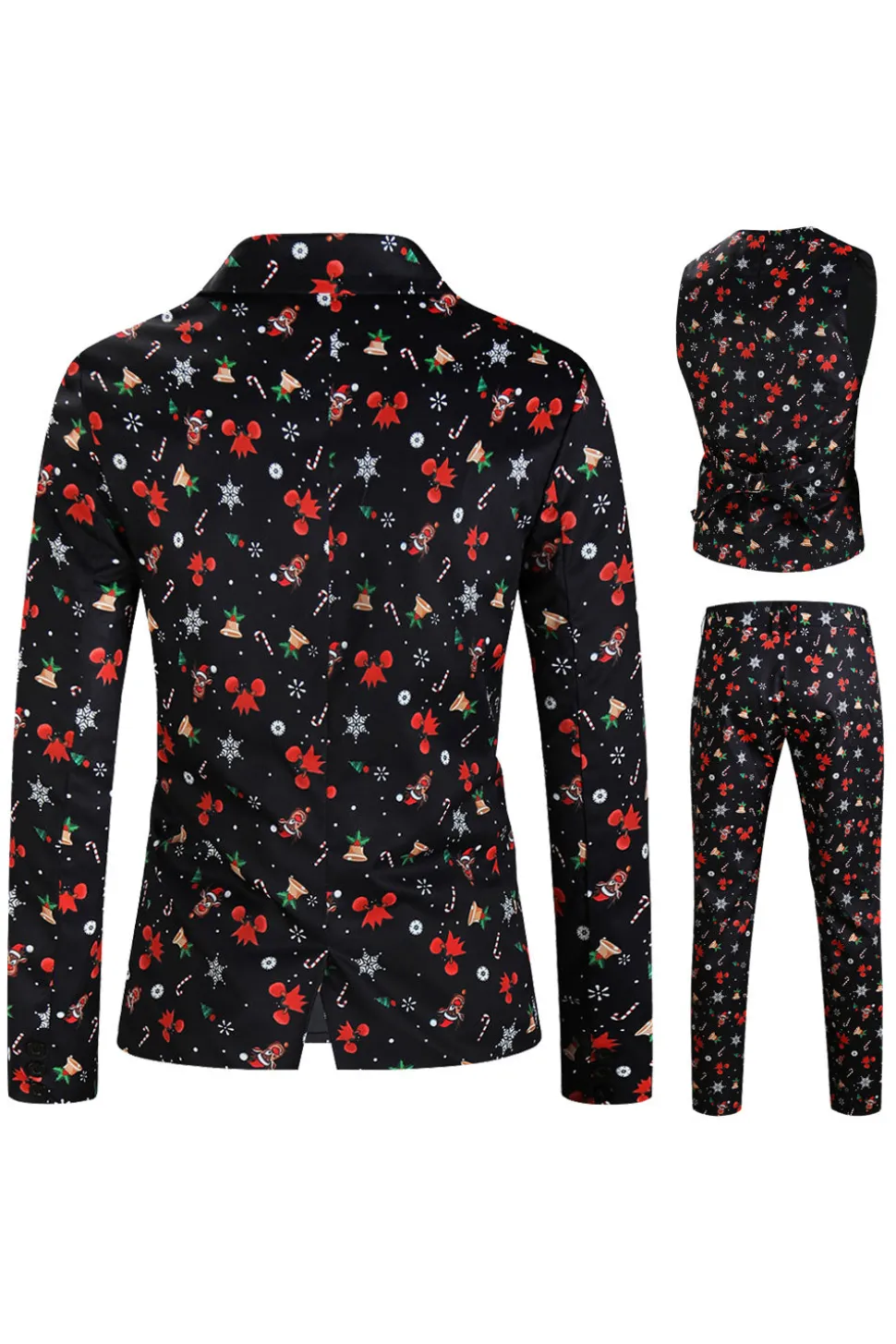 3 Pieces Black One Button Bell Cane Print Men's Christmas Suit
