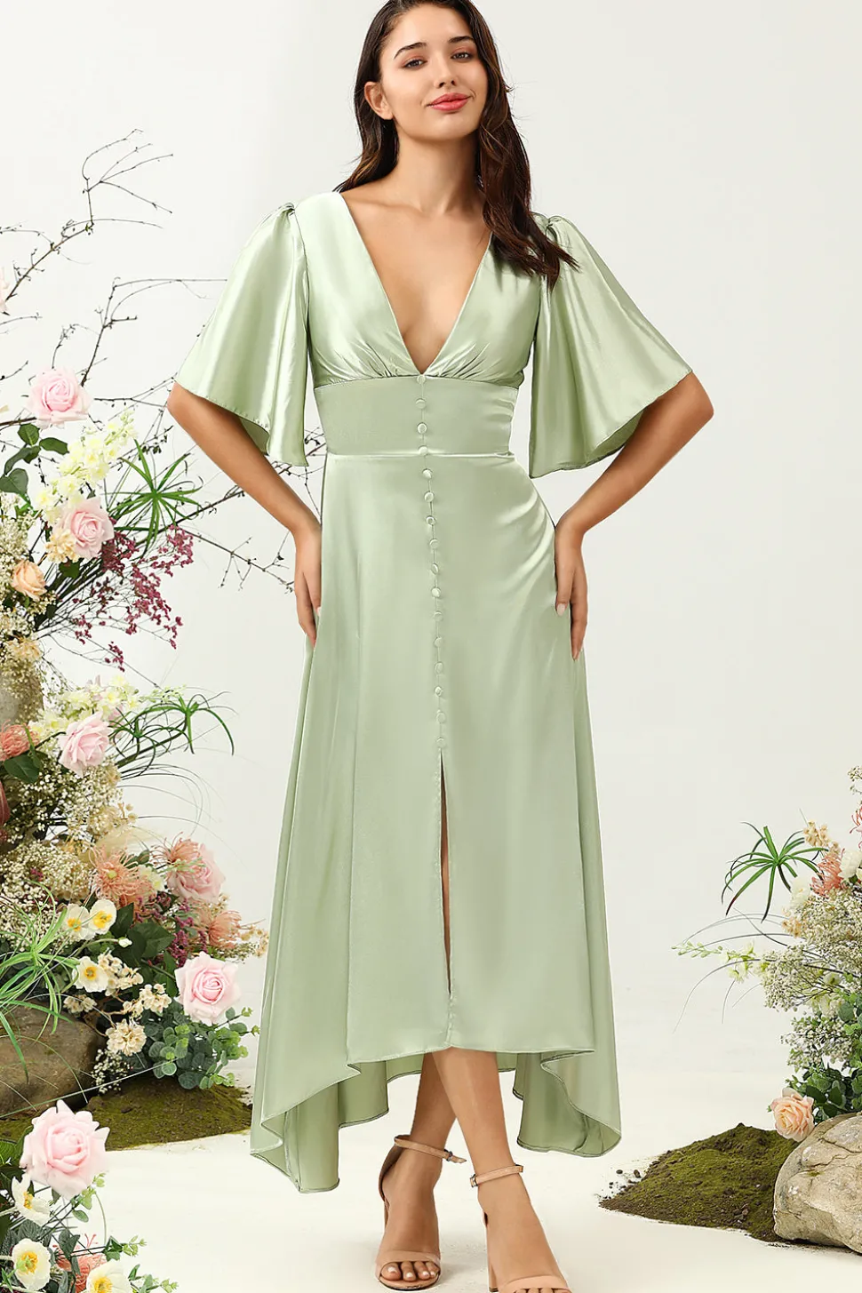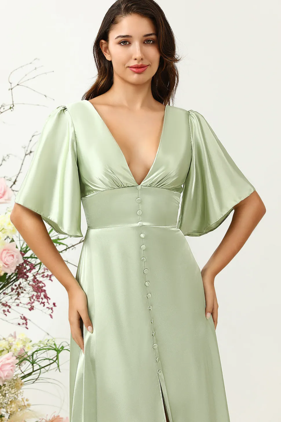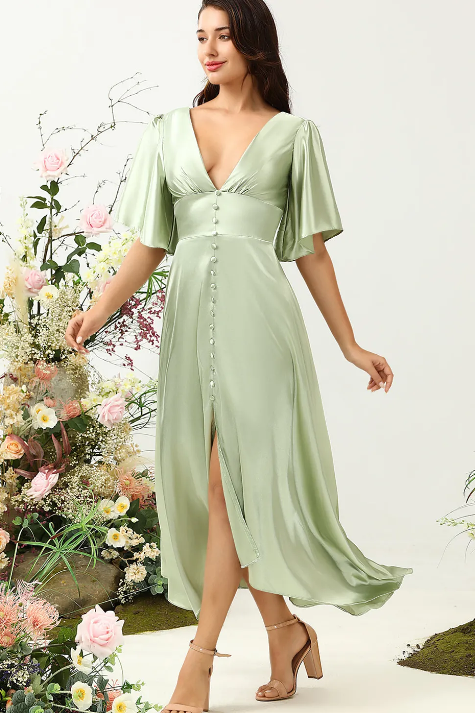 A Line Deep V Neck Light Green Wedding Guest Dress with Half Sleeves