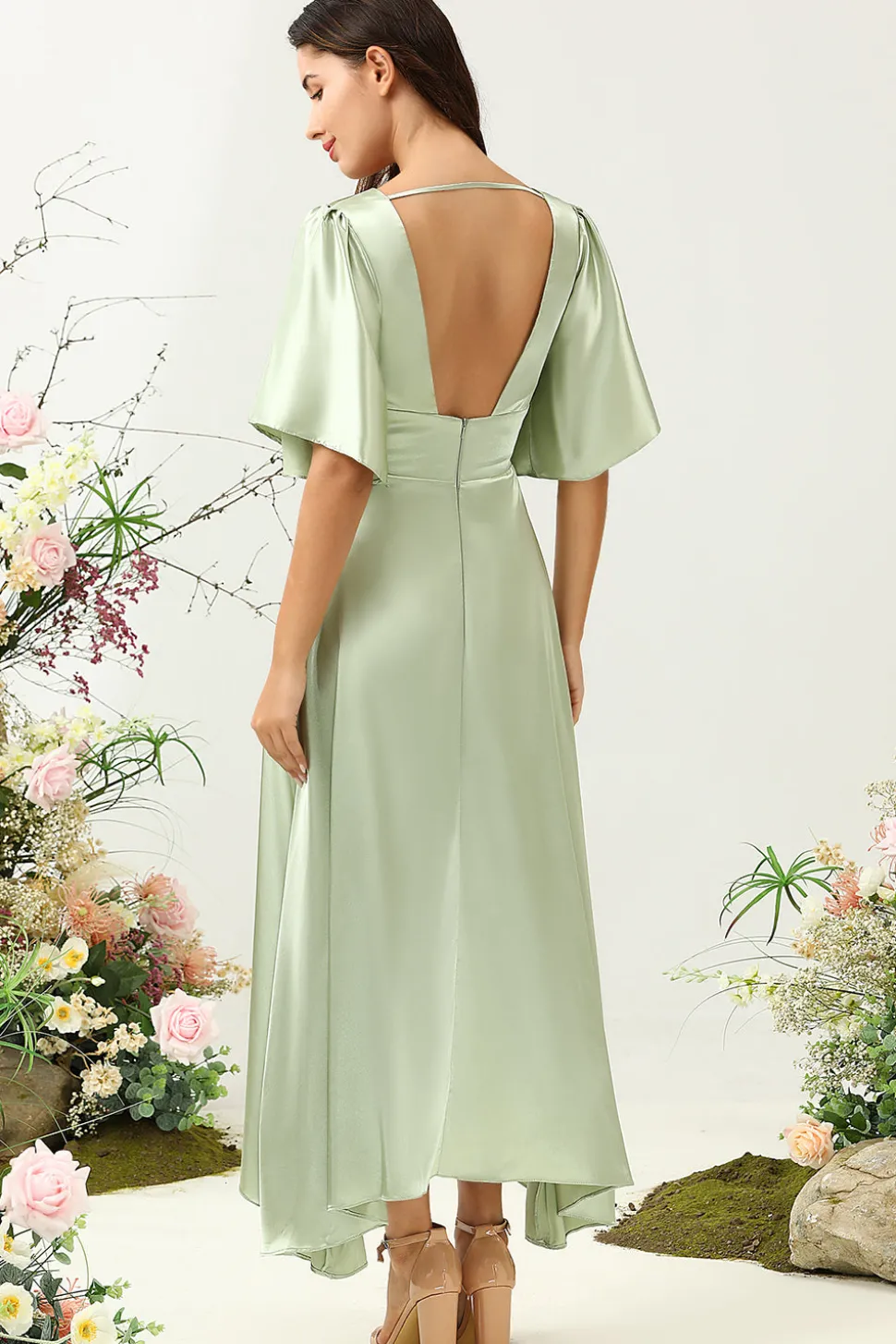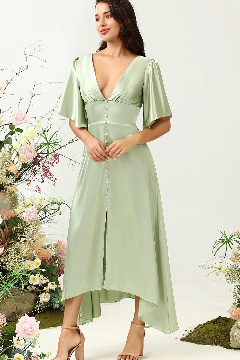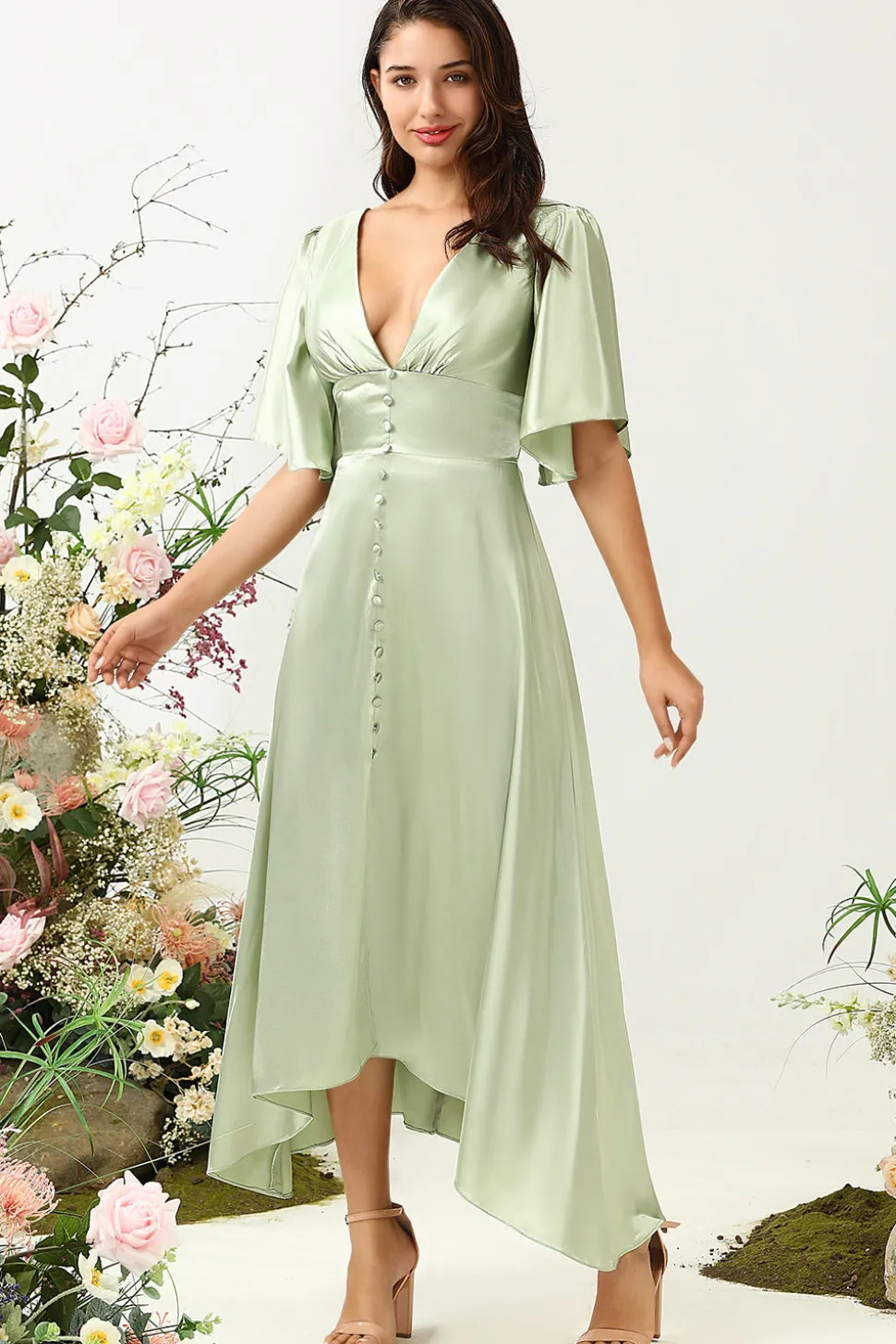 A Line Deep V Neck Light Green Wedding Guest Dress with Half Sleeves