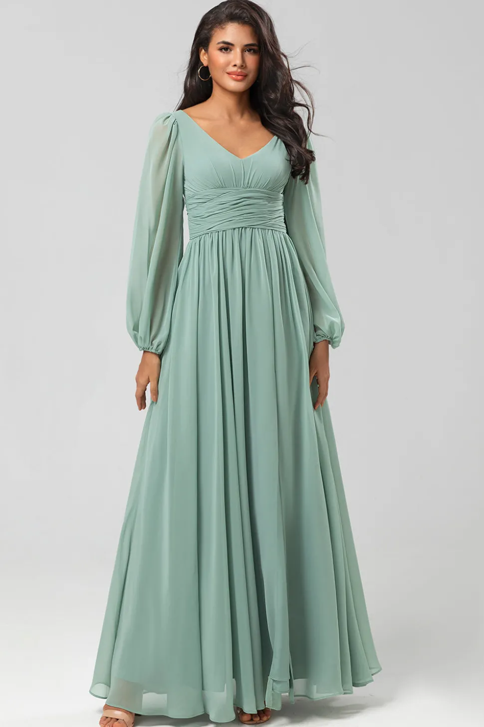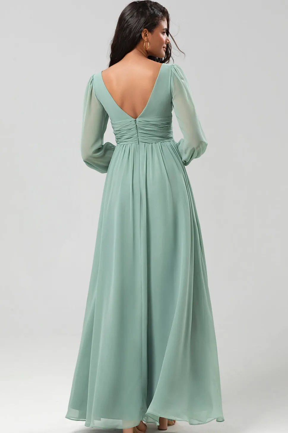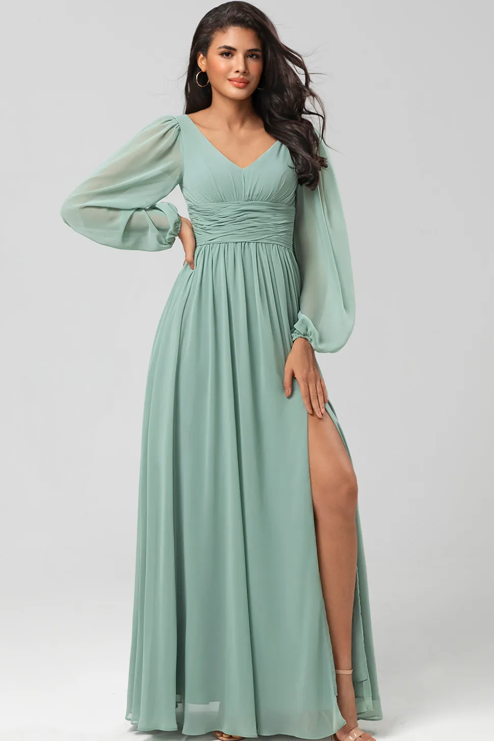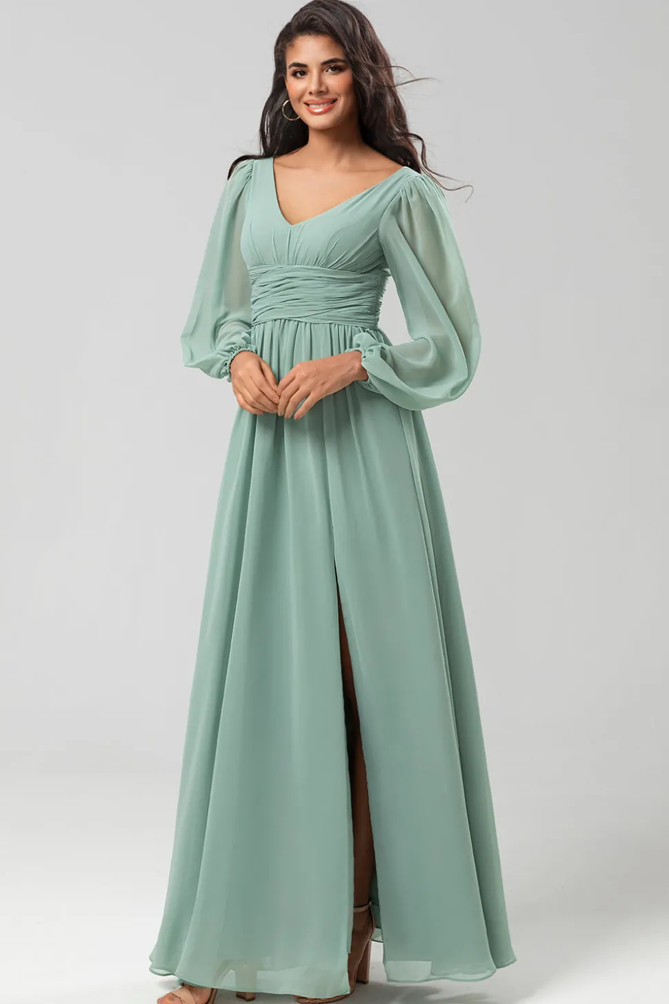A Line Green Long Sleeves Bridesmaid Dress with Slit