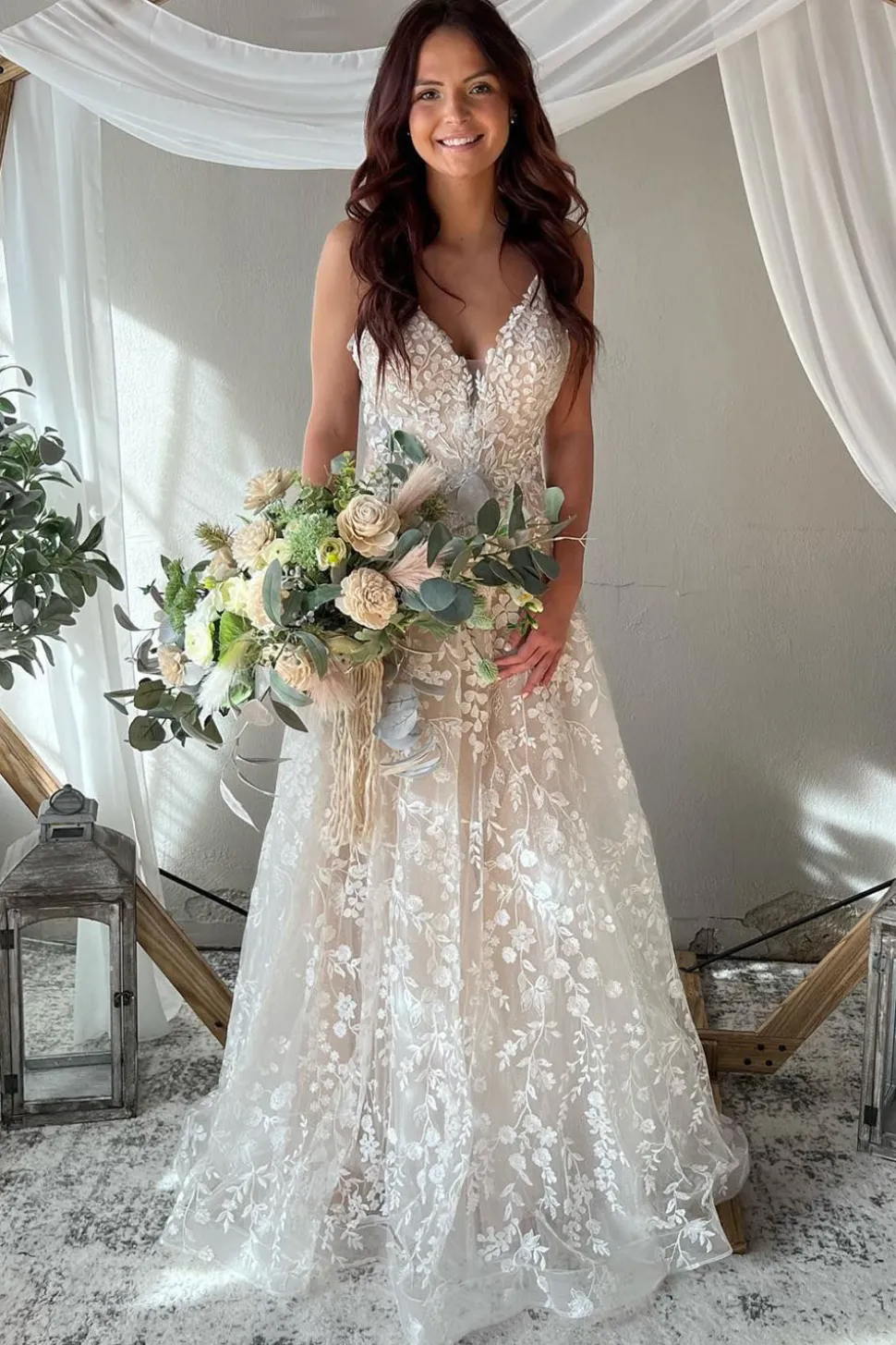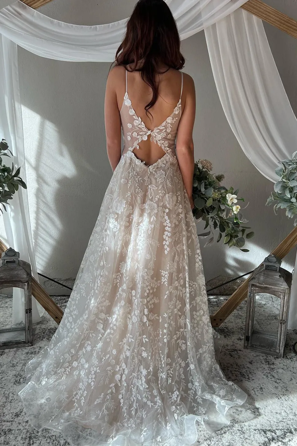 A-Line Ivory Spaghetti Straps Long Boho Wedding Dress with Appliques