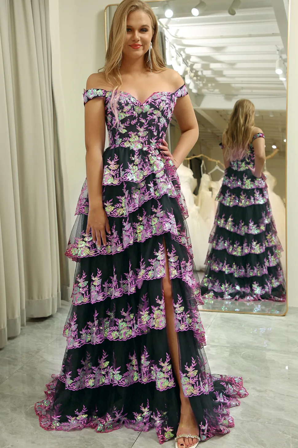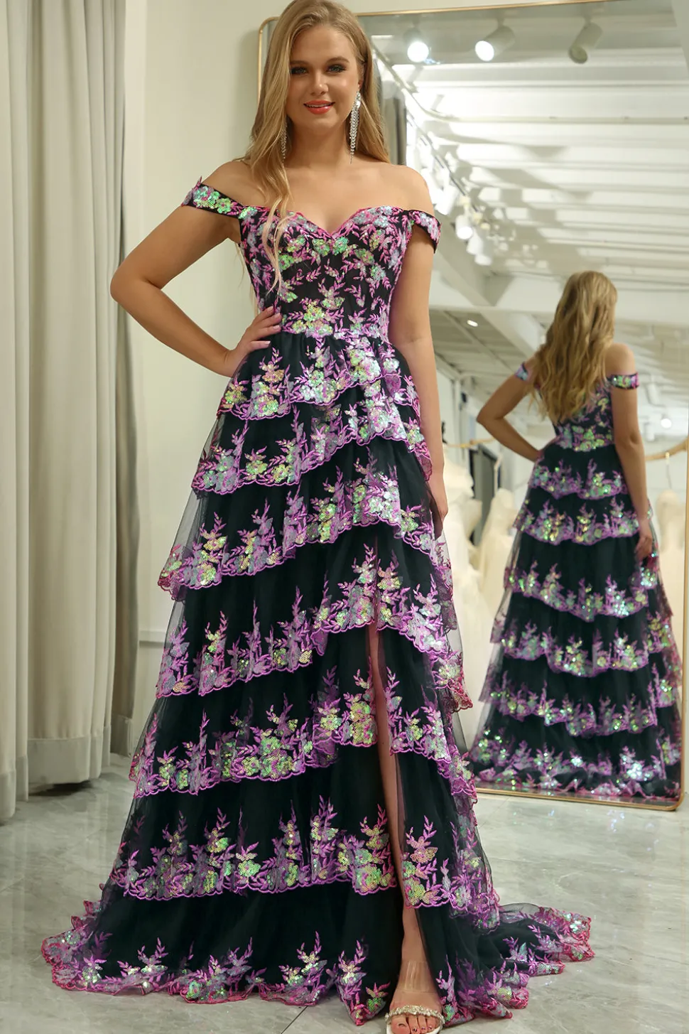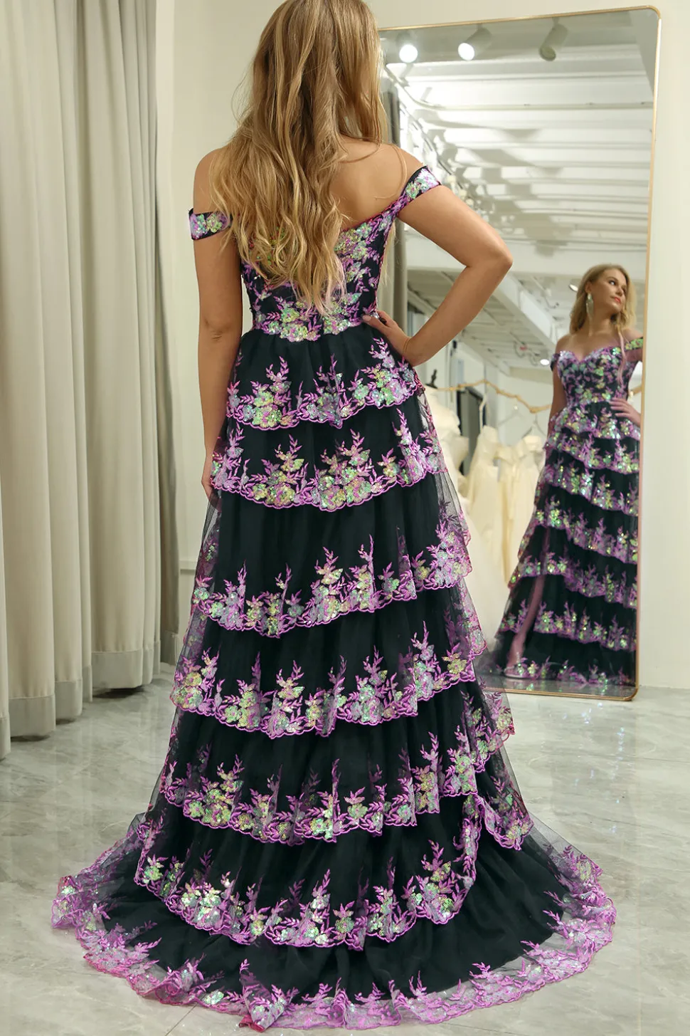 A-line Off the Shoulder Black Pink Tiered Corset Prom Dress with Split