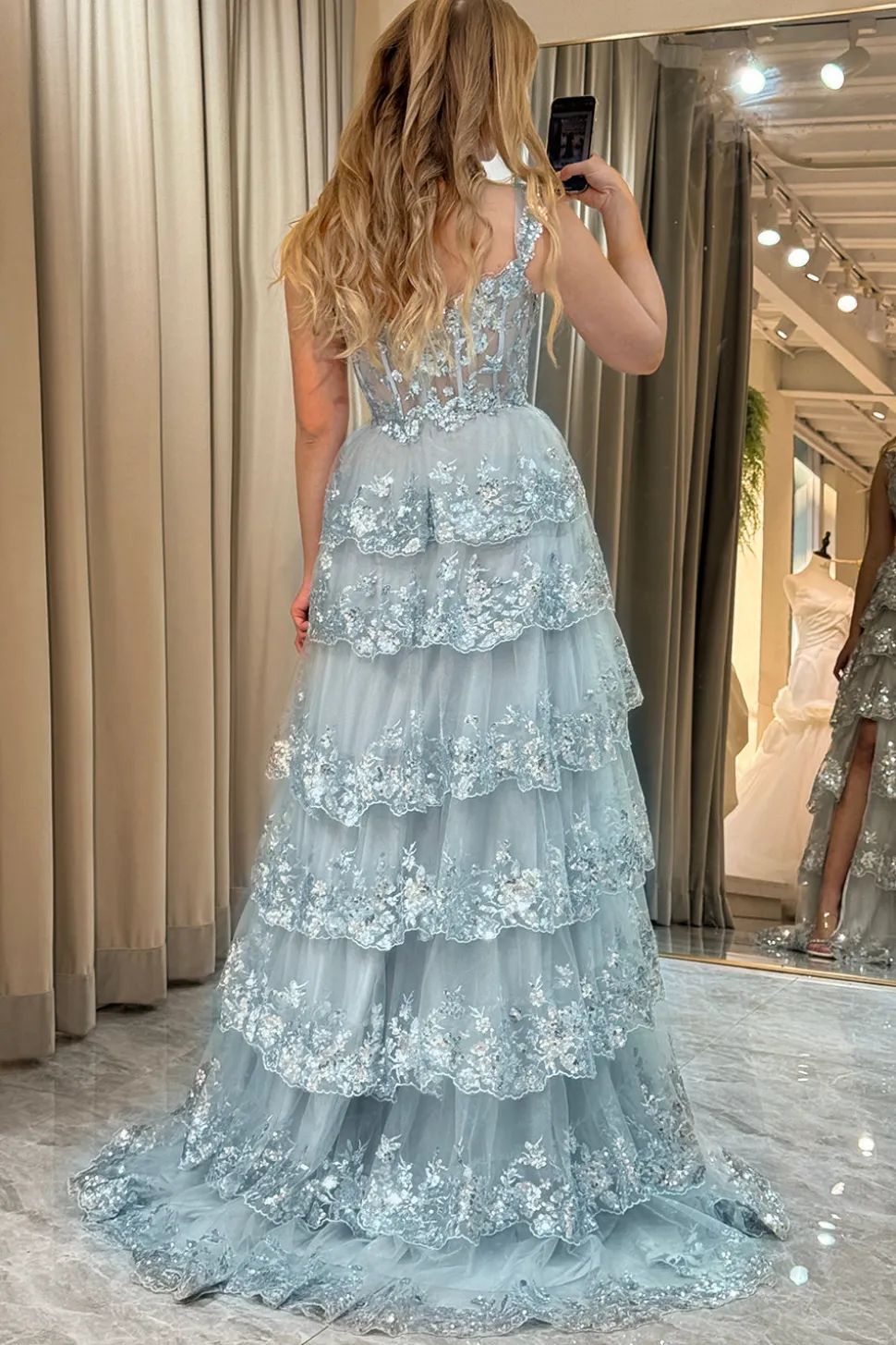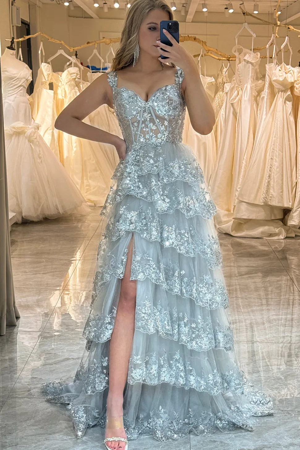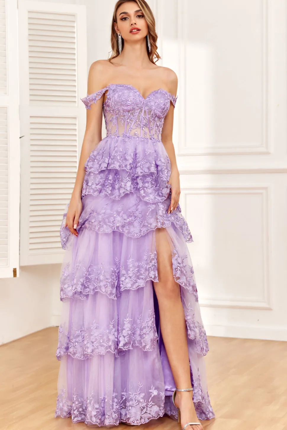 A-line  Off the Shoulder Silver Corset Prom Dress with Split