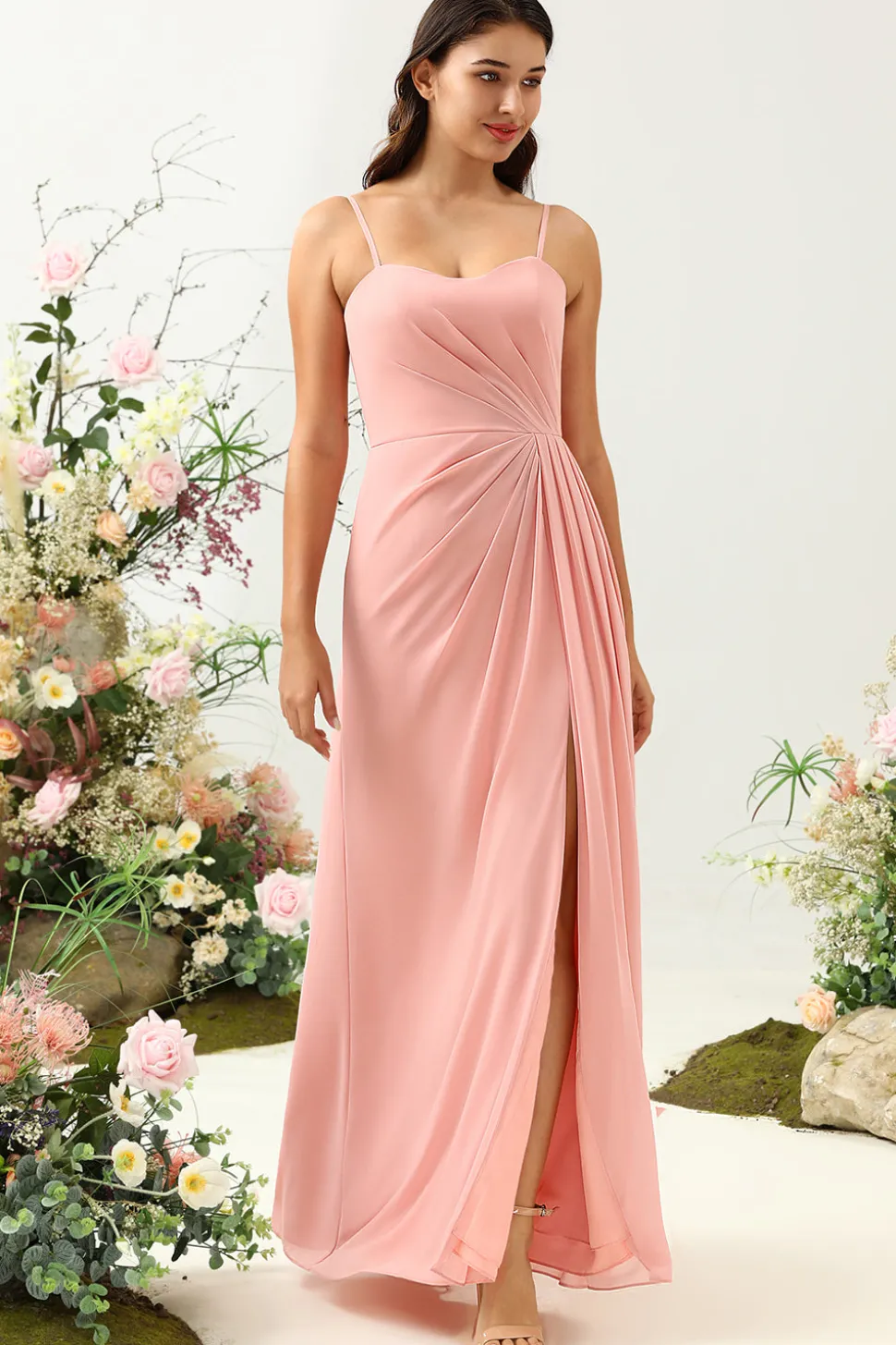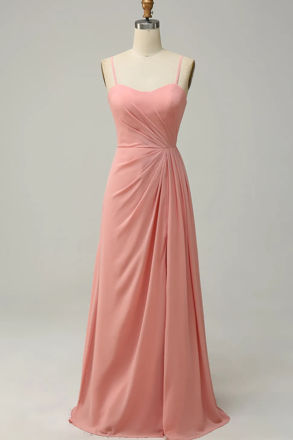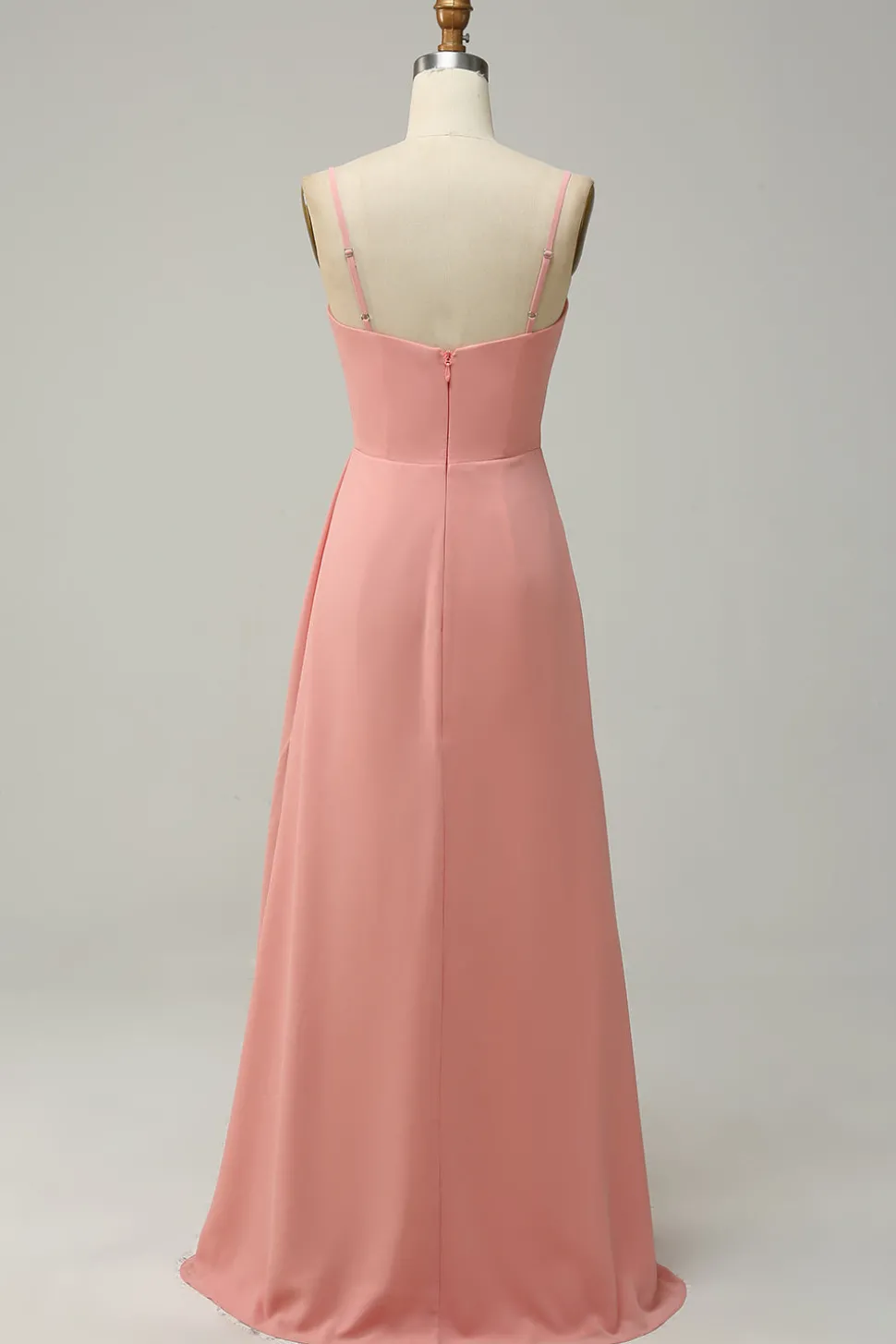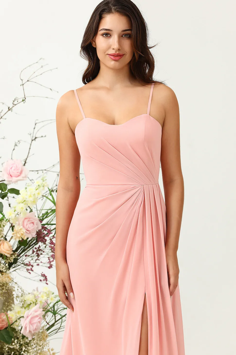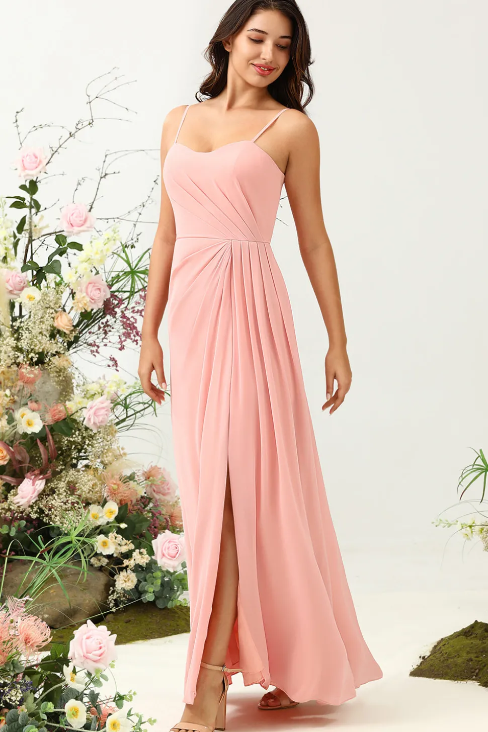 A Line Spaghetti Straps Blush Long Bridesmaid Dress with Split Front