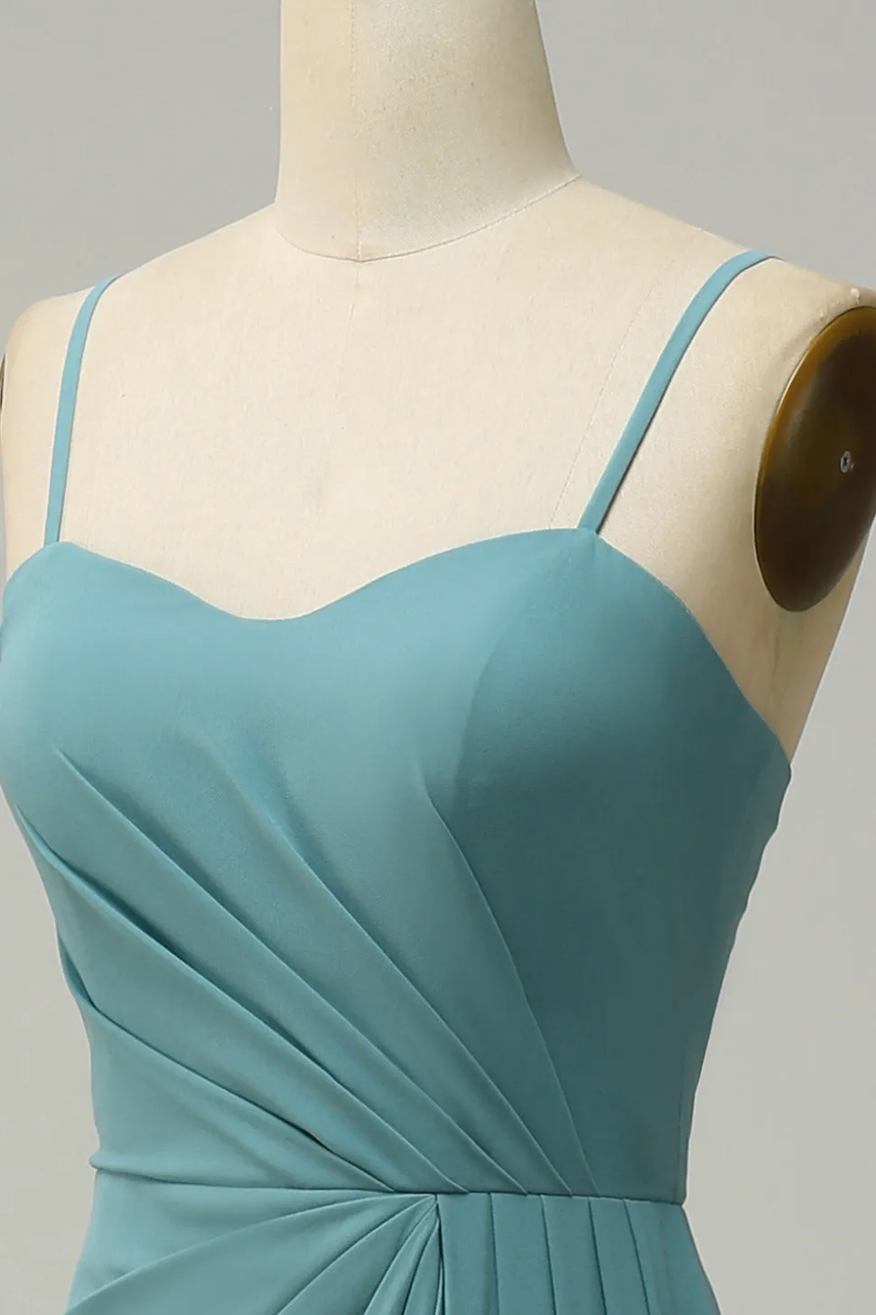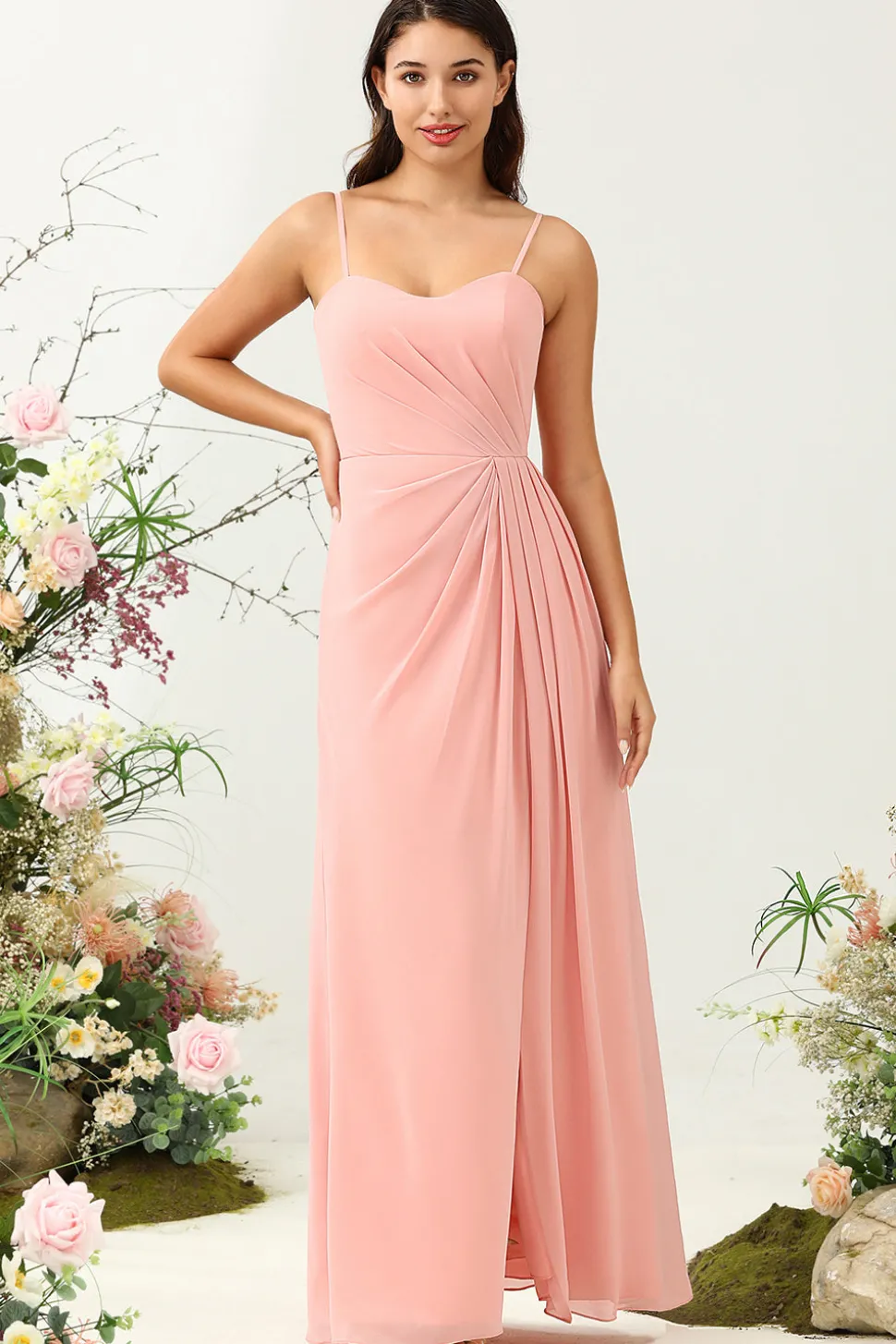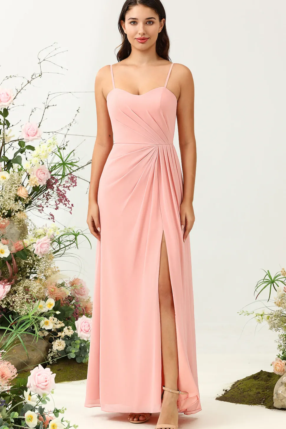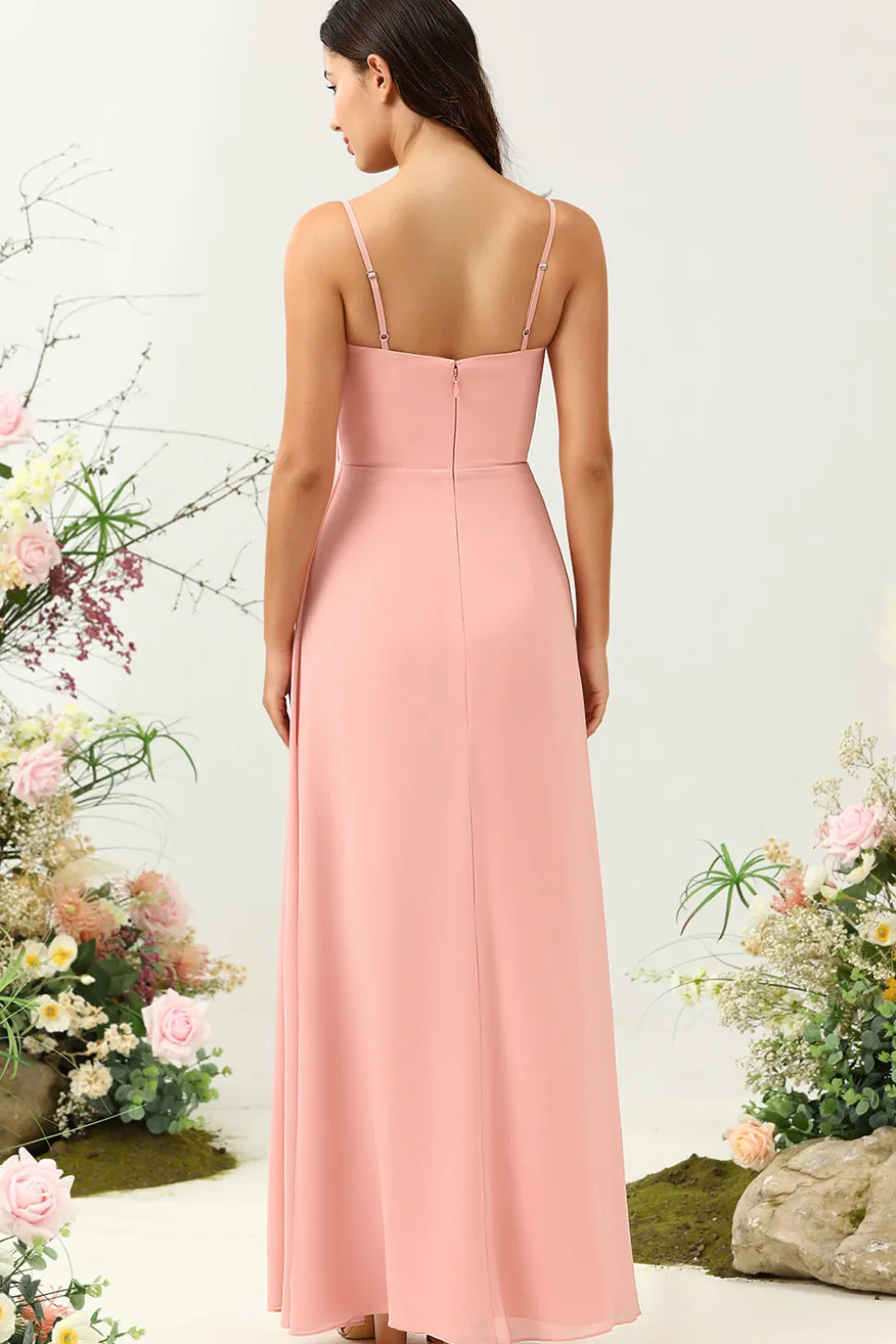 A Line Spaghetti Straps Blush Long Bridesmaid Dress with Split Front
