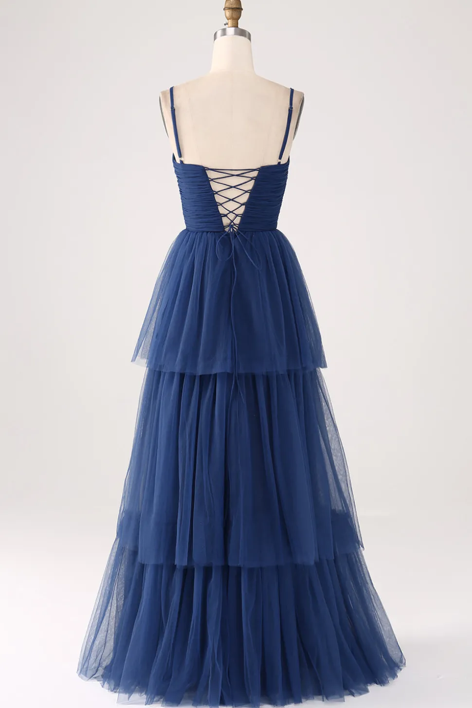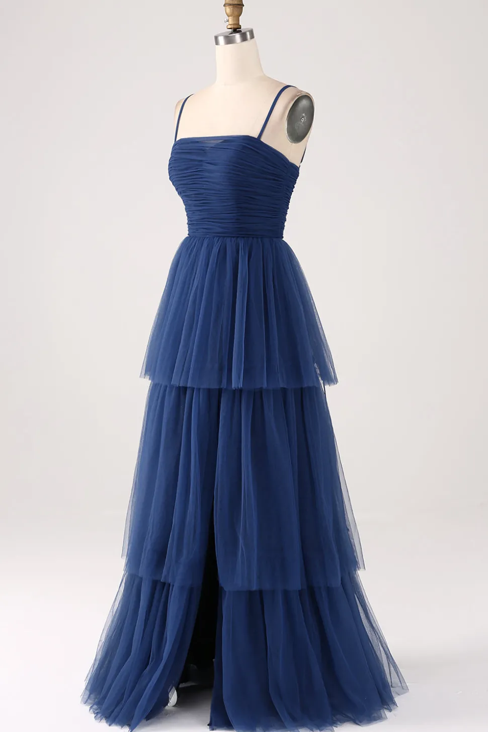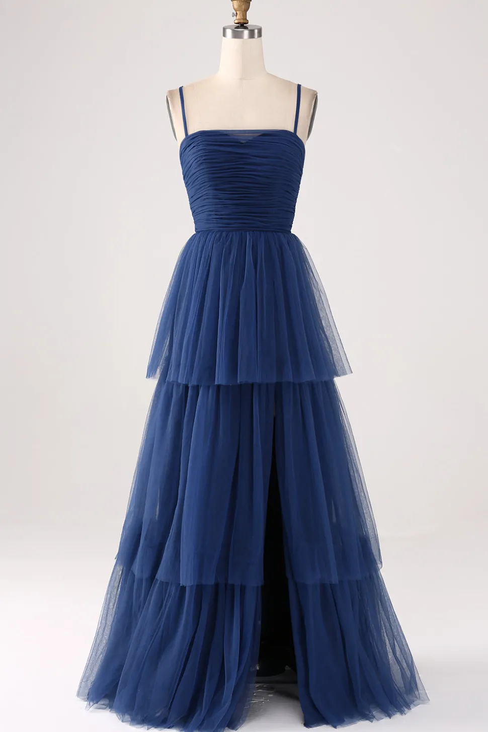 A Line Spaghetti Straps Tiered Tulle Pleated Prom Dress with Slit