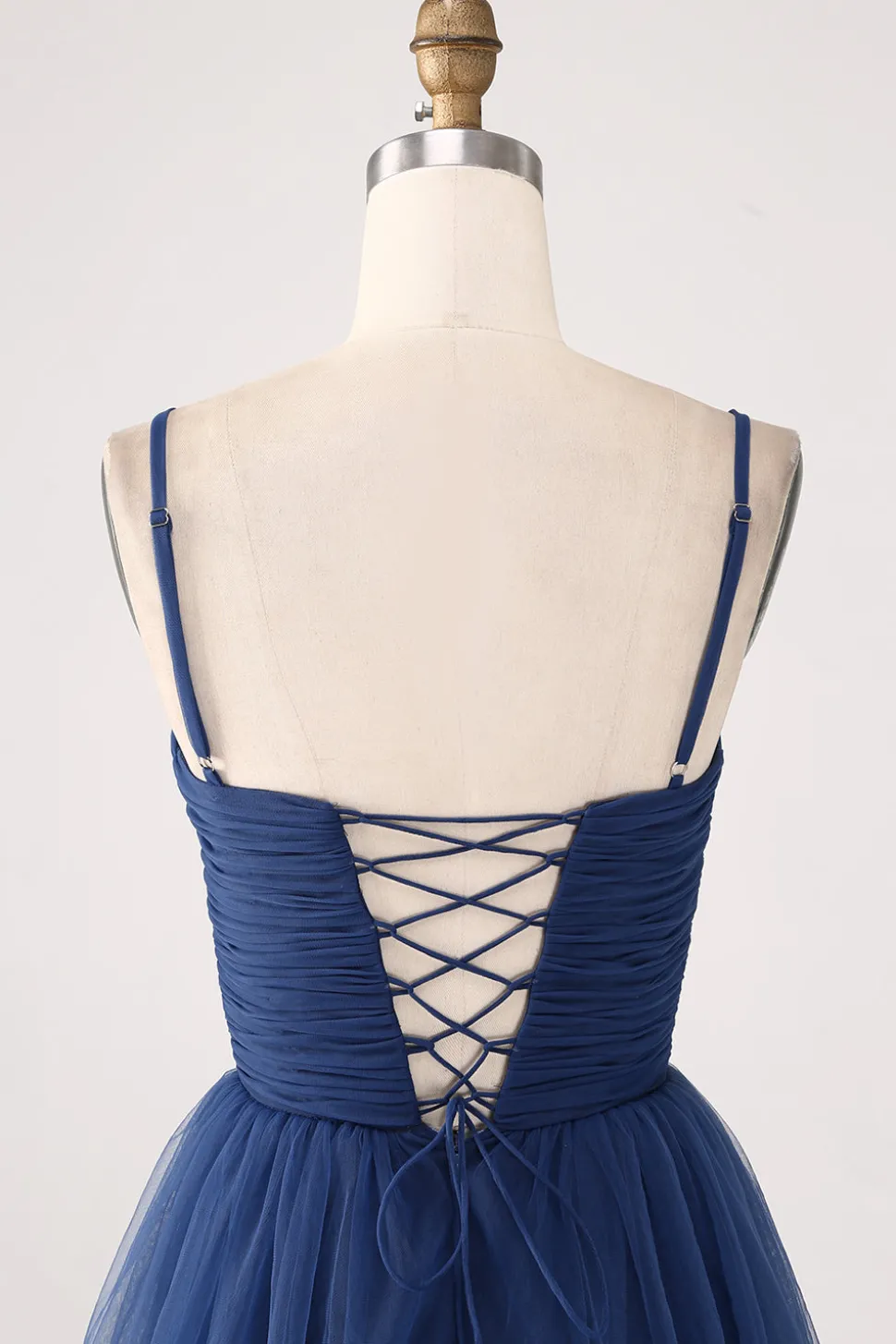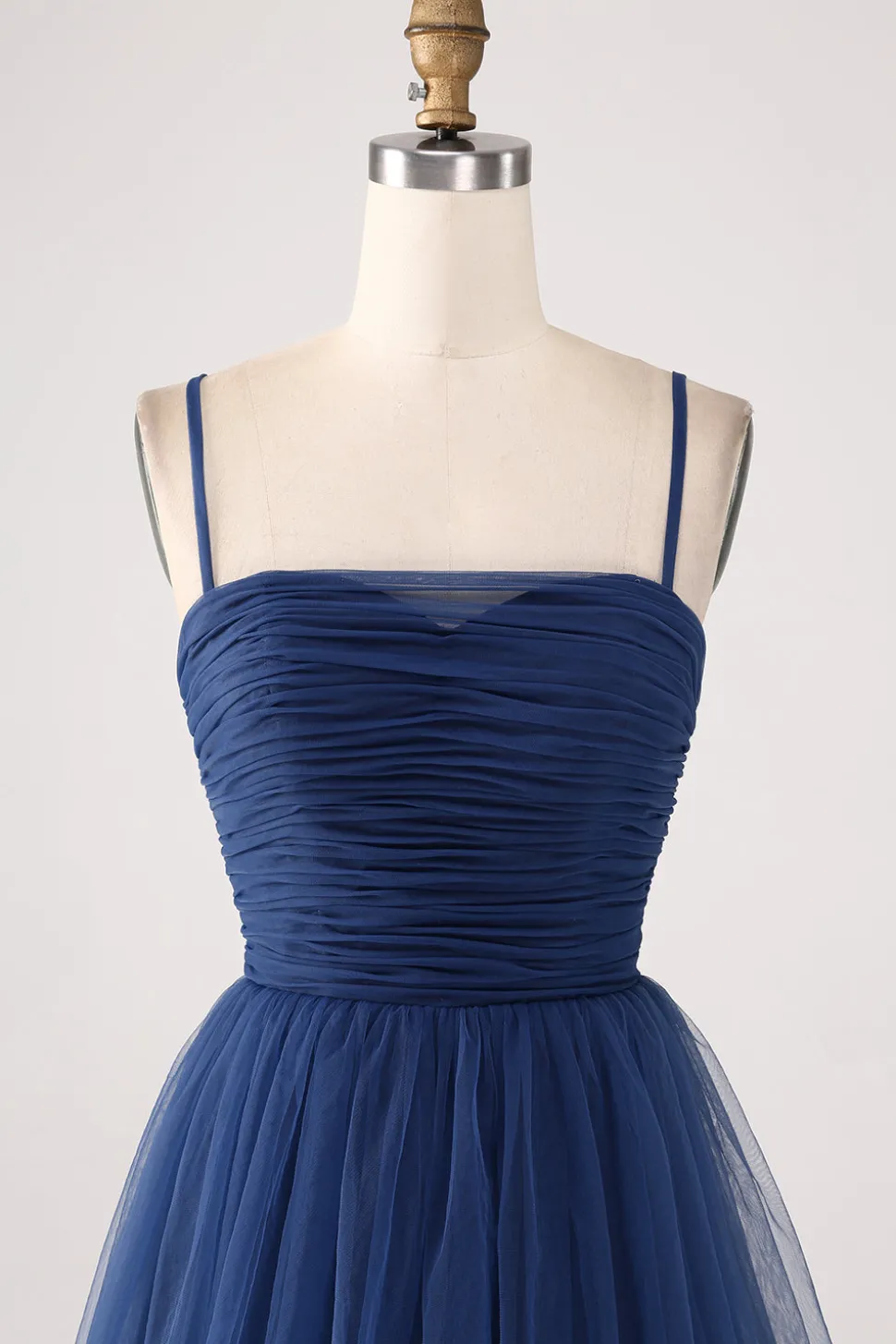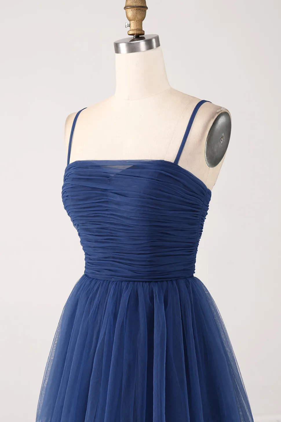 A Line Spaghetti Straps Tiered Tulle Pleated Prom Dress with Slit