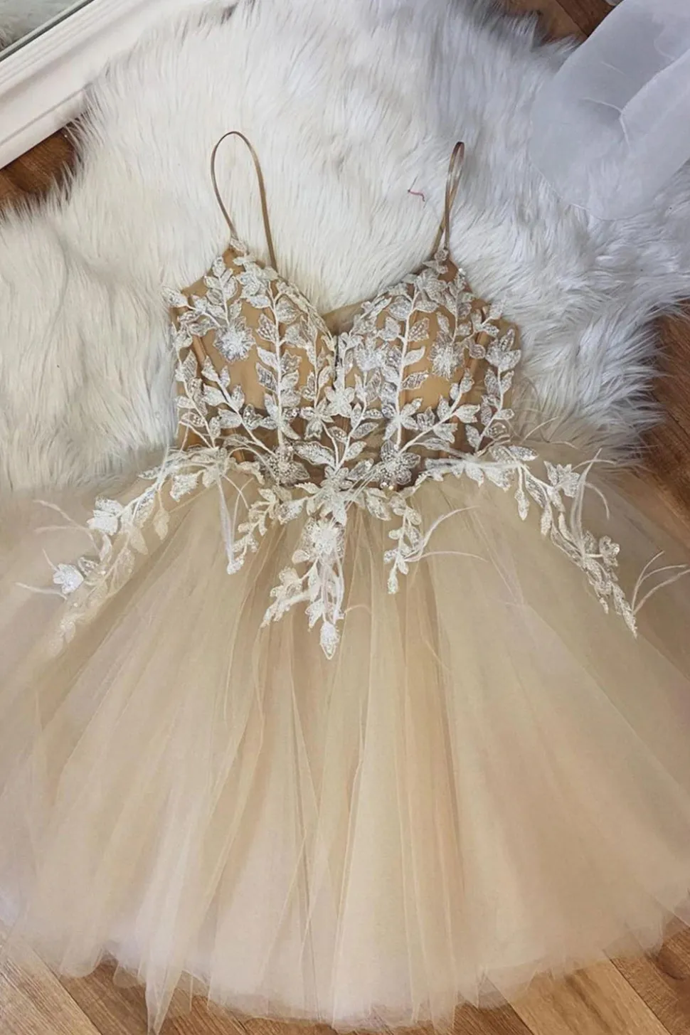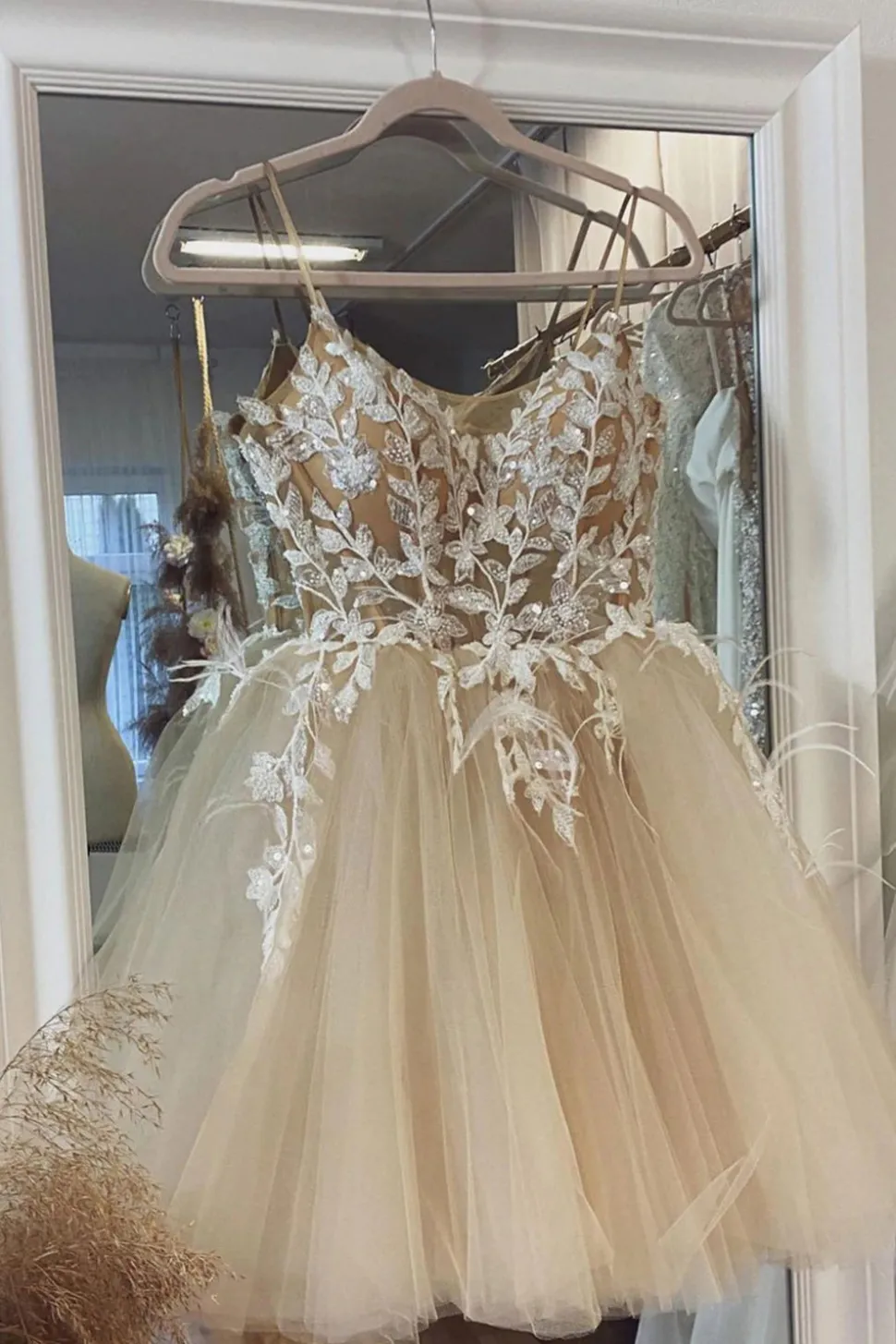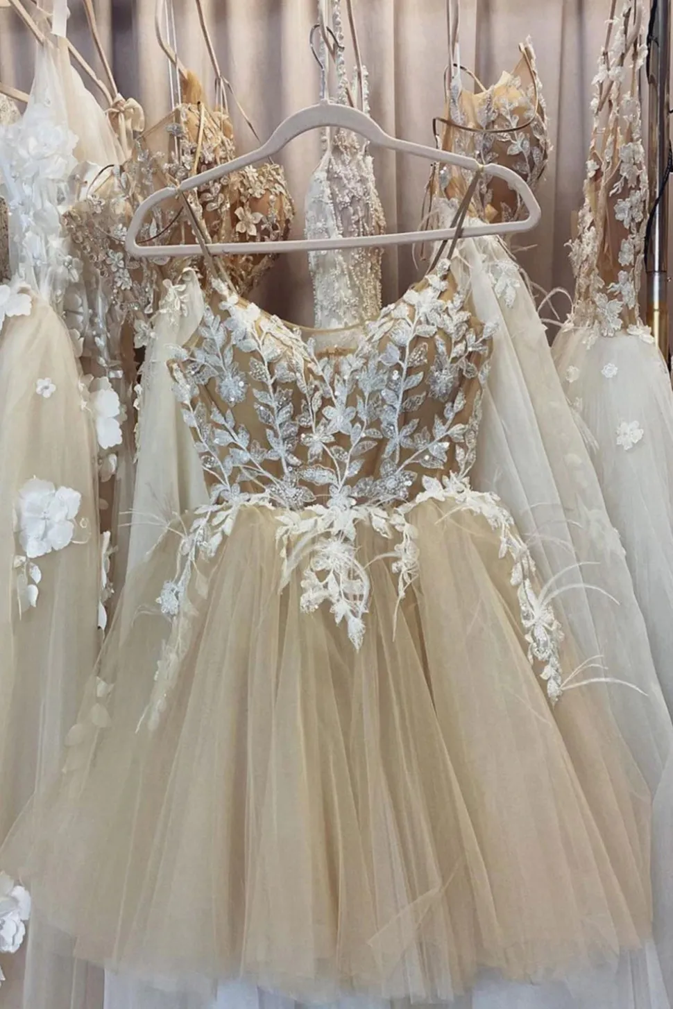 Beige Spaghetti Straps Short Prom Dress With Appliques