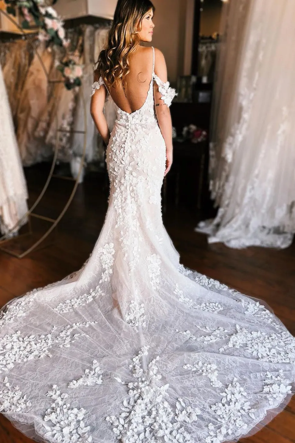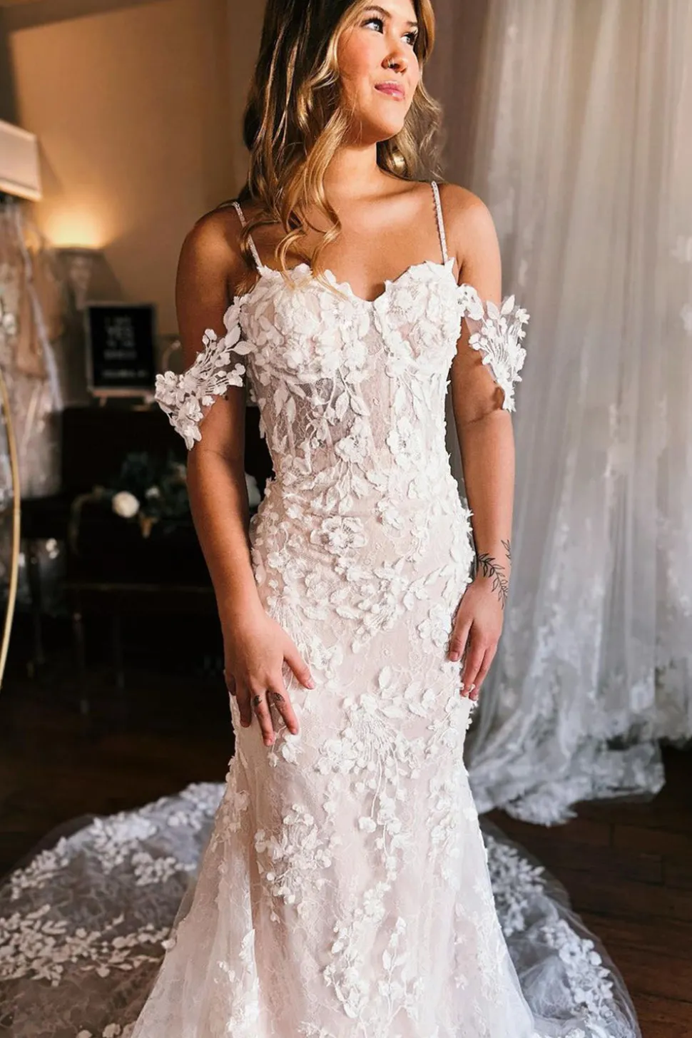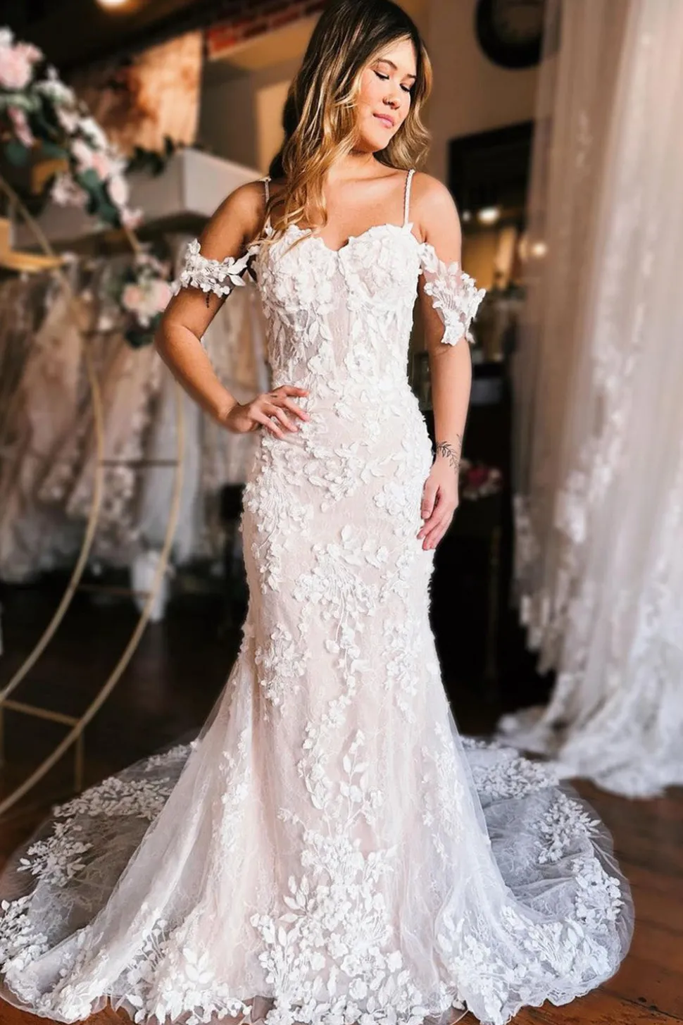 Champagne Cold Shoulder Long Train Mermaid Wedding Dress with Appliques