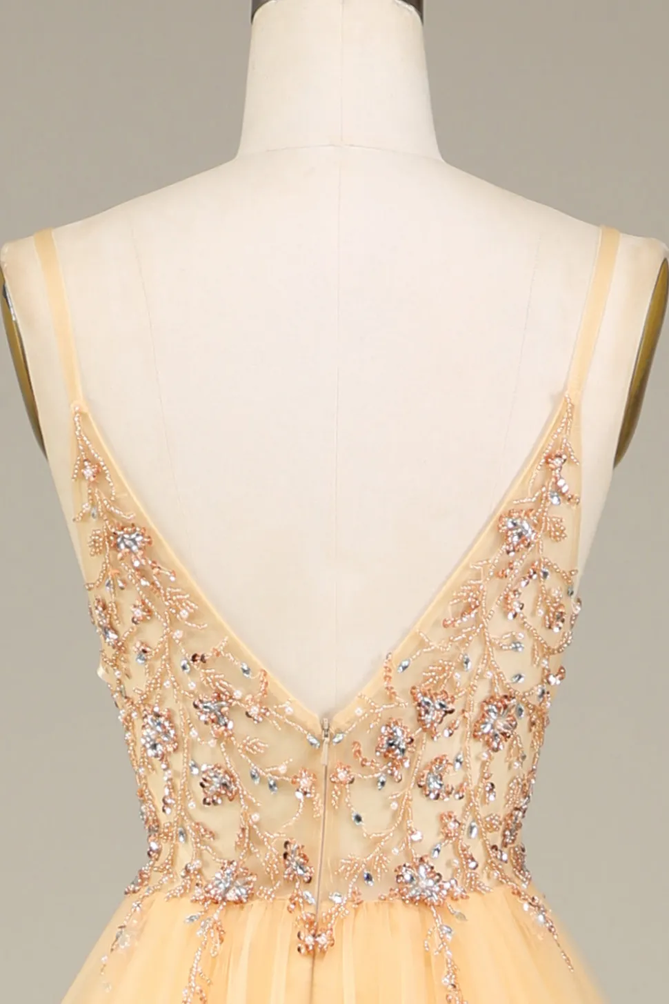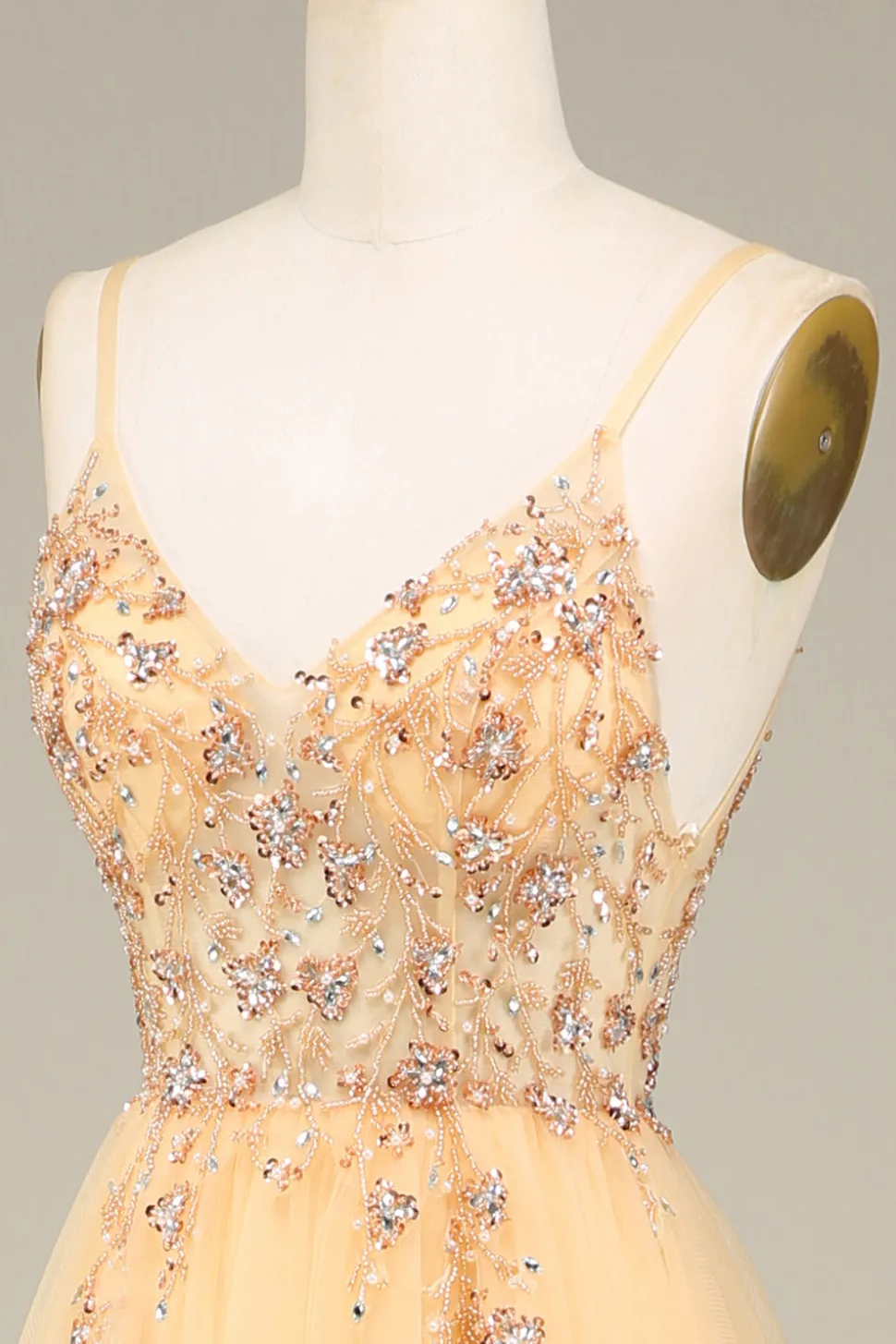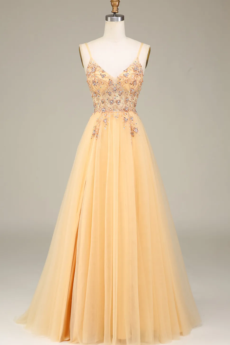 Charming A Line Spaghetti Straps Golden Long Prom Dress with Beading