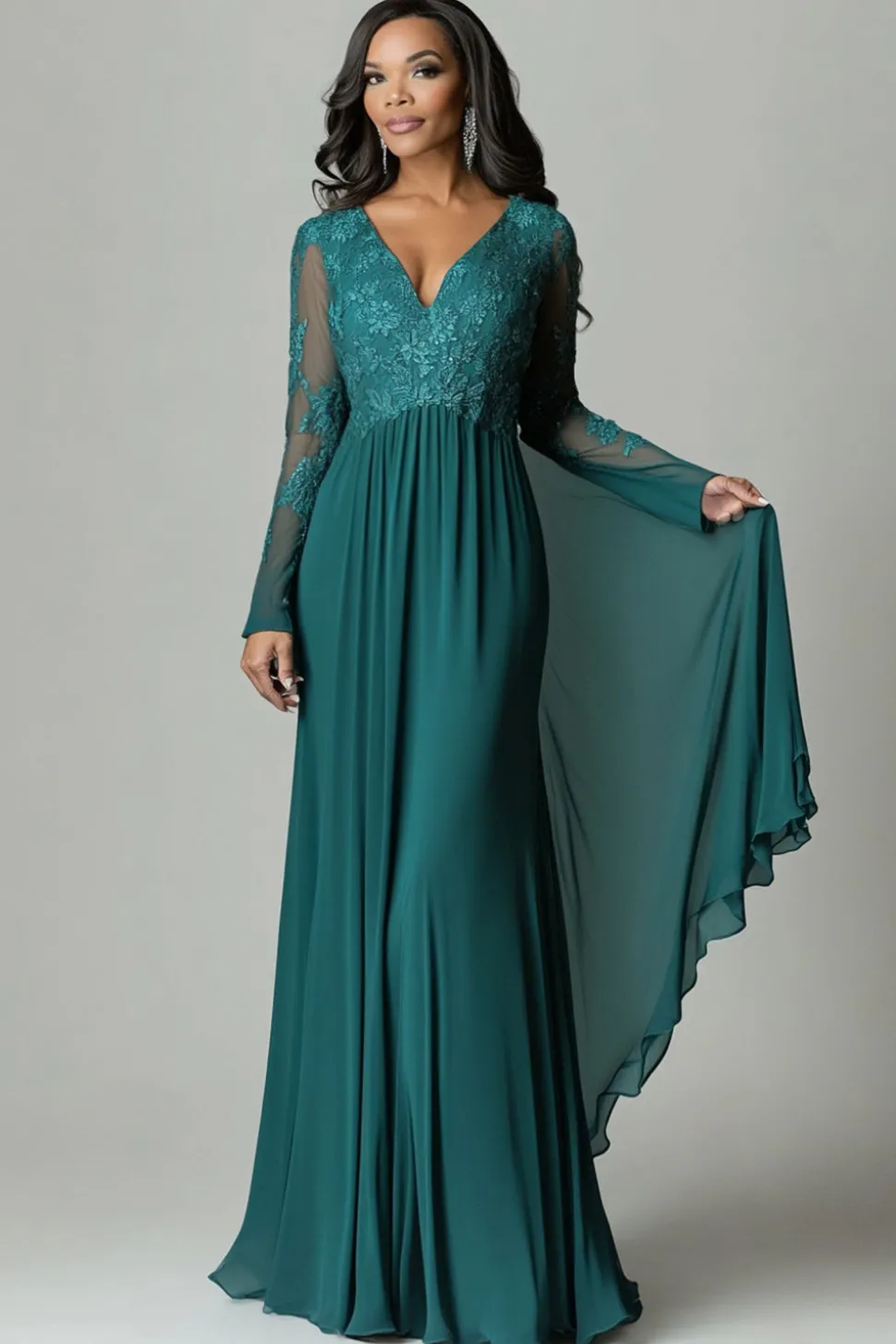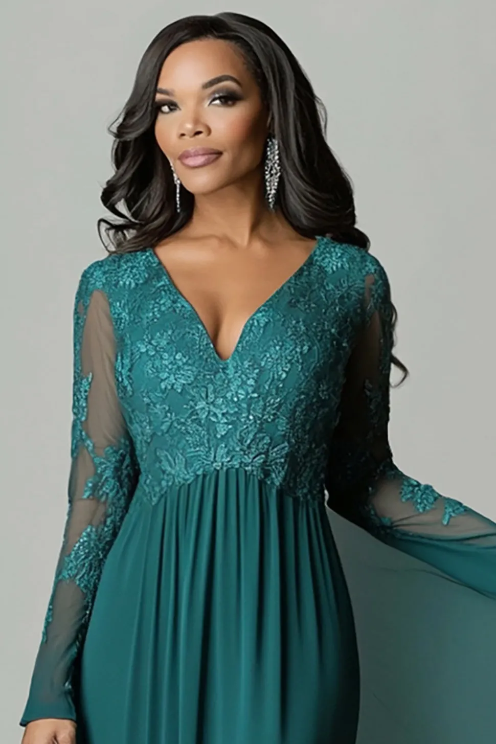 Dark Green Appliques Flare Sleeves V Neck Pleated Sheath Mother of The Bride Dress