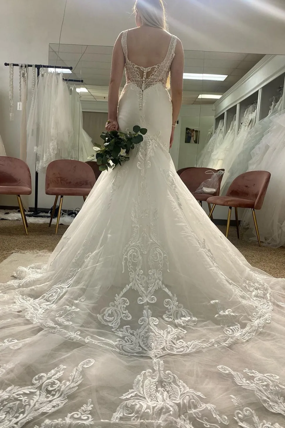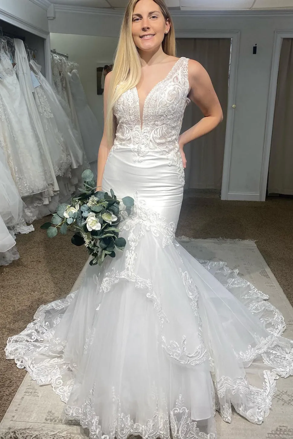 Deep V-Neck Mermaid White Long Wedding Dress with Lace