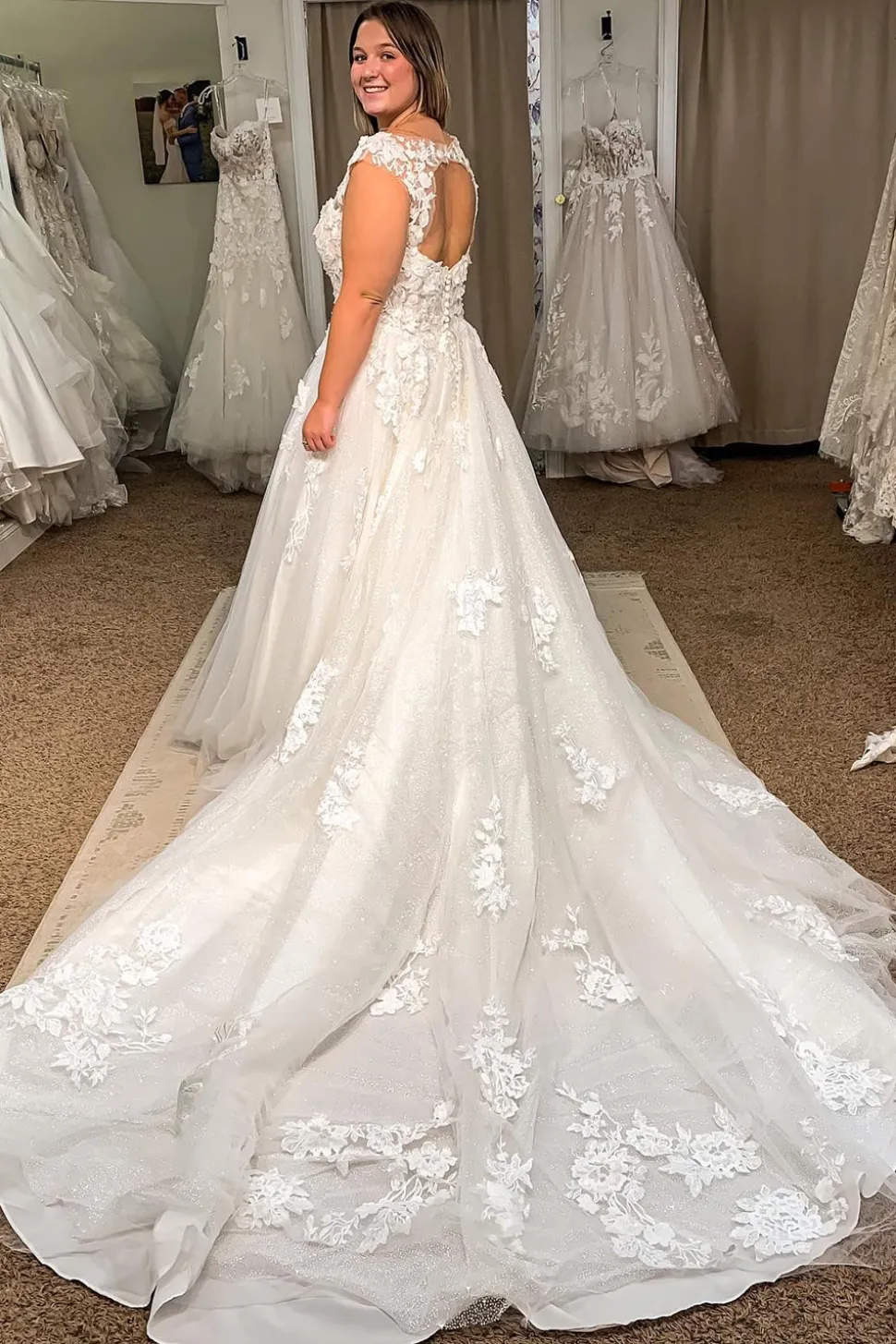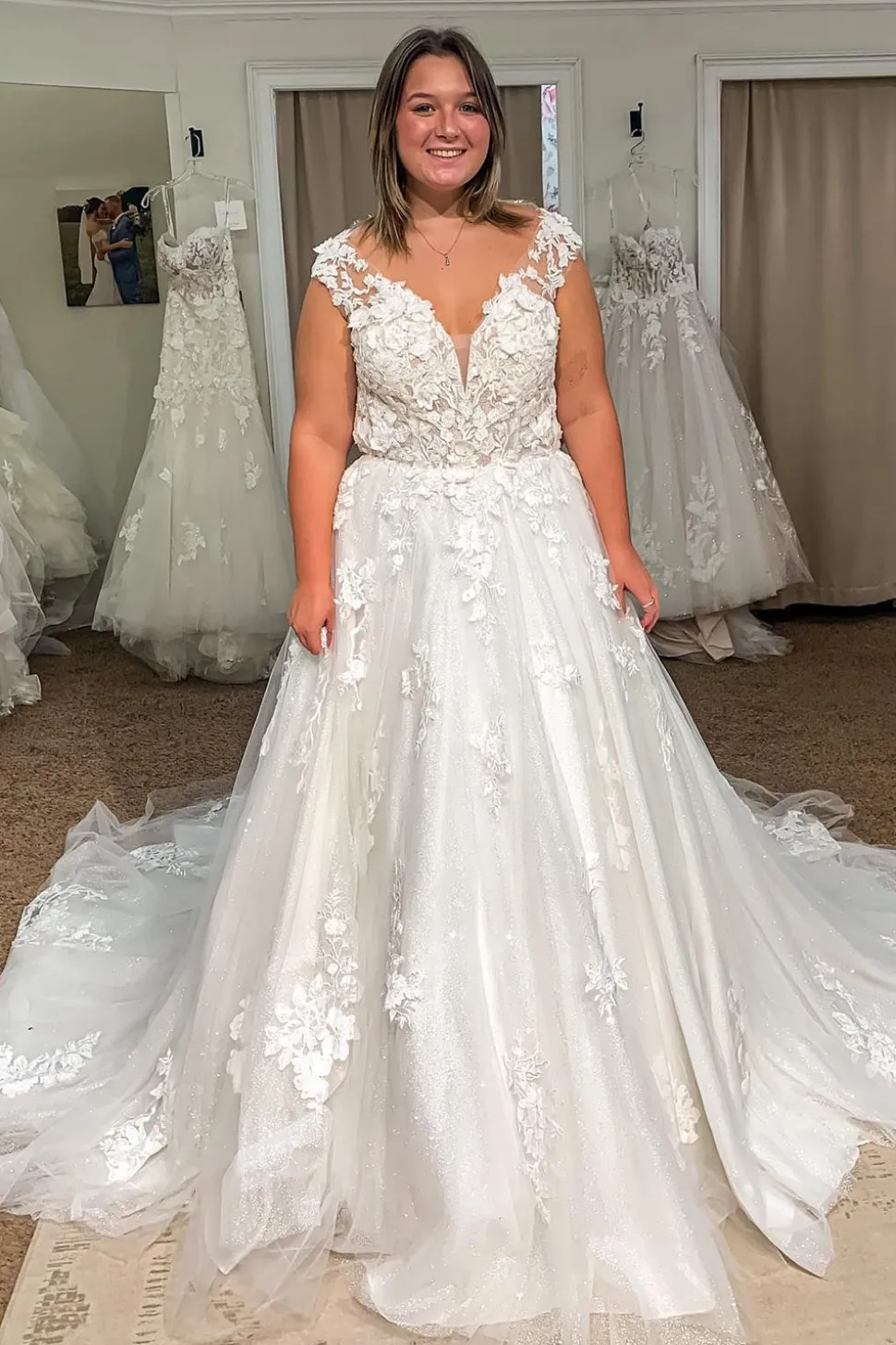 Glitter Ivory Long Tulle Plus Size Wedding Dress with Lace