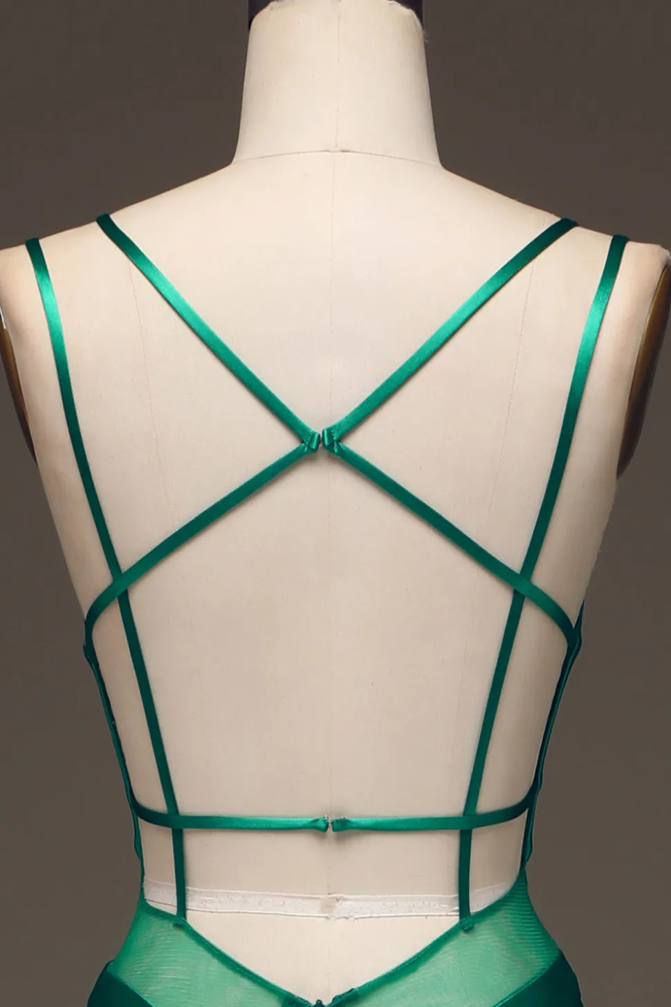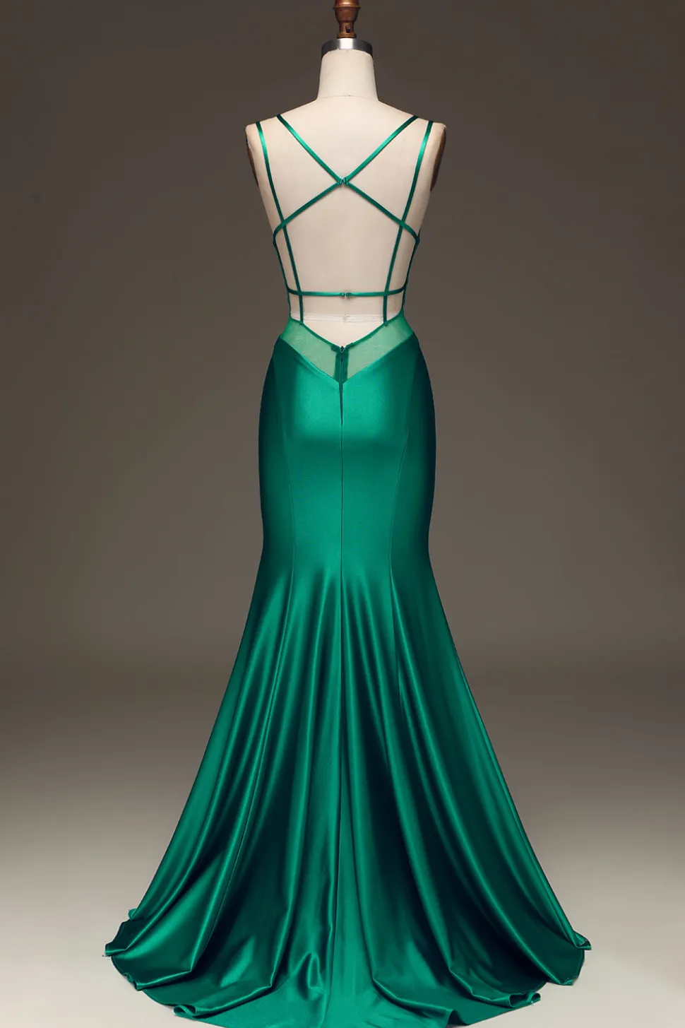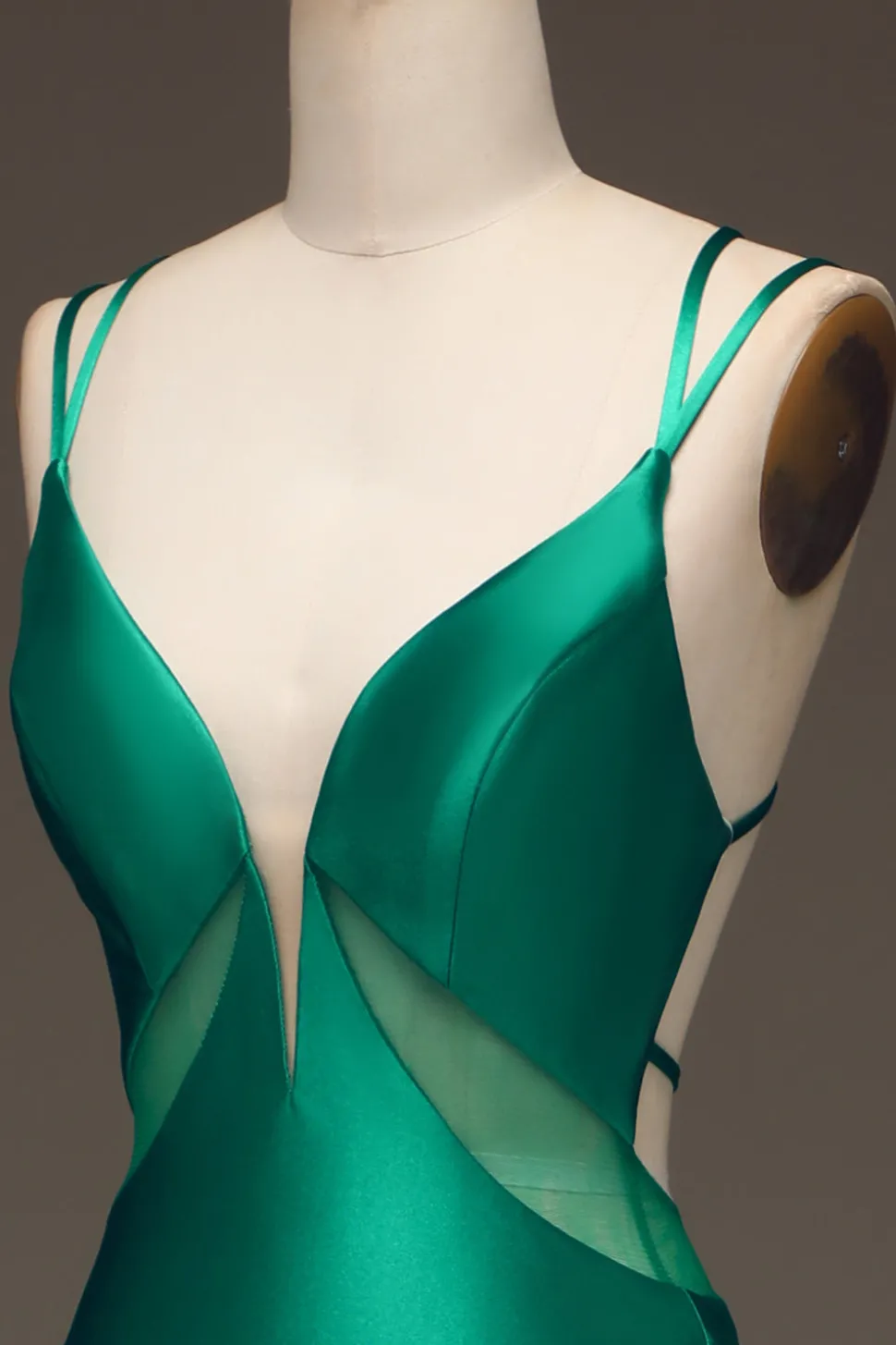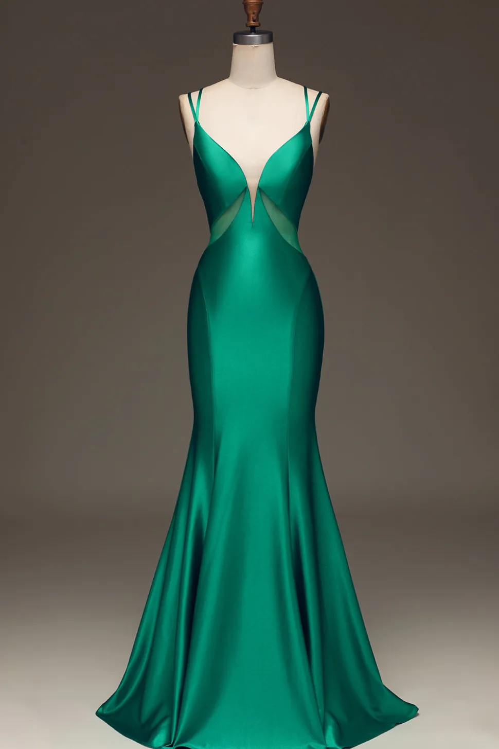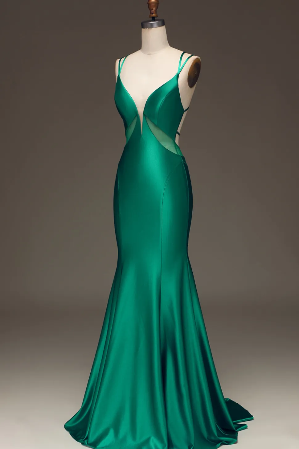 Green Deep V-neck Satin Mermaid Prom Dress with Lace-up Back