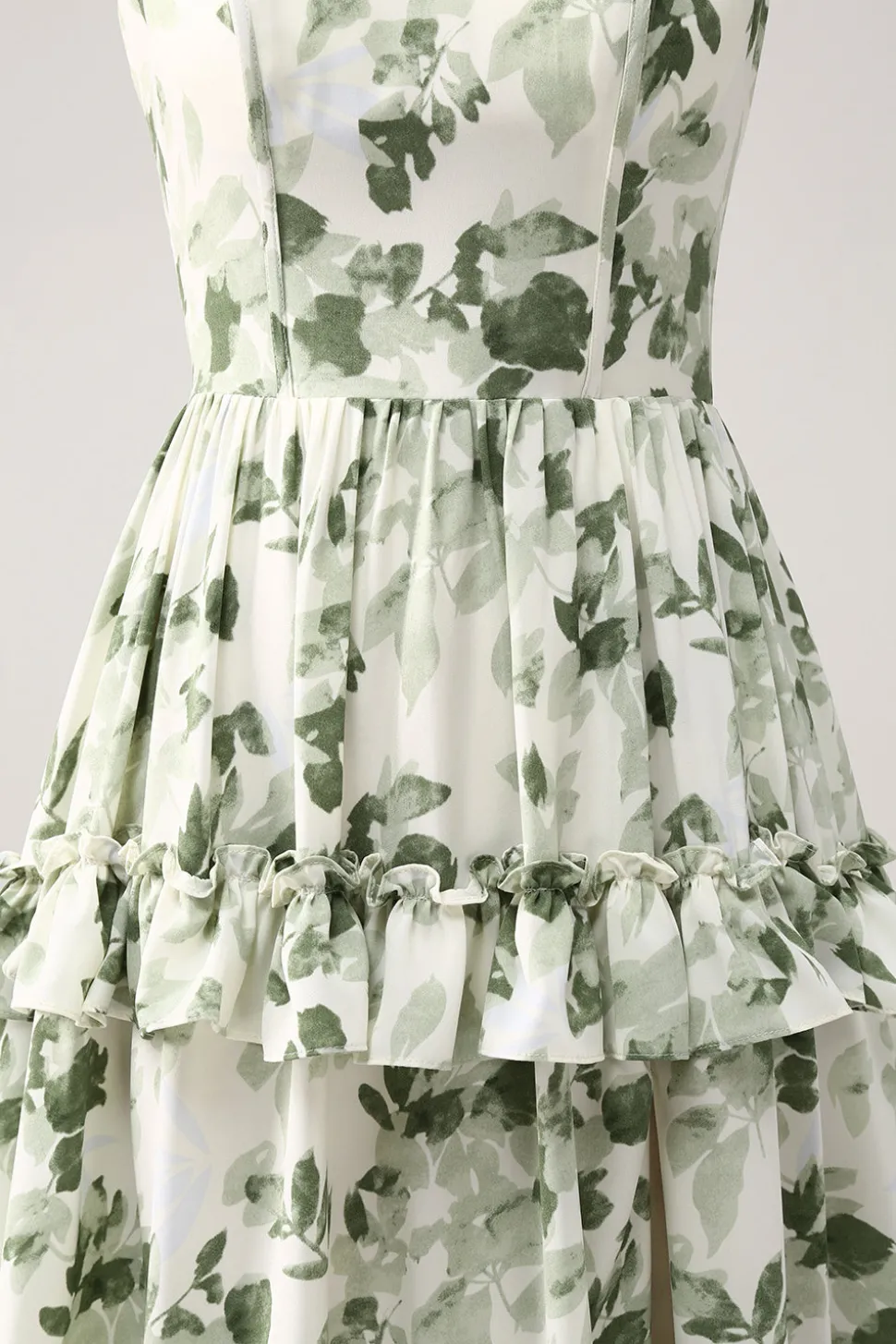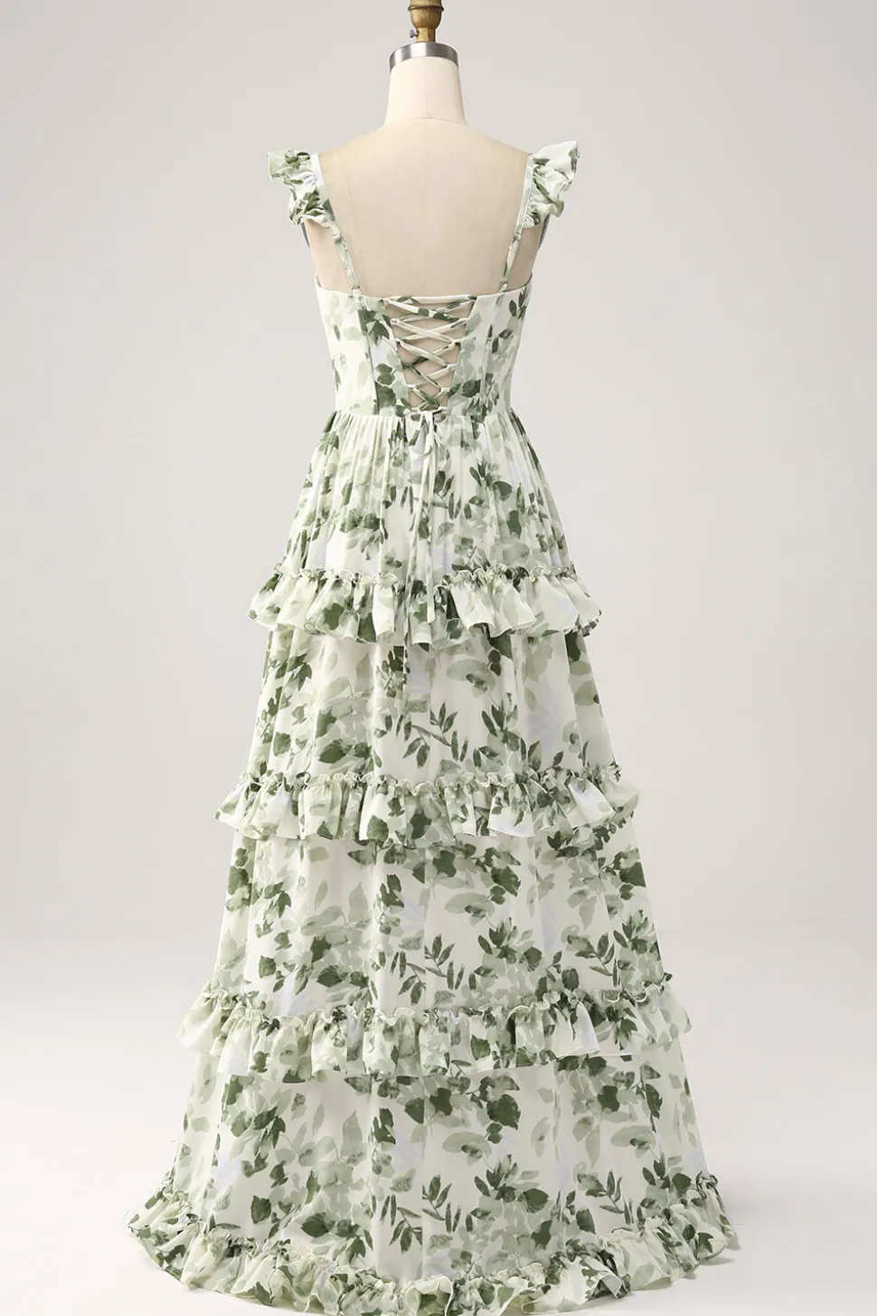 Green Floral Ruffles Tiered Prom Dress with Slit
