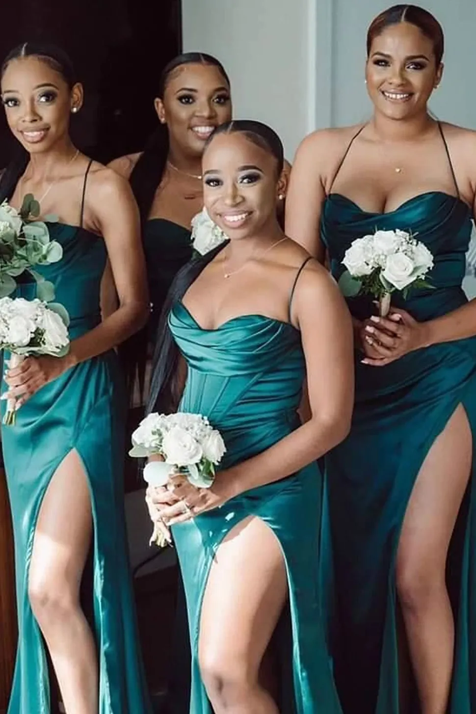 Green Satin Spaghetti Straps Corset Long Bridesmaid Dress with Side Slit