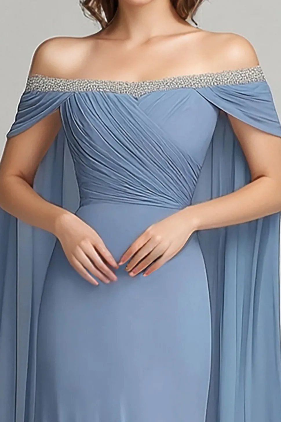 Grey Blue Chiffon Off the Shoulder Side Cape Mother of the Bride Dress