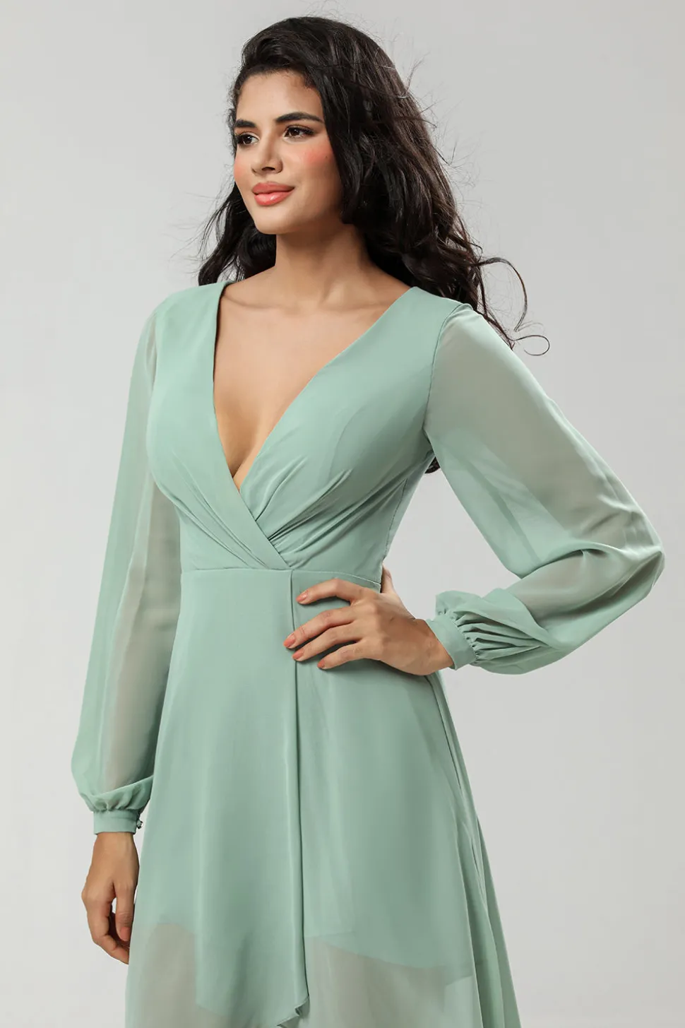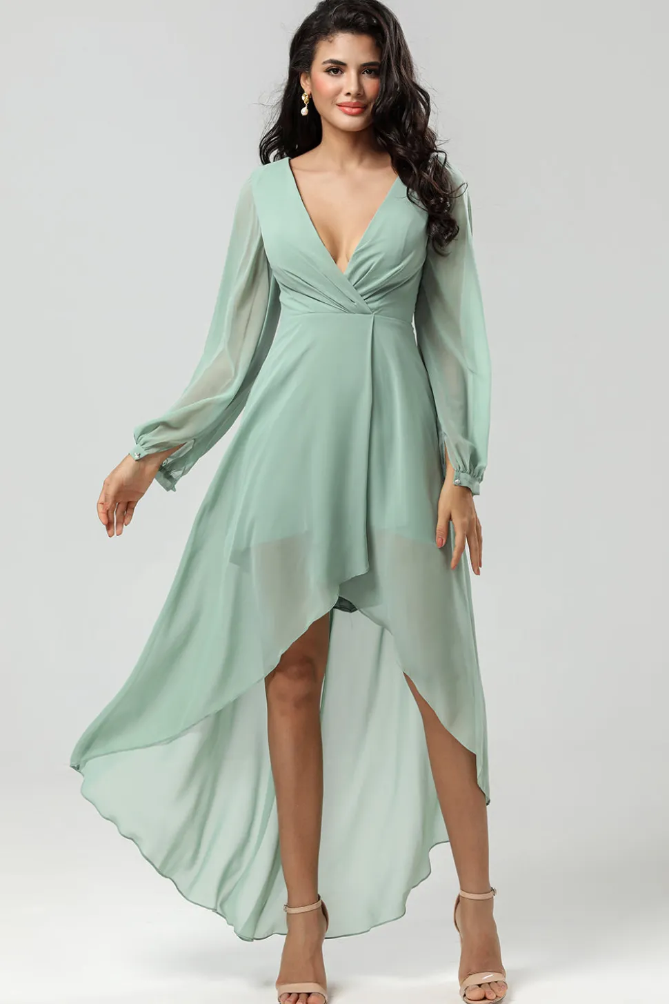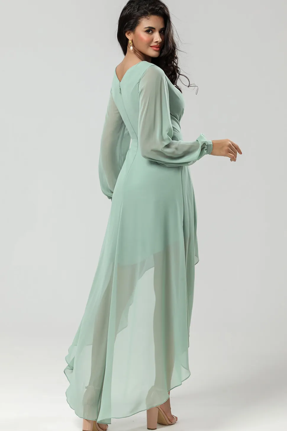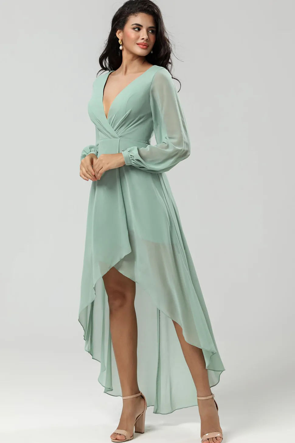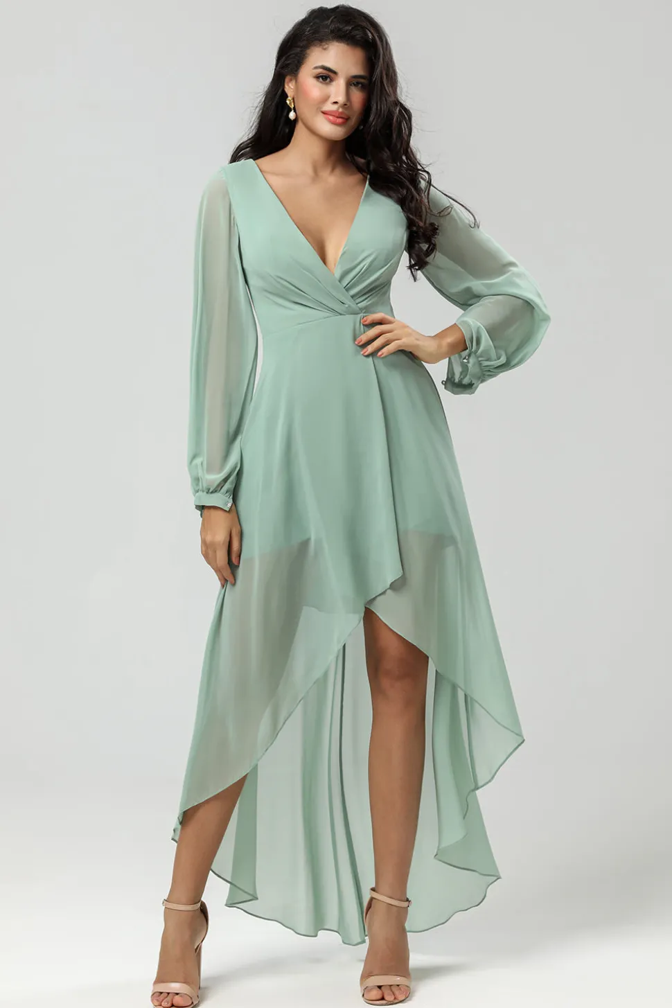 High-low Chiffon A Line Green Bridesmaid Dress with Long Sleeves