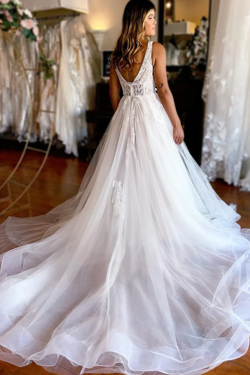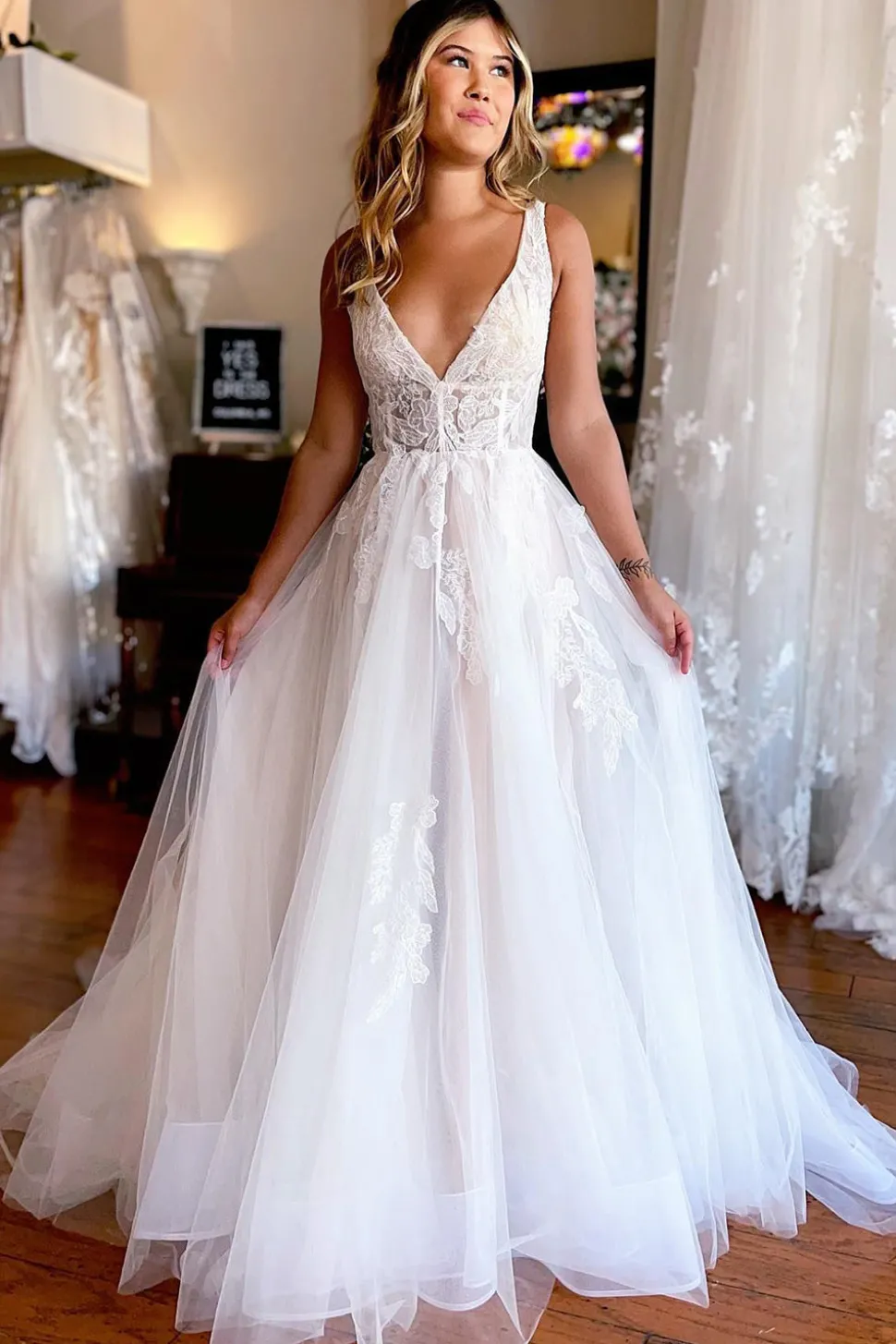 Ivory A-Line Deep V-Neck Backless Long Wedding Dress with Lace