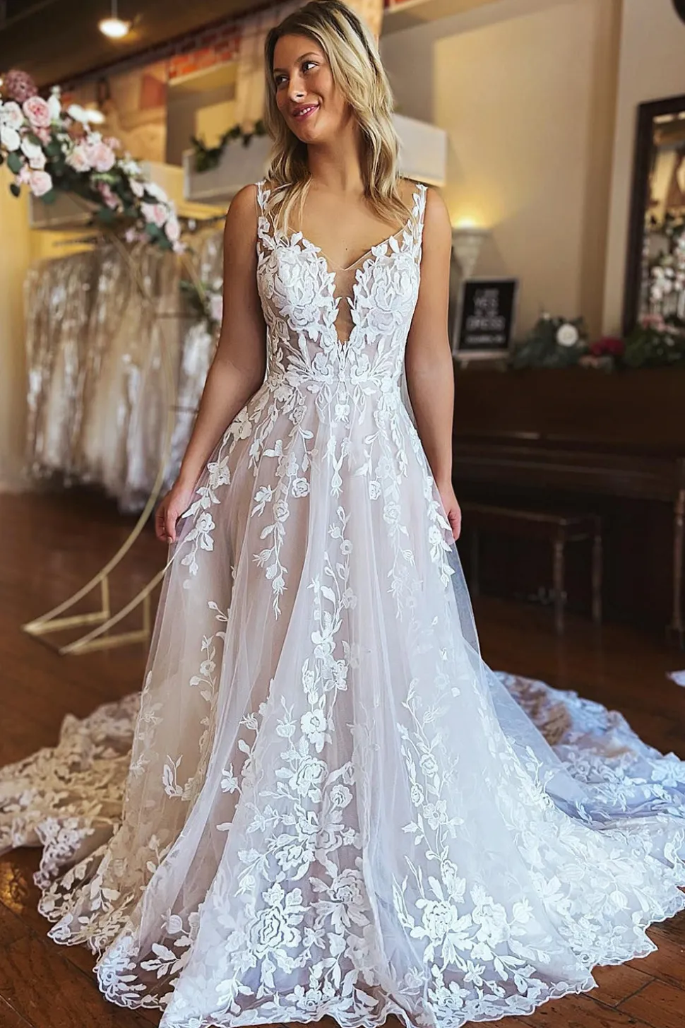 Ivory A-Line V-Neck Backless Long Lace Wedding Dress