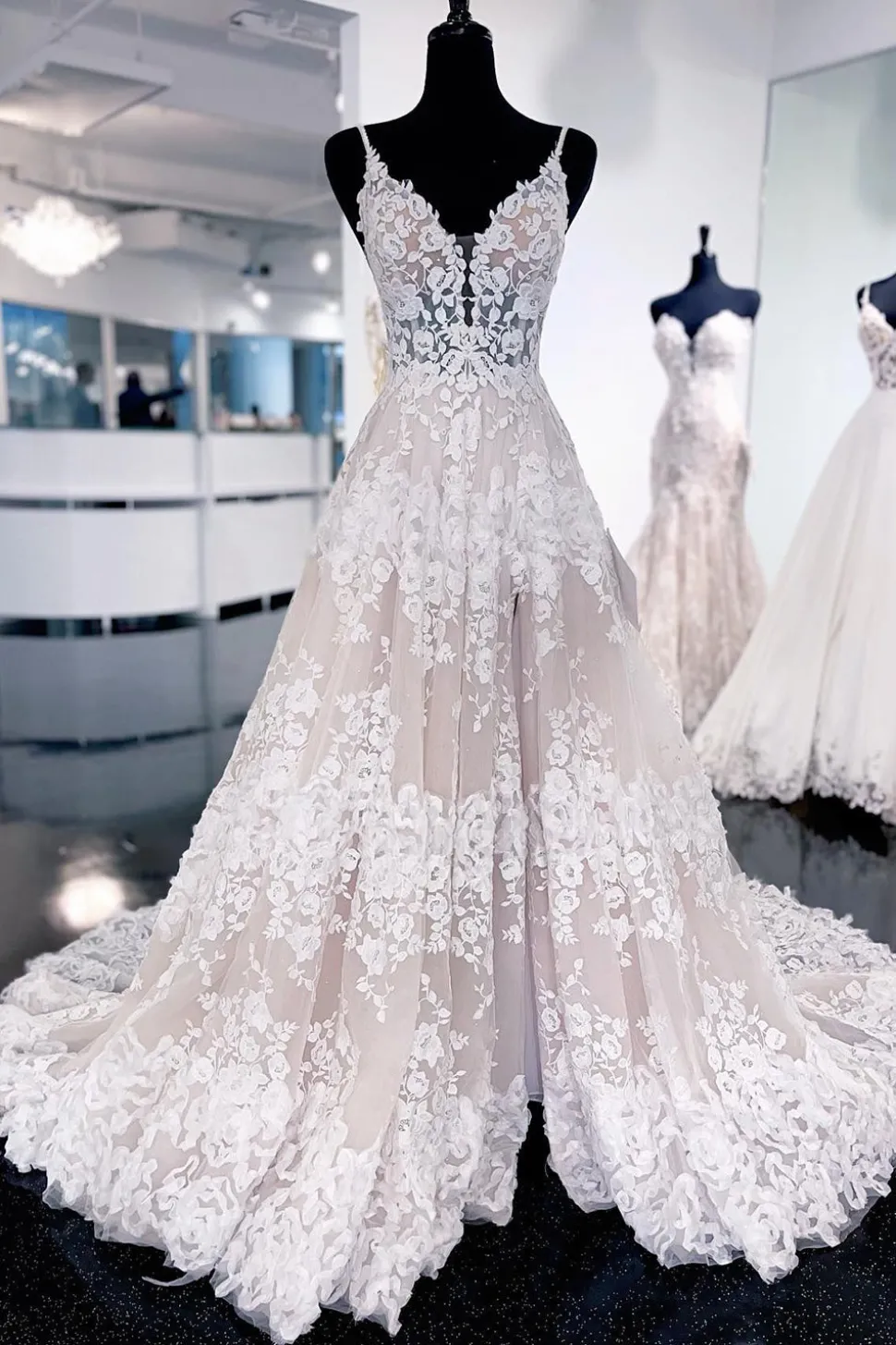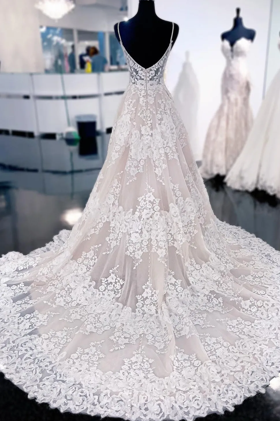 Ivory Lace A-Line Sweep Train Long Wedding Dress