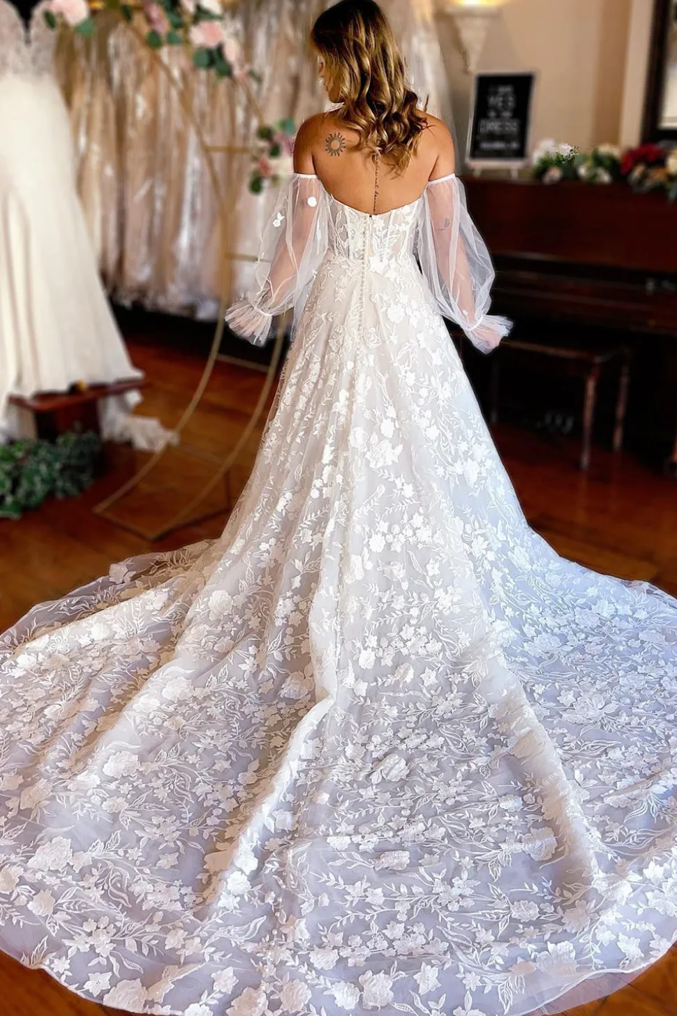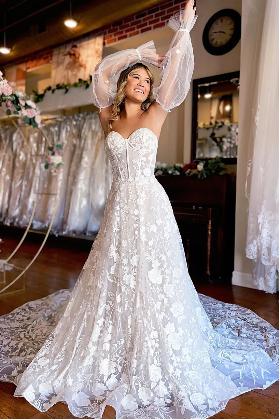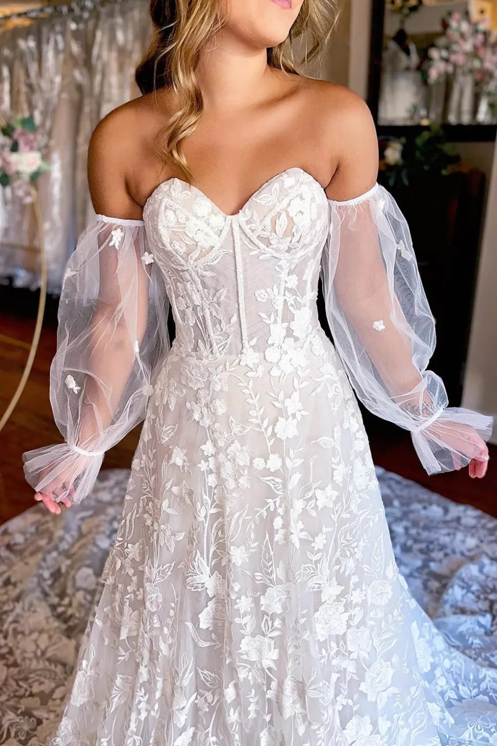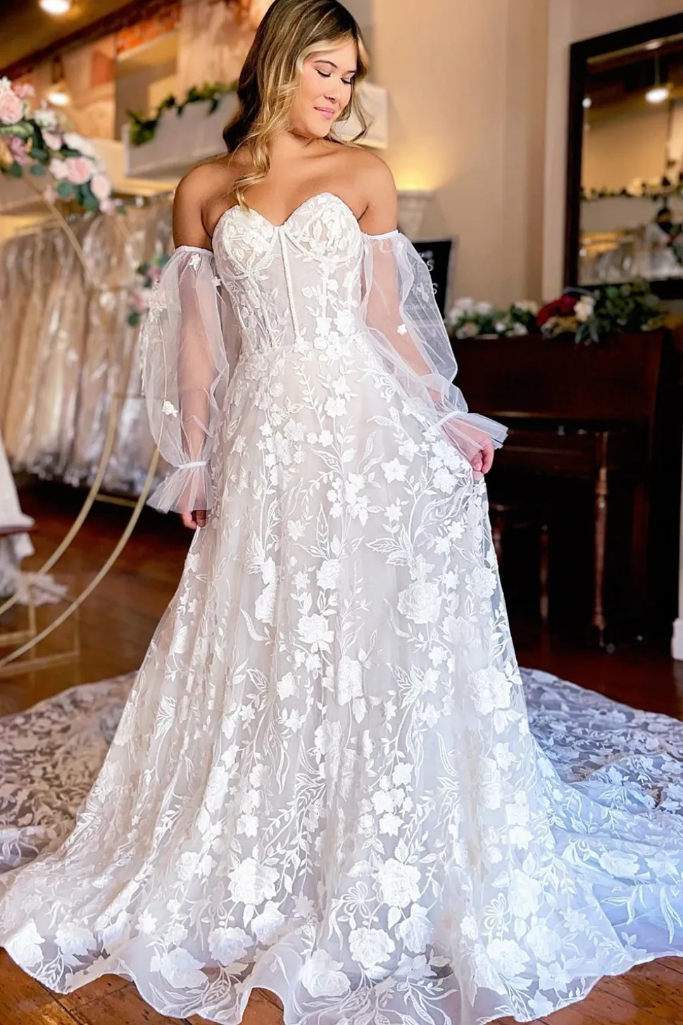 Ivory Sweetheart Corset Detachale Long Sleeves Long Lace Wedding Dress