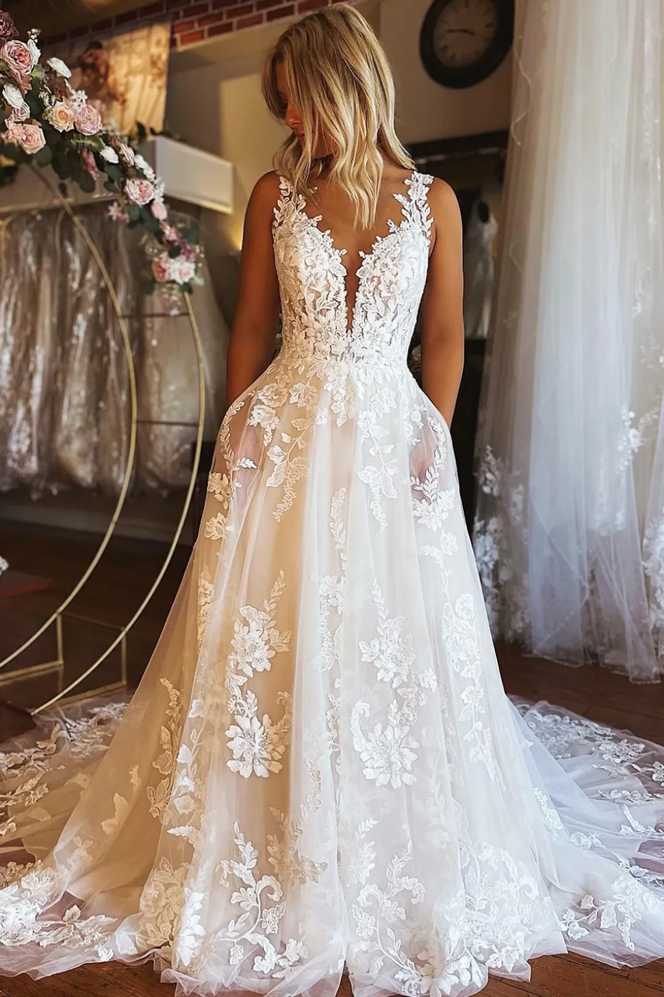 Ivory V-Neck A-Line Tulle Wedding Dress with Pockets