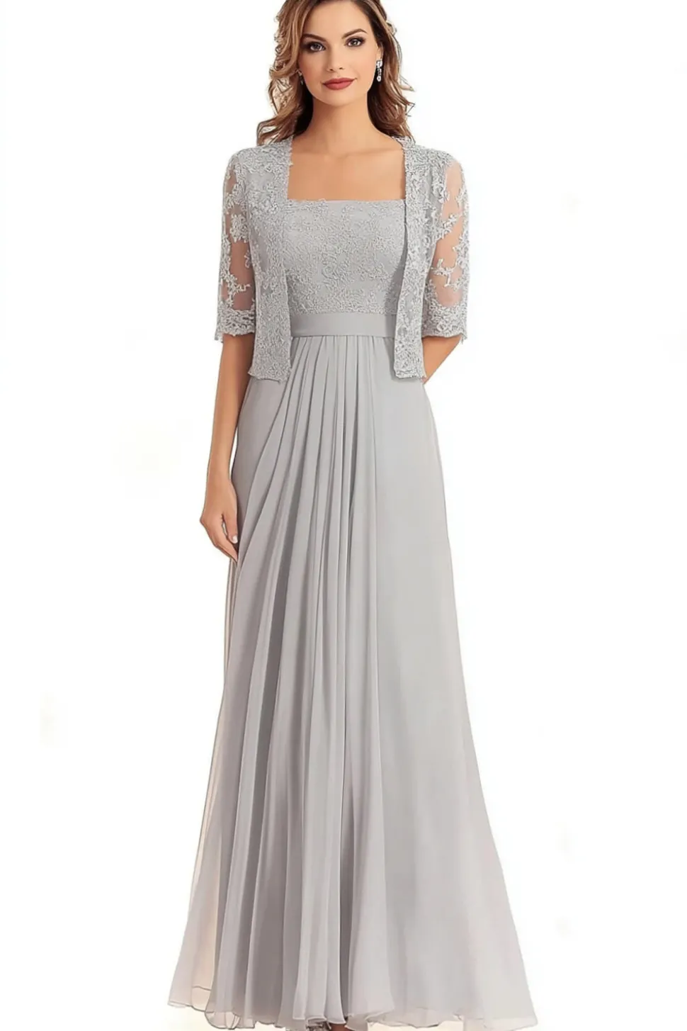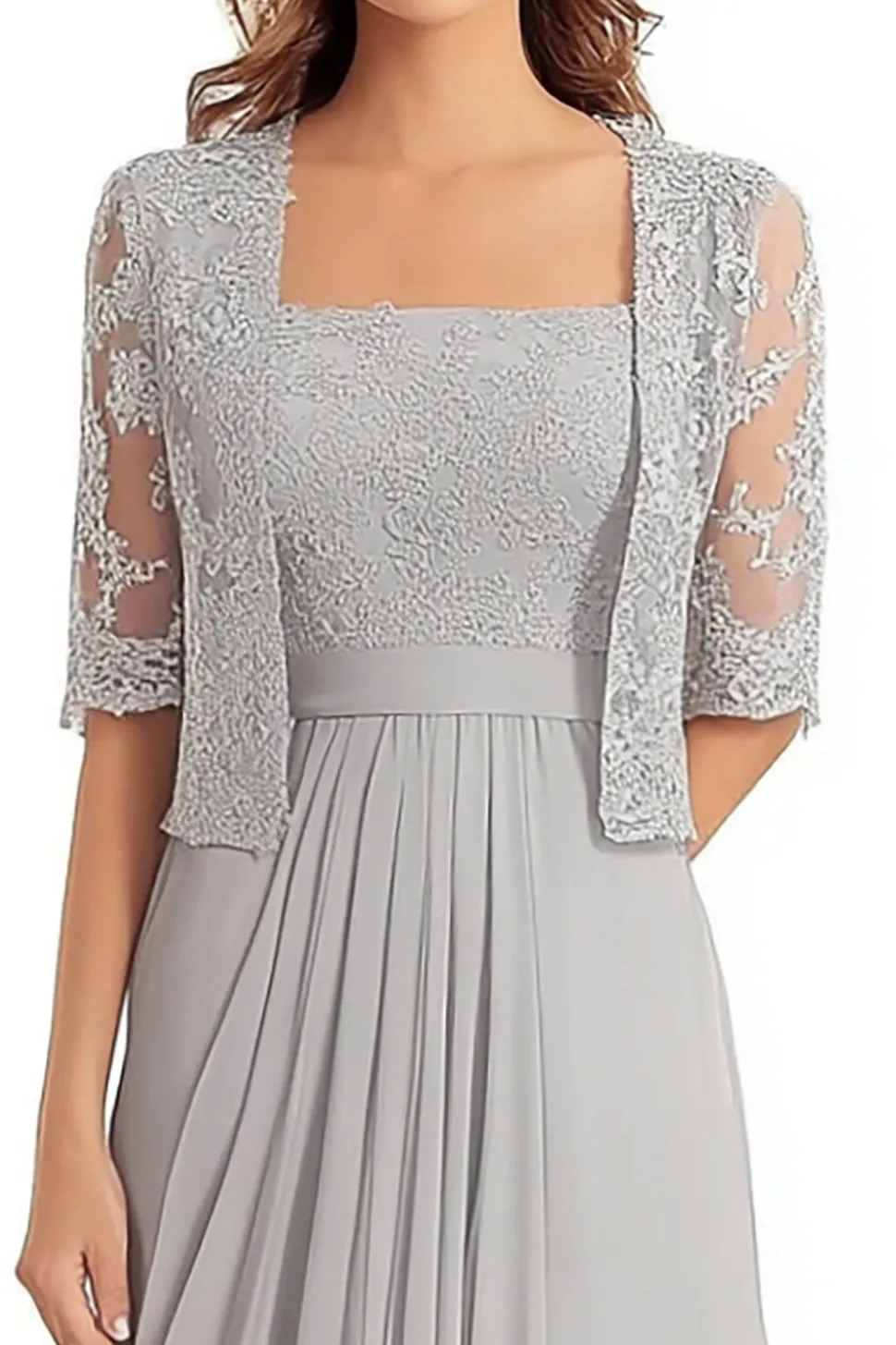 Lace Appliques Silver Square Neck 2-piece Half Sleeves Mother of the Bride Dress