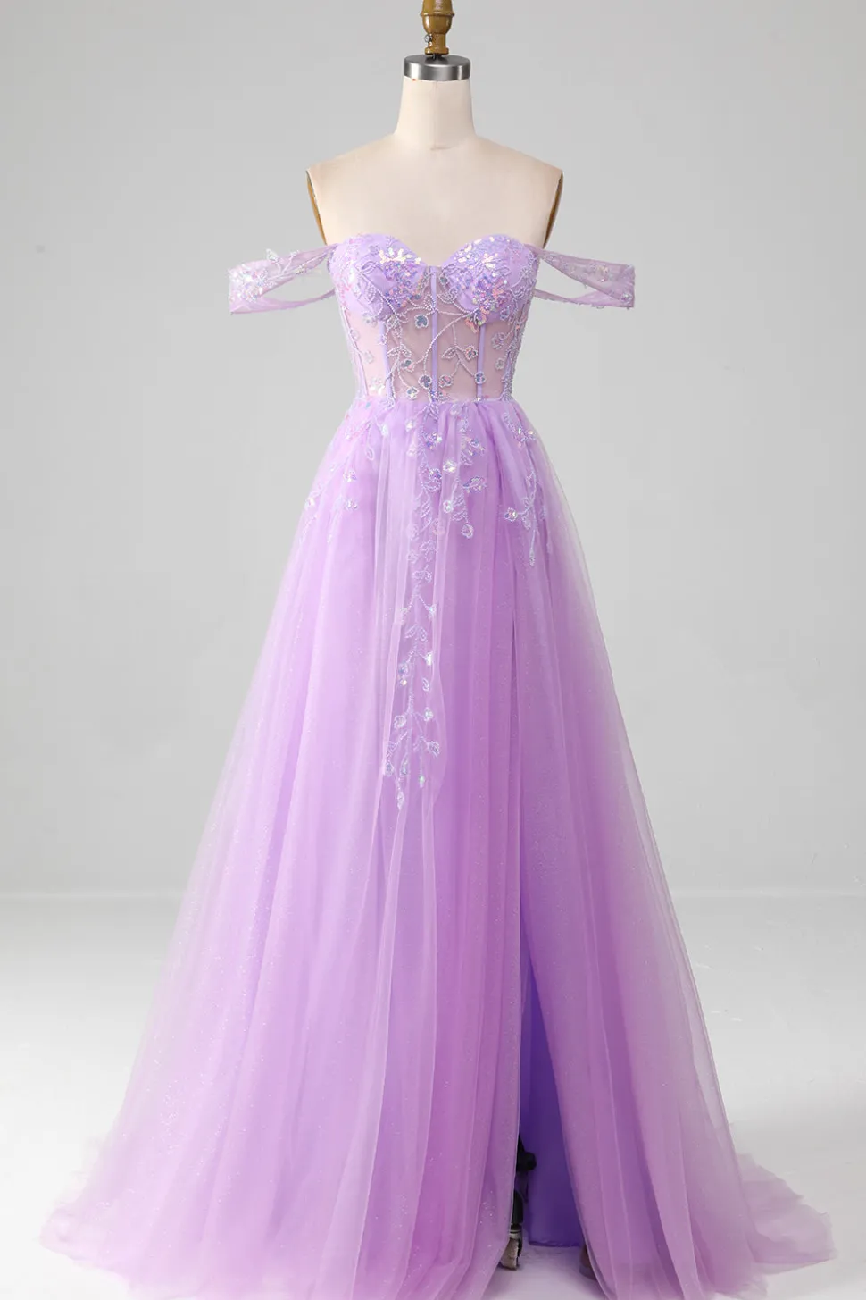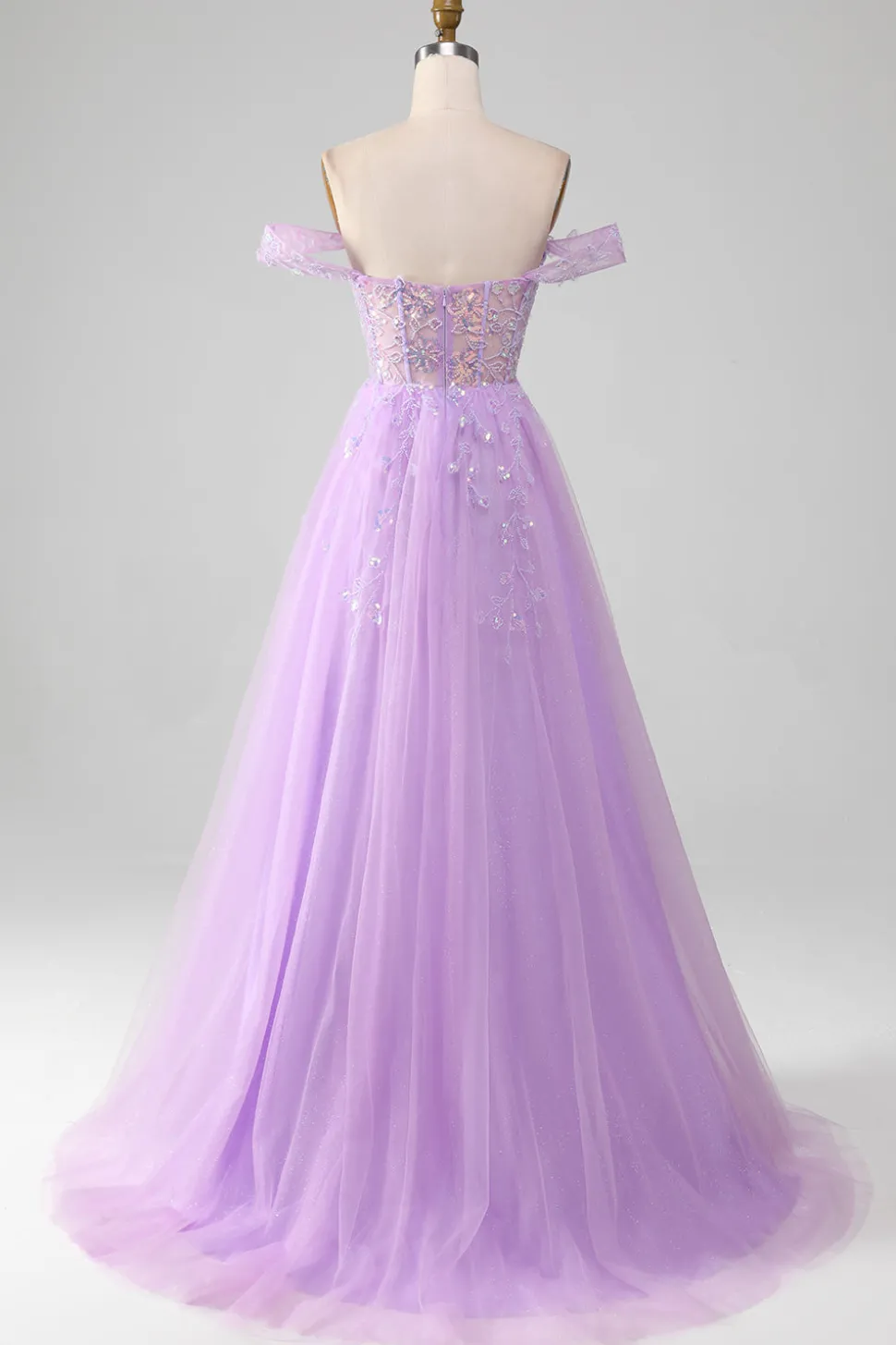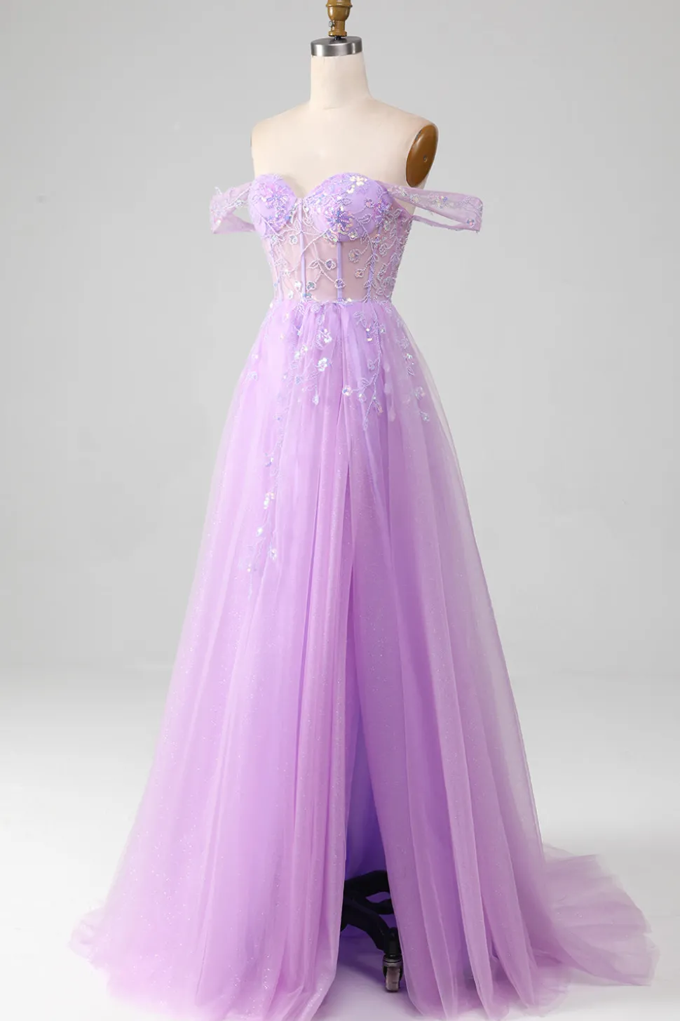 Lavender A Line Tulle Off the Shoulder Prom Dress with Slit