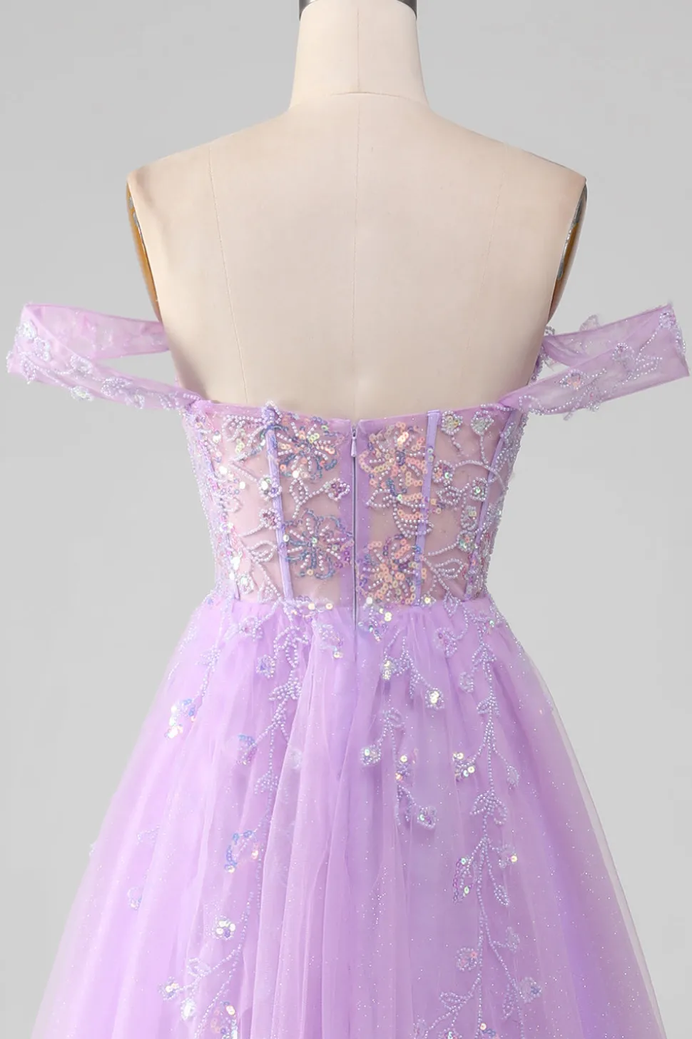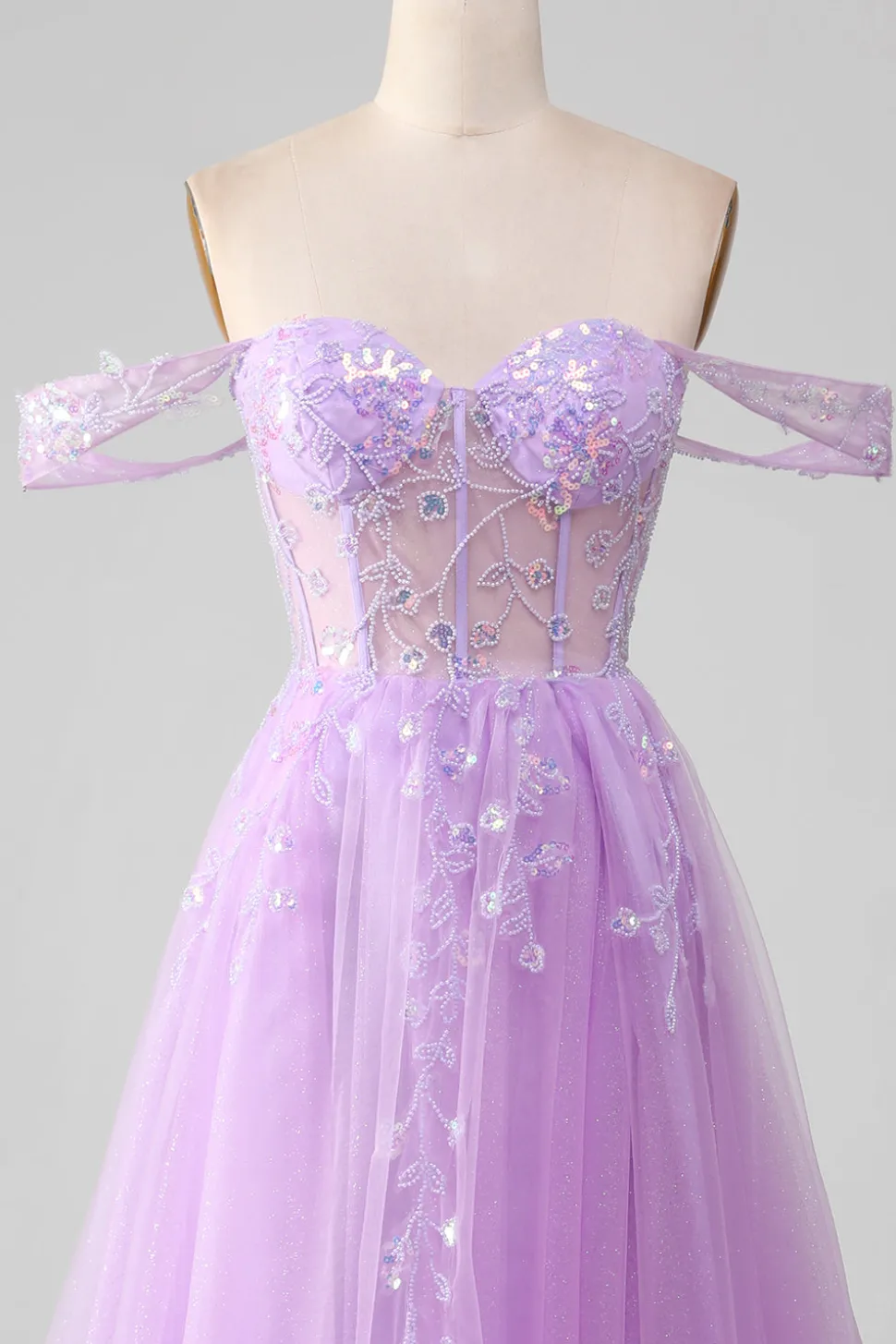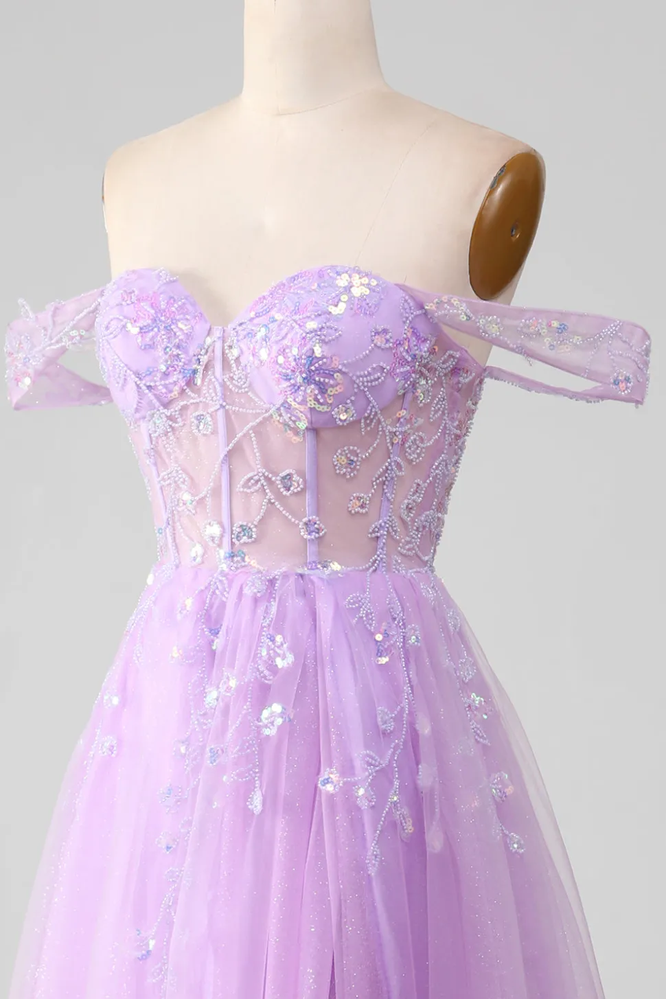 Lavender A Line Tulle Off the Shoulder Prom Dress with Slit