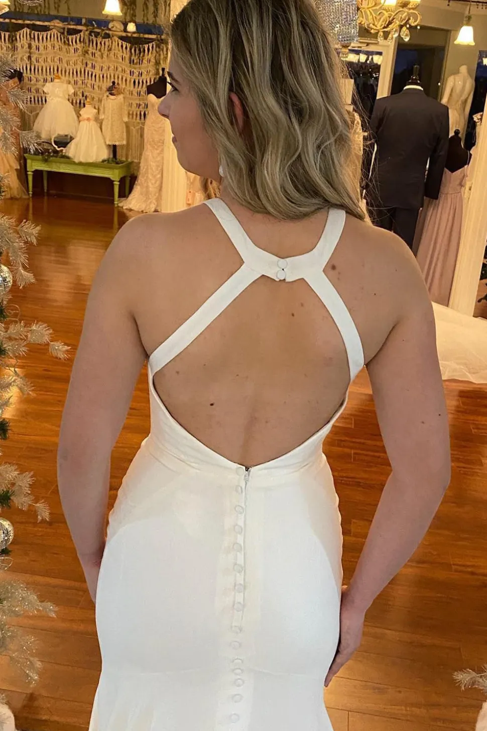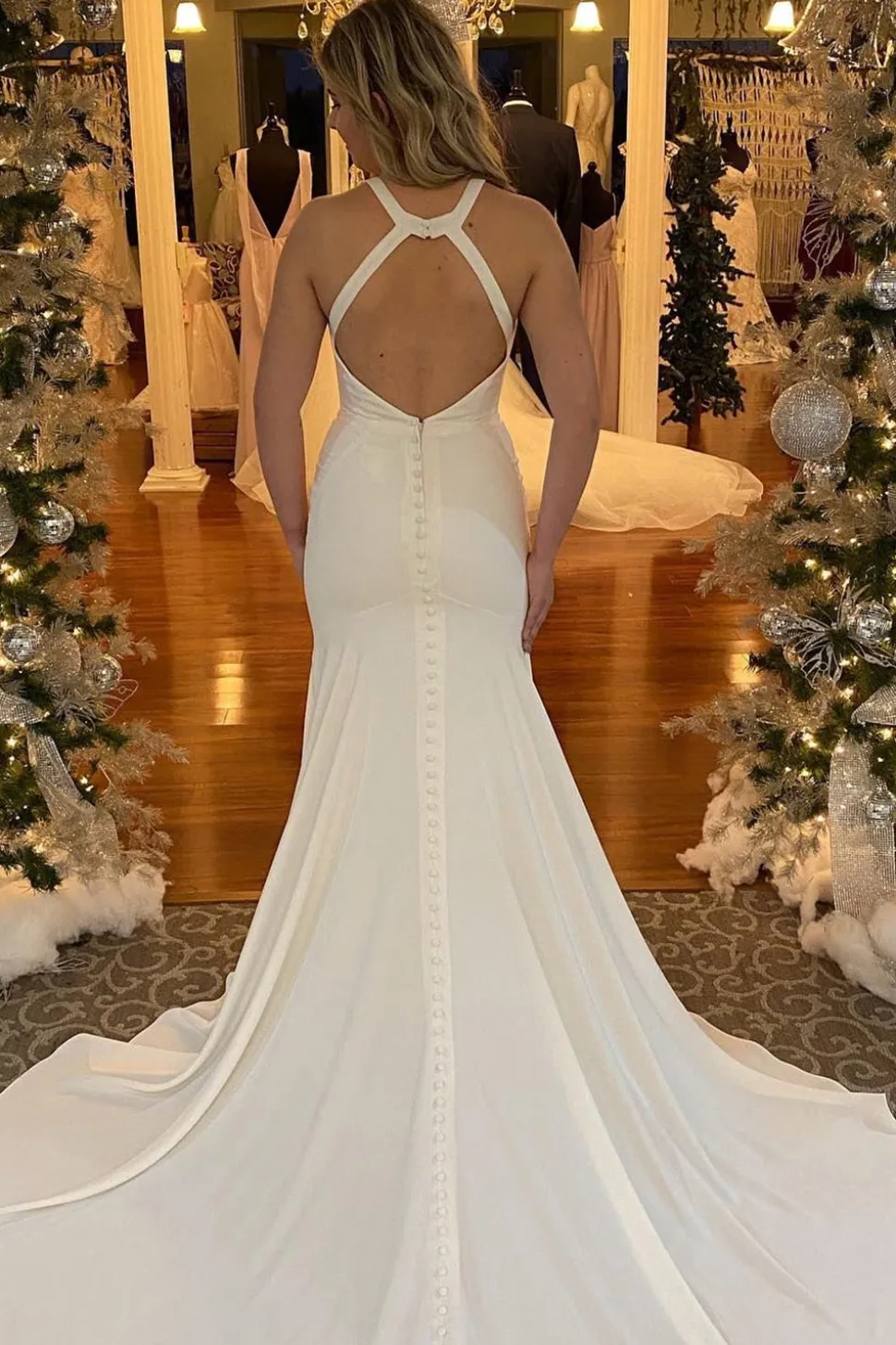 Be the first to review “Mermaid Halter White Long Simple Wedding Dress with Button” Cancel reply