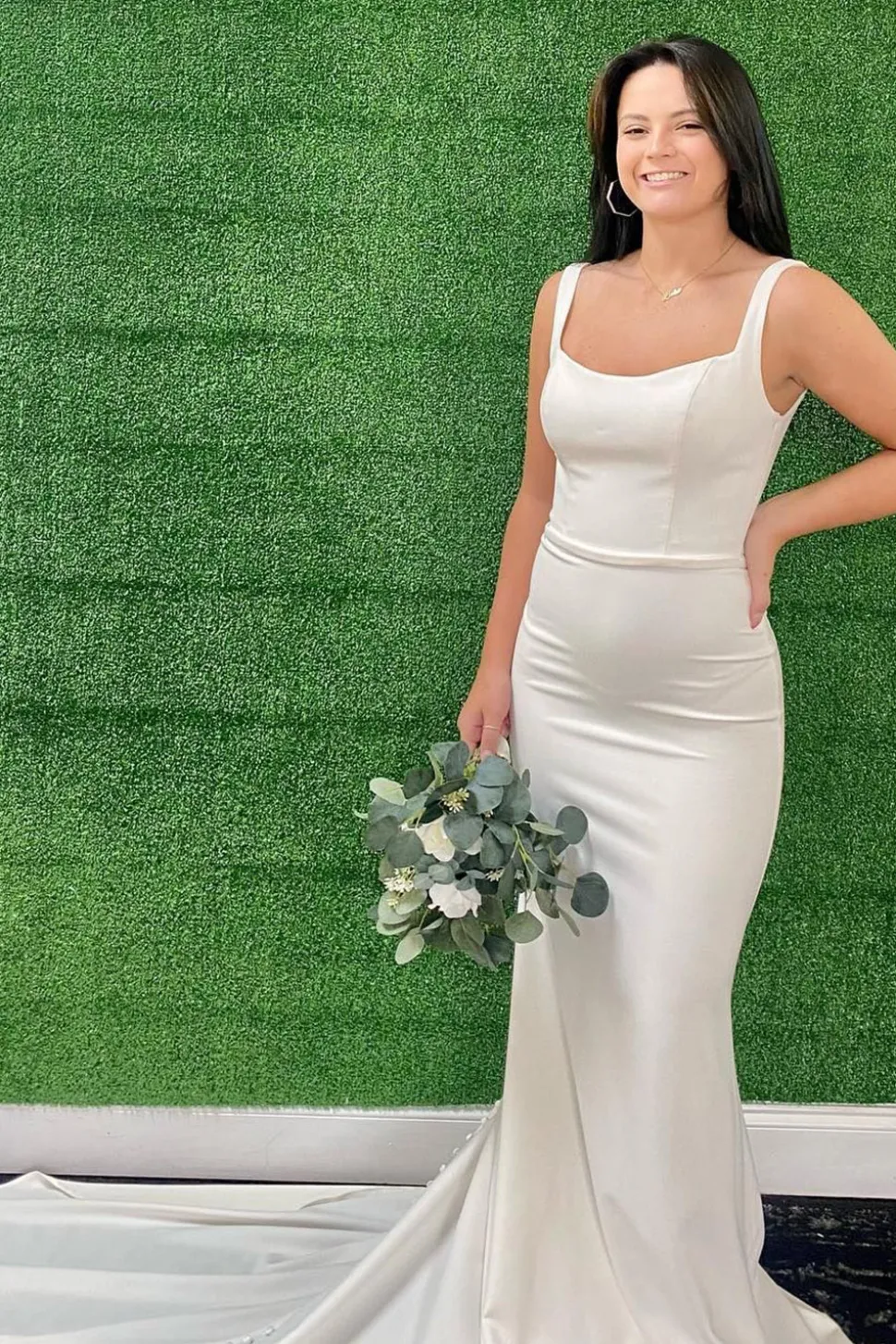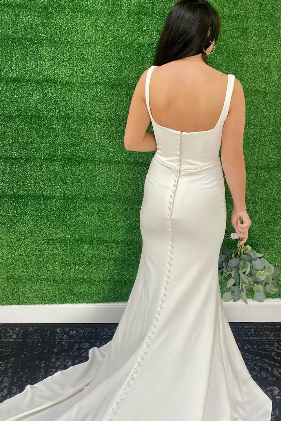 Mermaid Square Neck White Simple Long Wedding Dress with Button