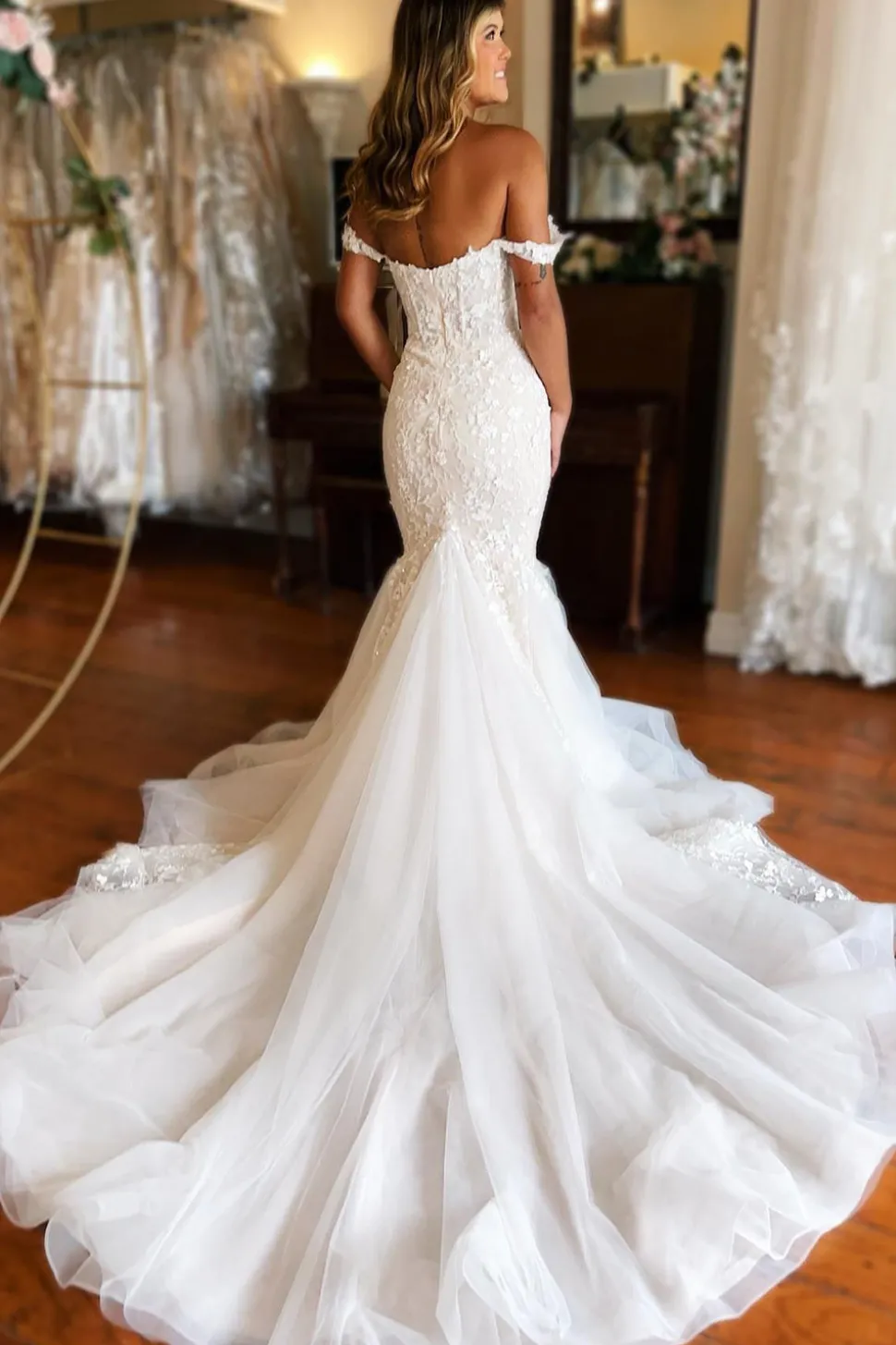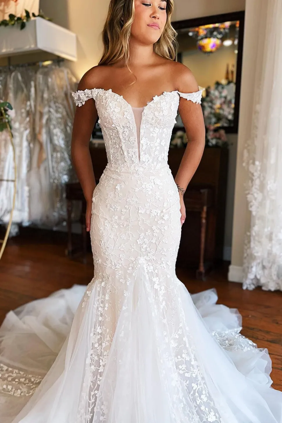 Mermaid White Lace Sweep Train Long Wedding Dress
