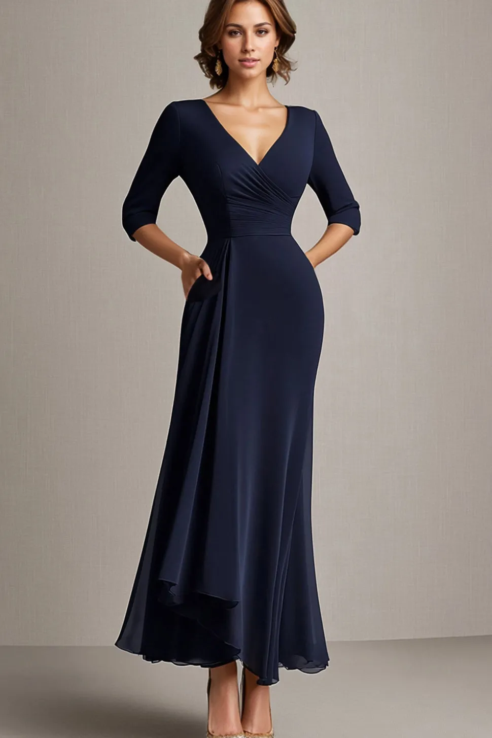 Navy A-Line Chiffon V-Neck Long Mother of the Bride Dress with Half Sleeves