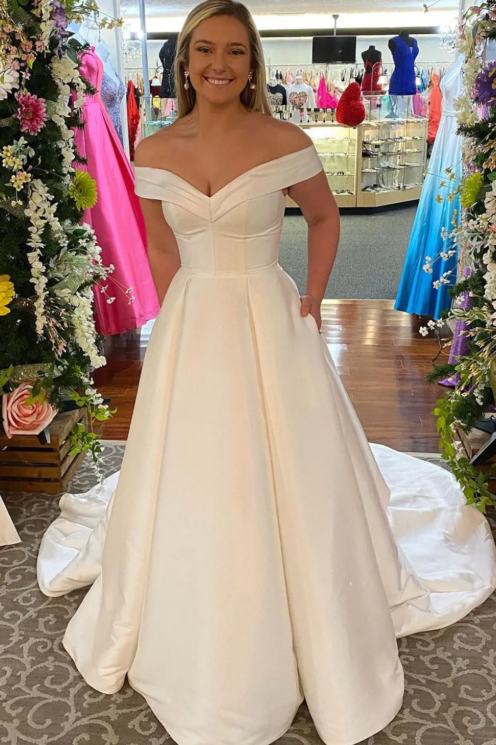 Be the first to review “Off The Shoulder White Corset Simple Long Wedding Dress with Pockets” Cancel reply
