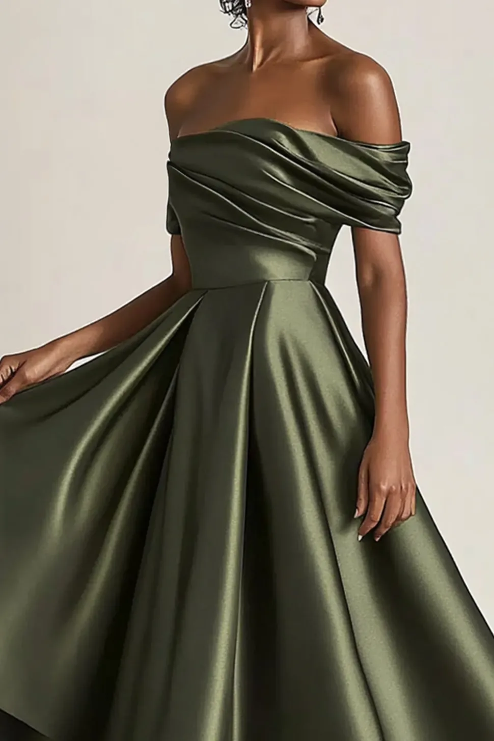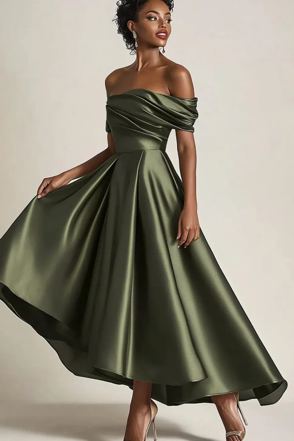 Olive A-Line Off the Shoulder Ruched Satin Ankle Length Mother of the Bride Dress