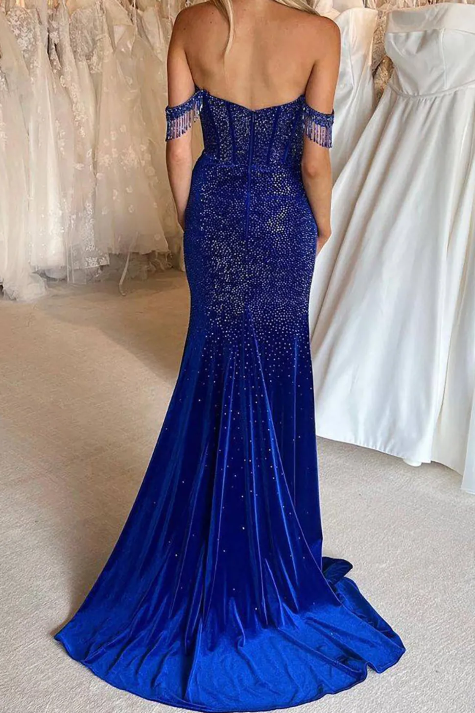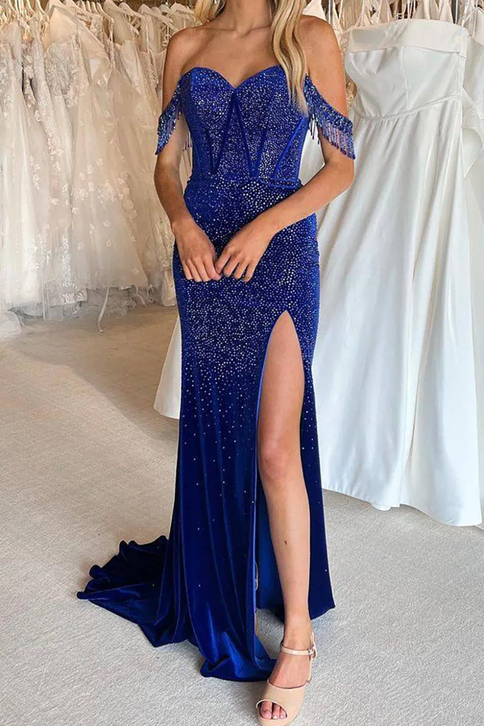 A Line Off the Shoulder Royal Blue Prom Dress with Split Front