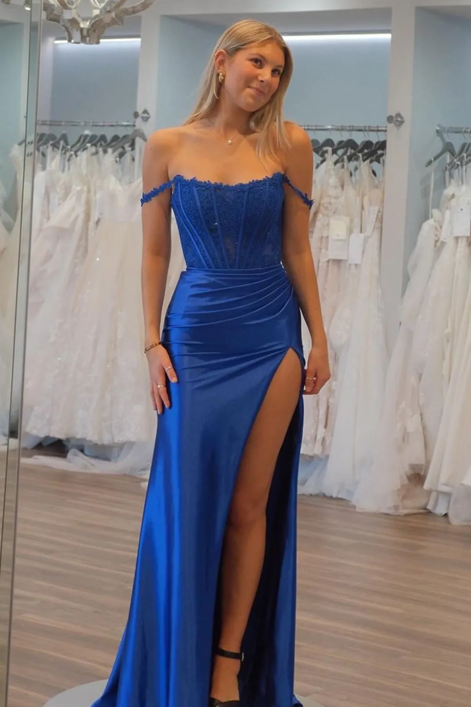 A Line Off the Shoulder Royal Blue Prom Dress with Split Front