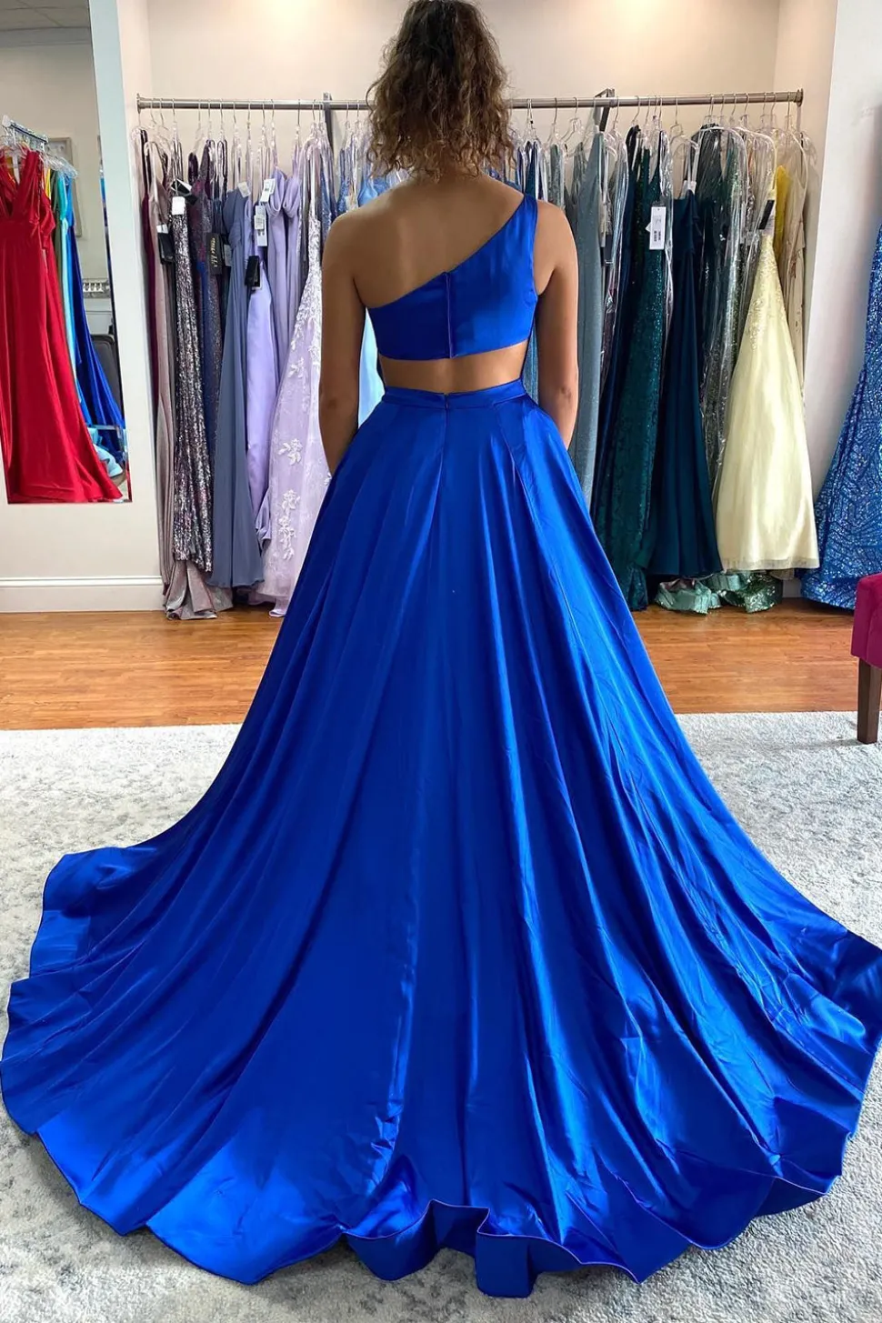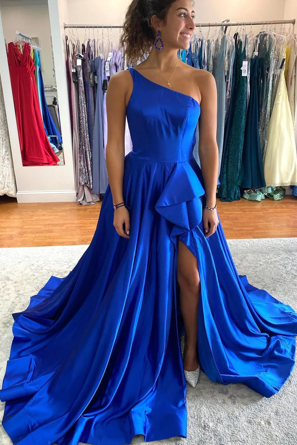 A Line Off the Shoulder Royal Blue Prom Dress with Split Front