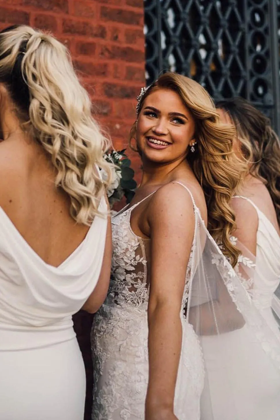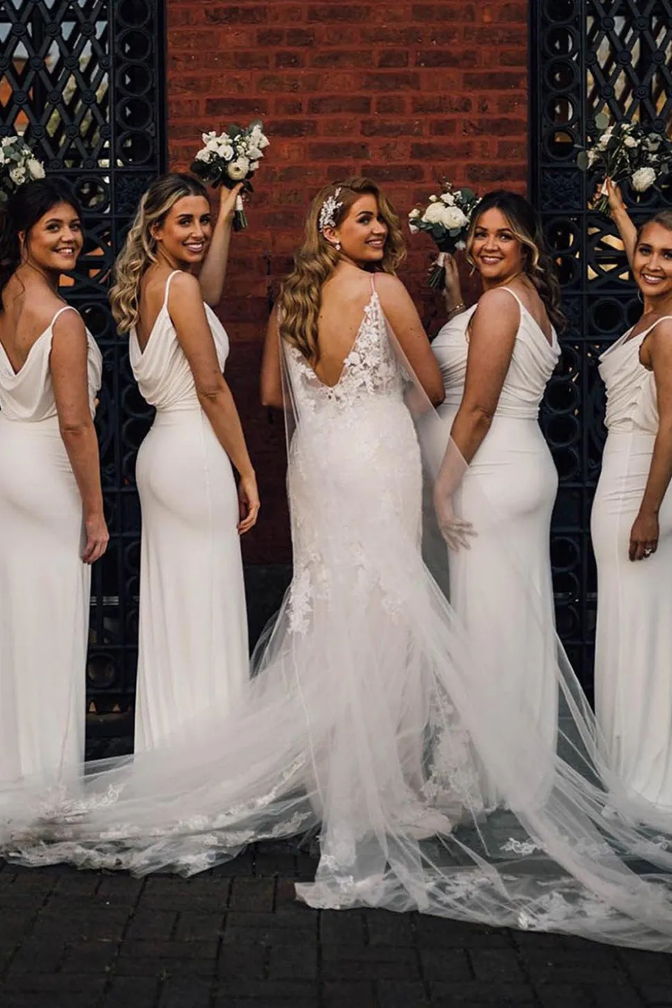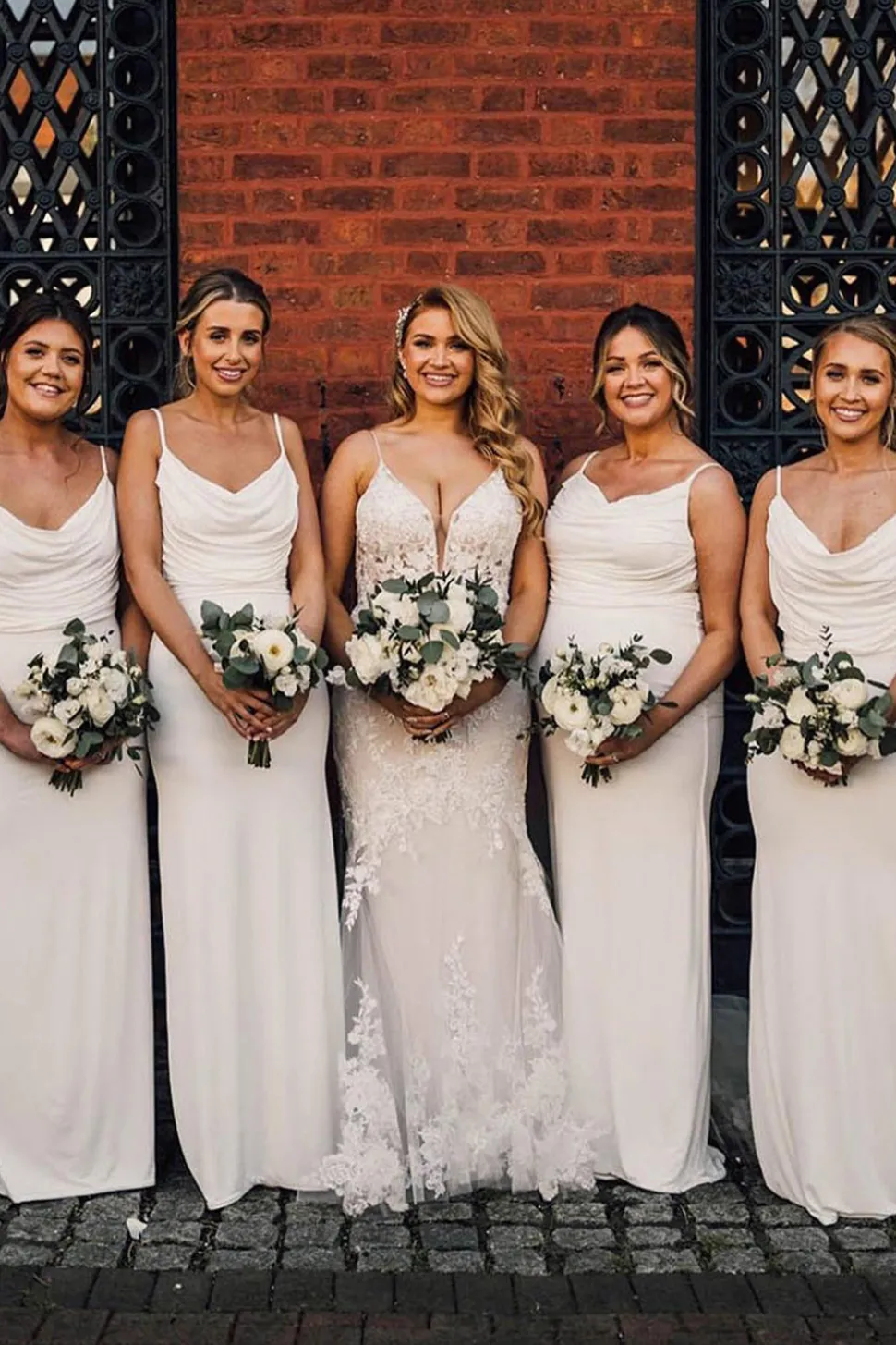 Sheath Spaghetti Strap Ivory Draped Long Bridesmaid Dress