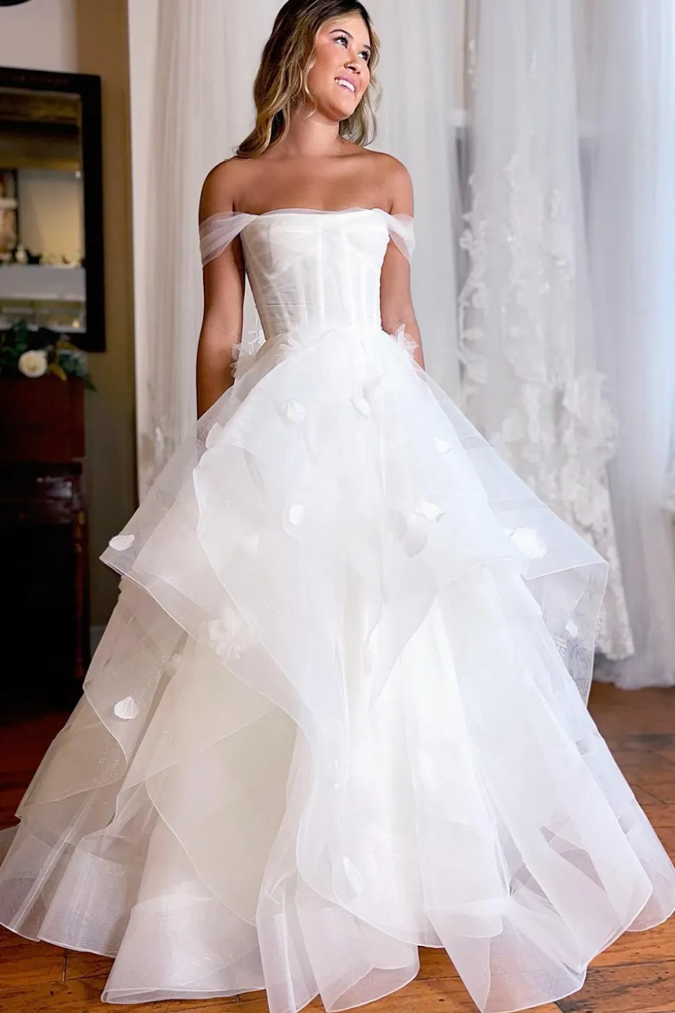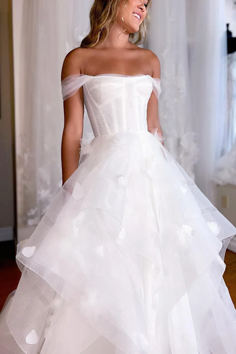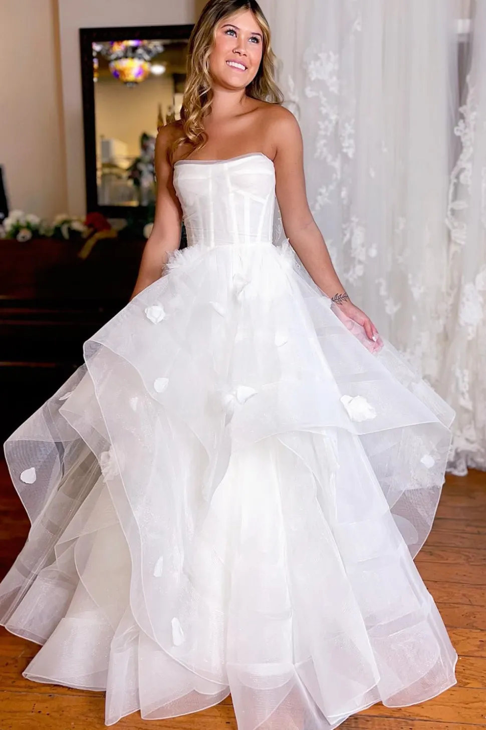 Simple White Corset A-Line Asymmetrical Wedding Dress with Flowers