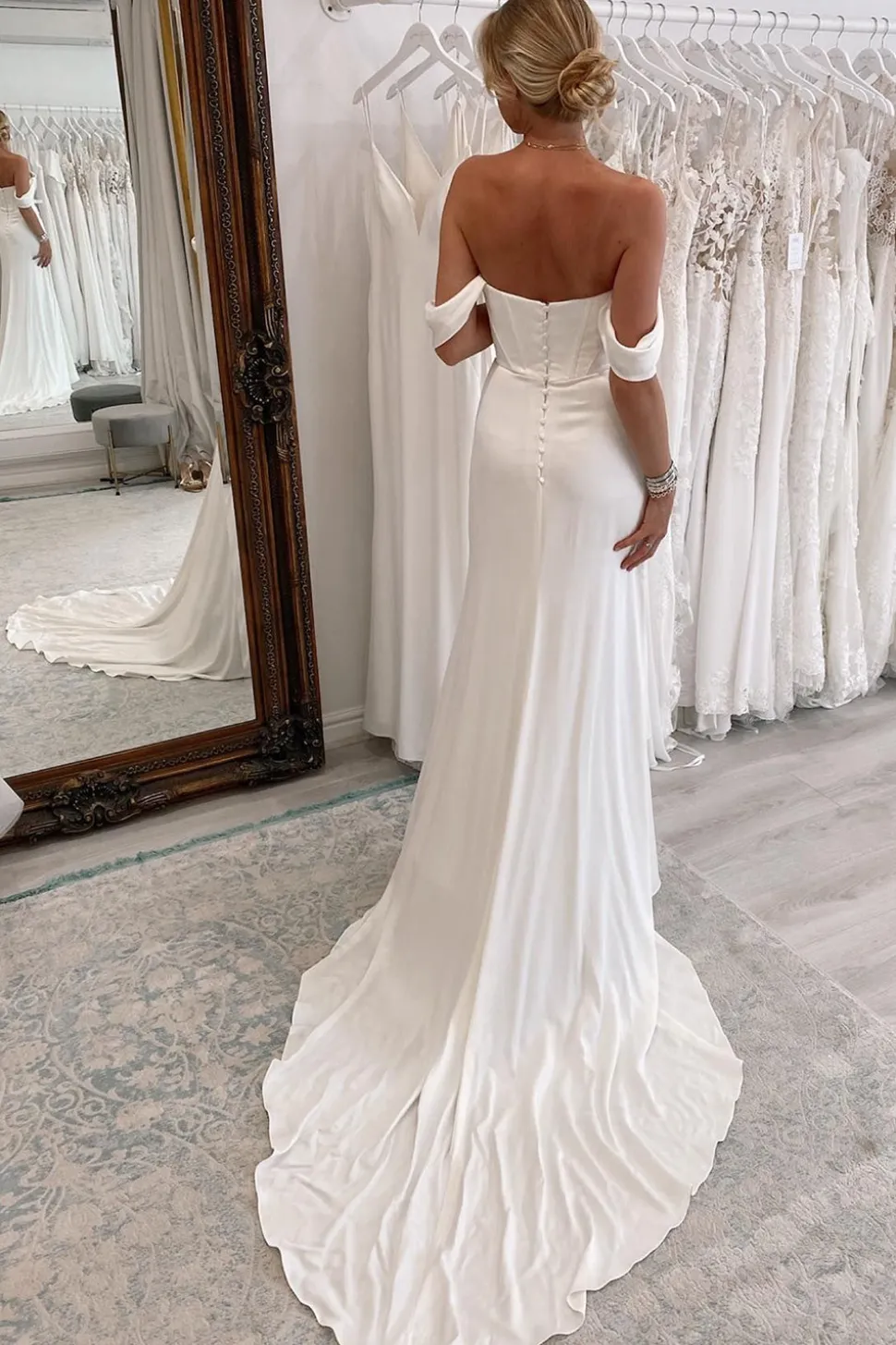 Simple White Long Boho Mermaid Wedding Dress with Slit