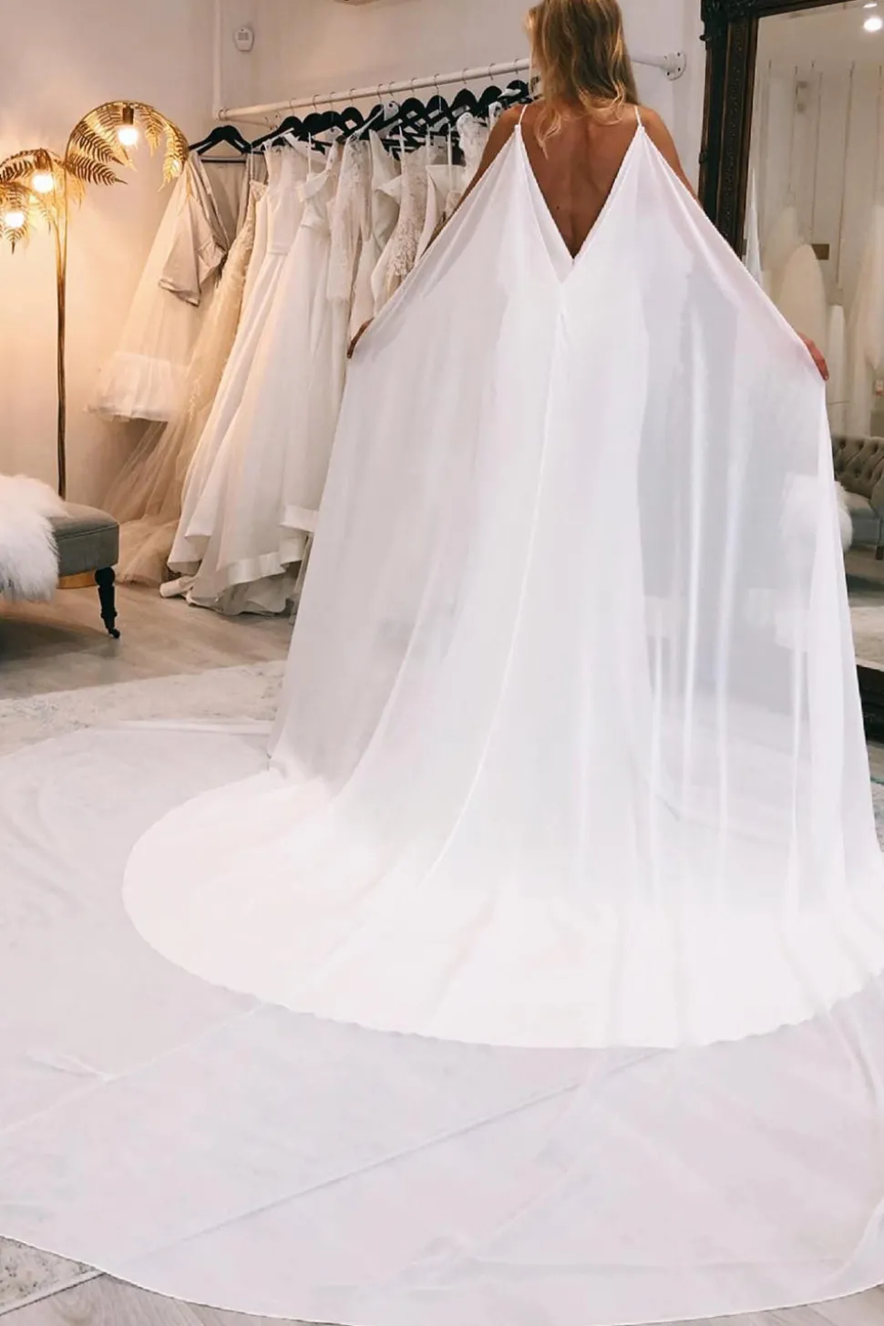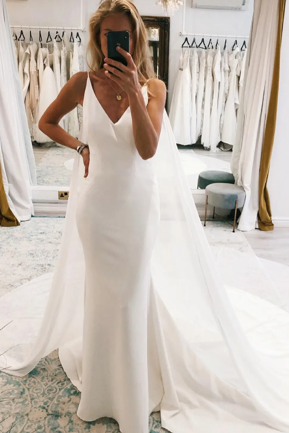 Simple White Watteau Train Boho Long Mermaid Wedding Dress