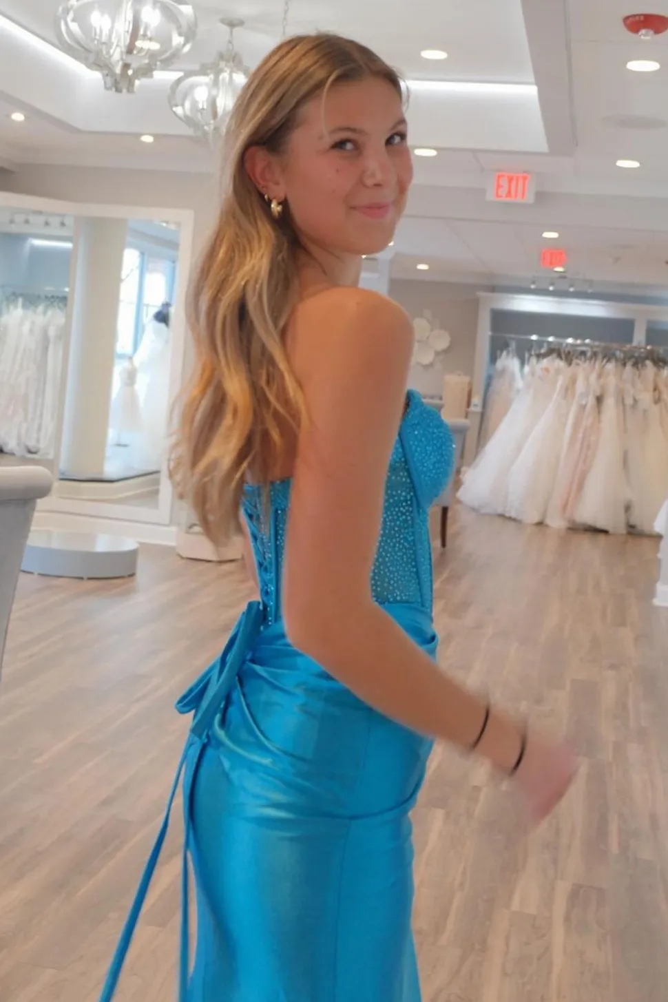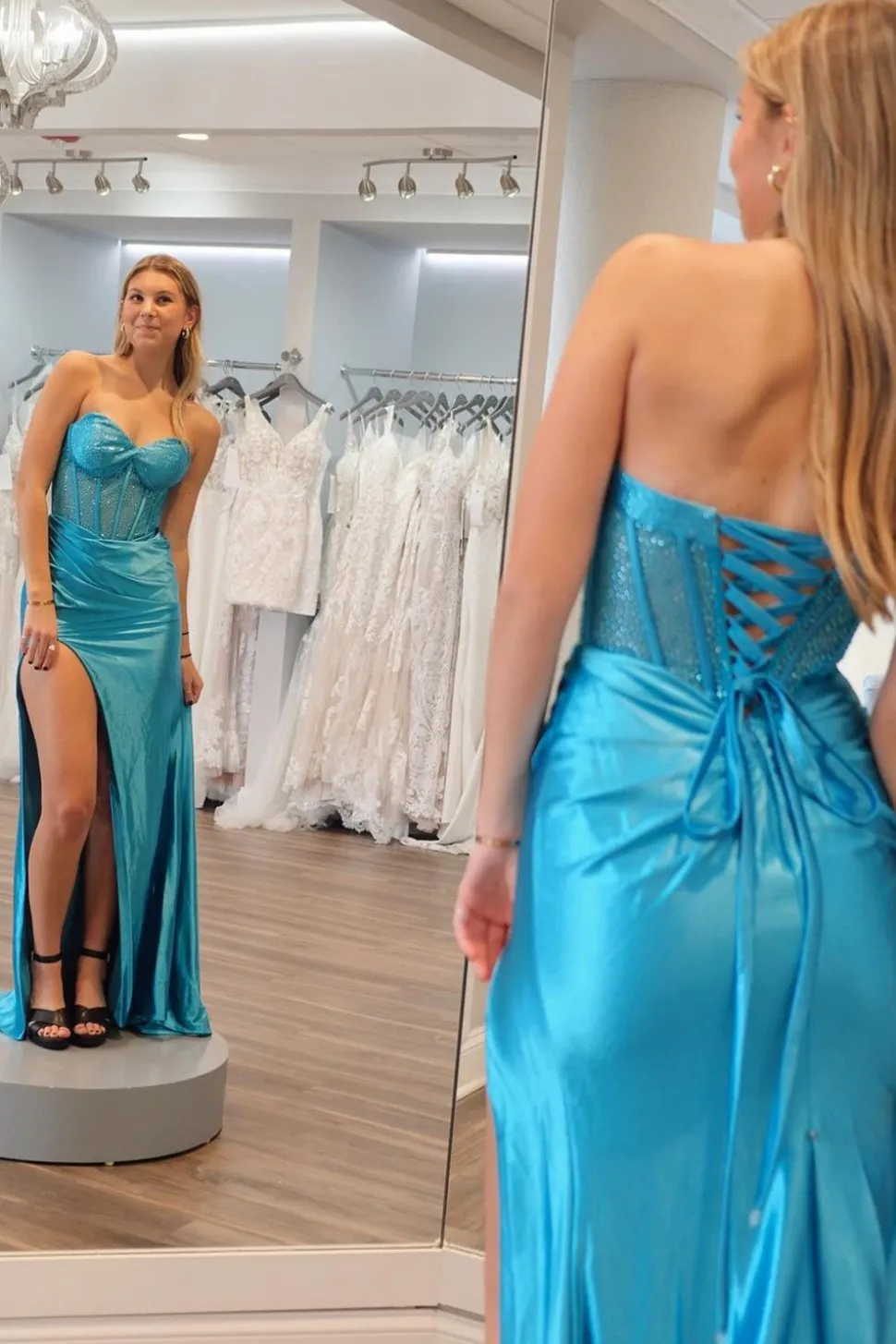 Sparkly Blue Strapless Corset Prom Dress with Slit