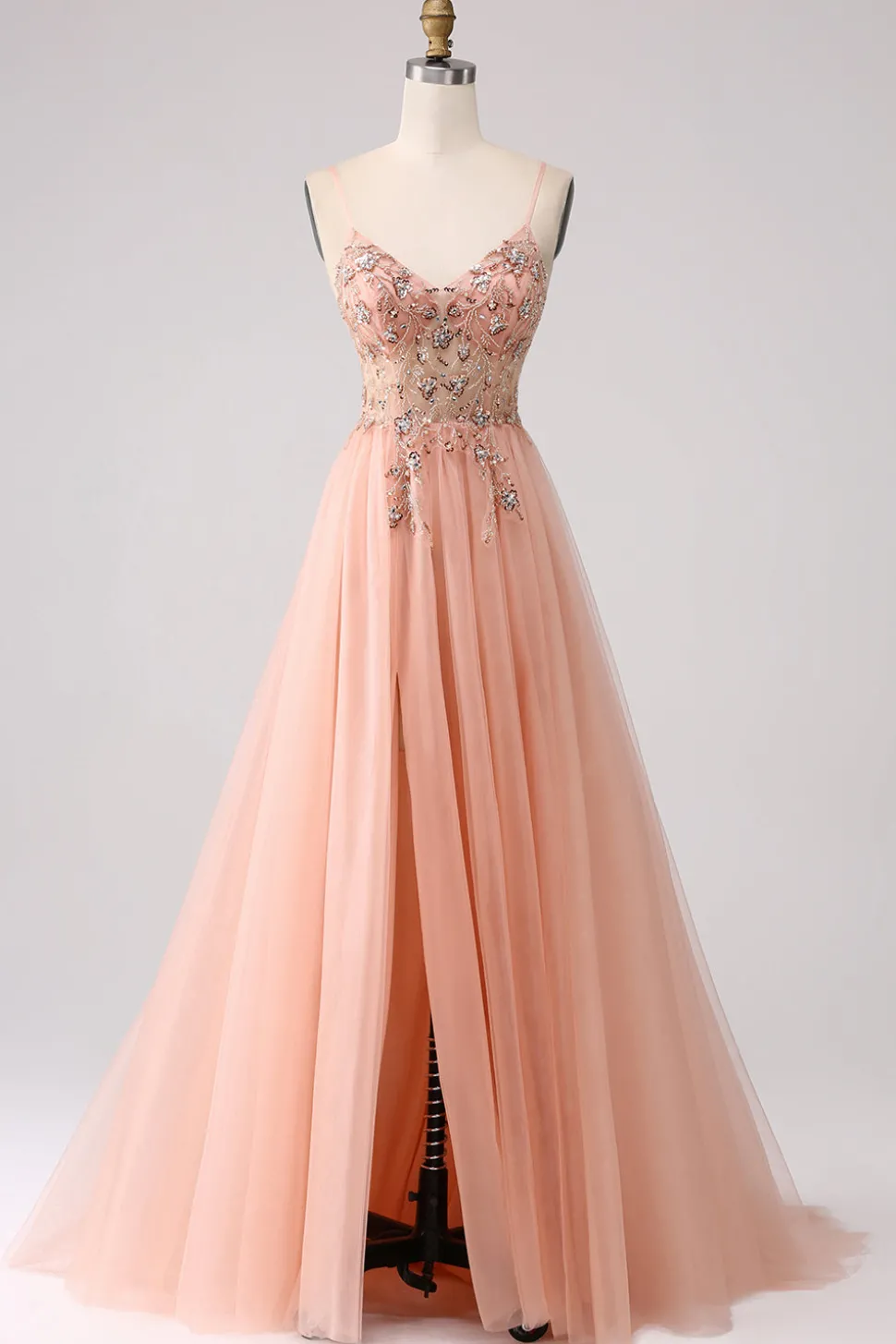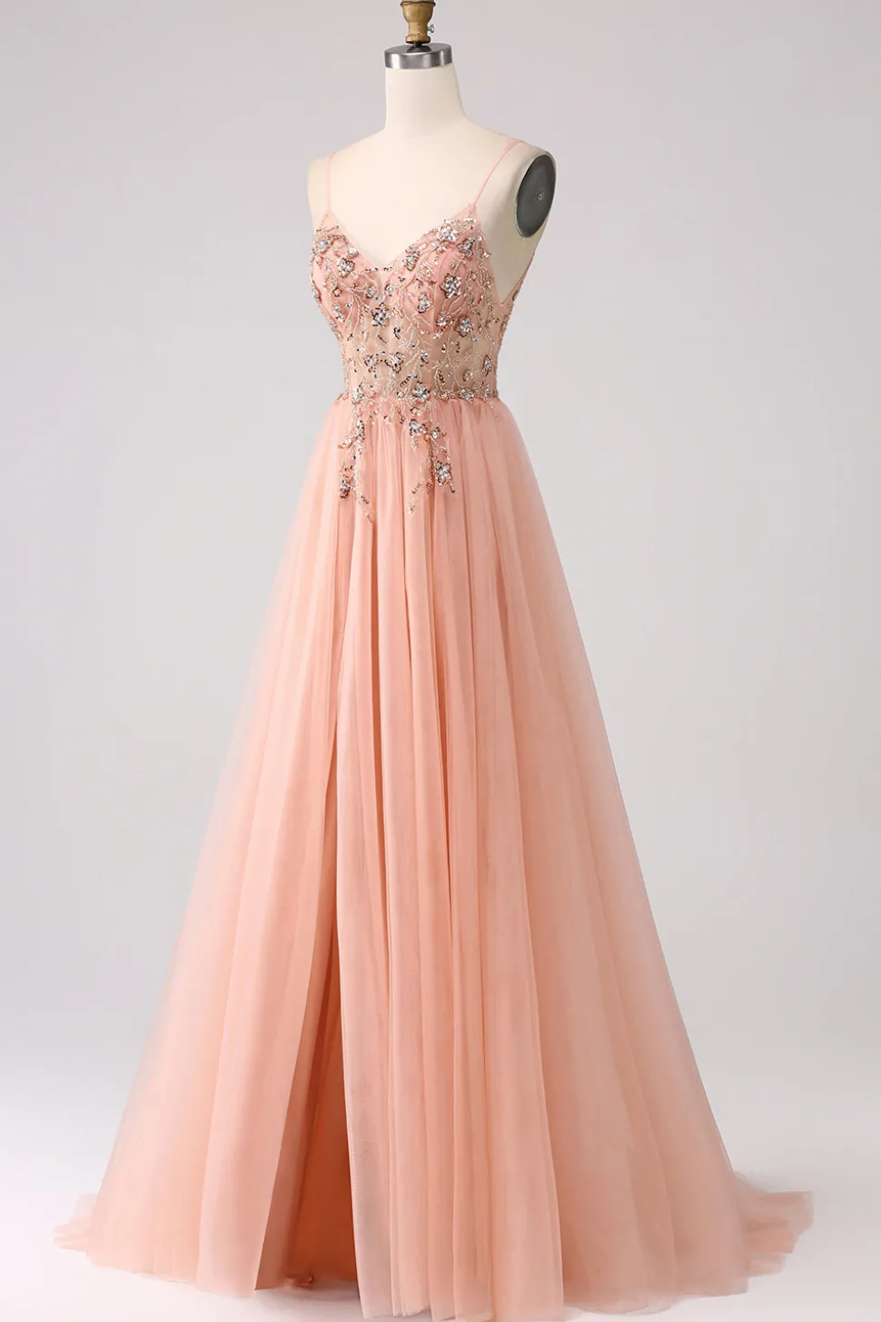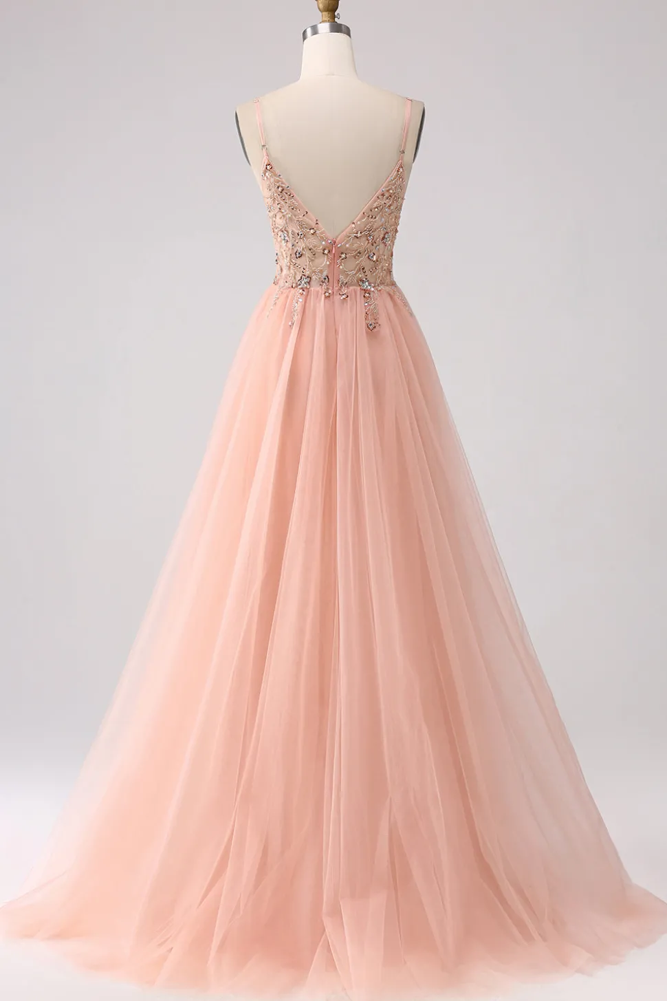 Sparkly Blush Tulle A Line Prom Dress with Beading