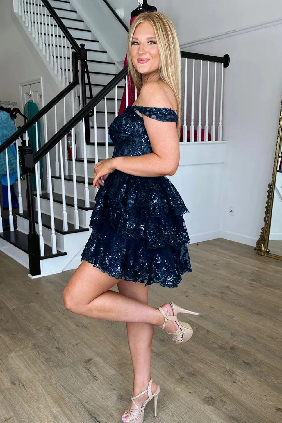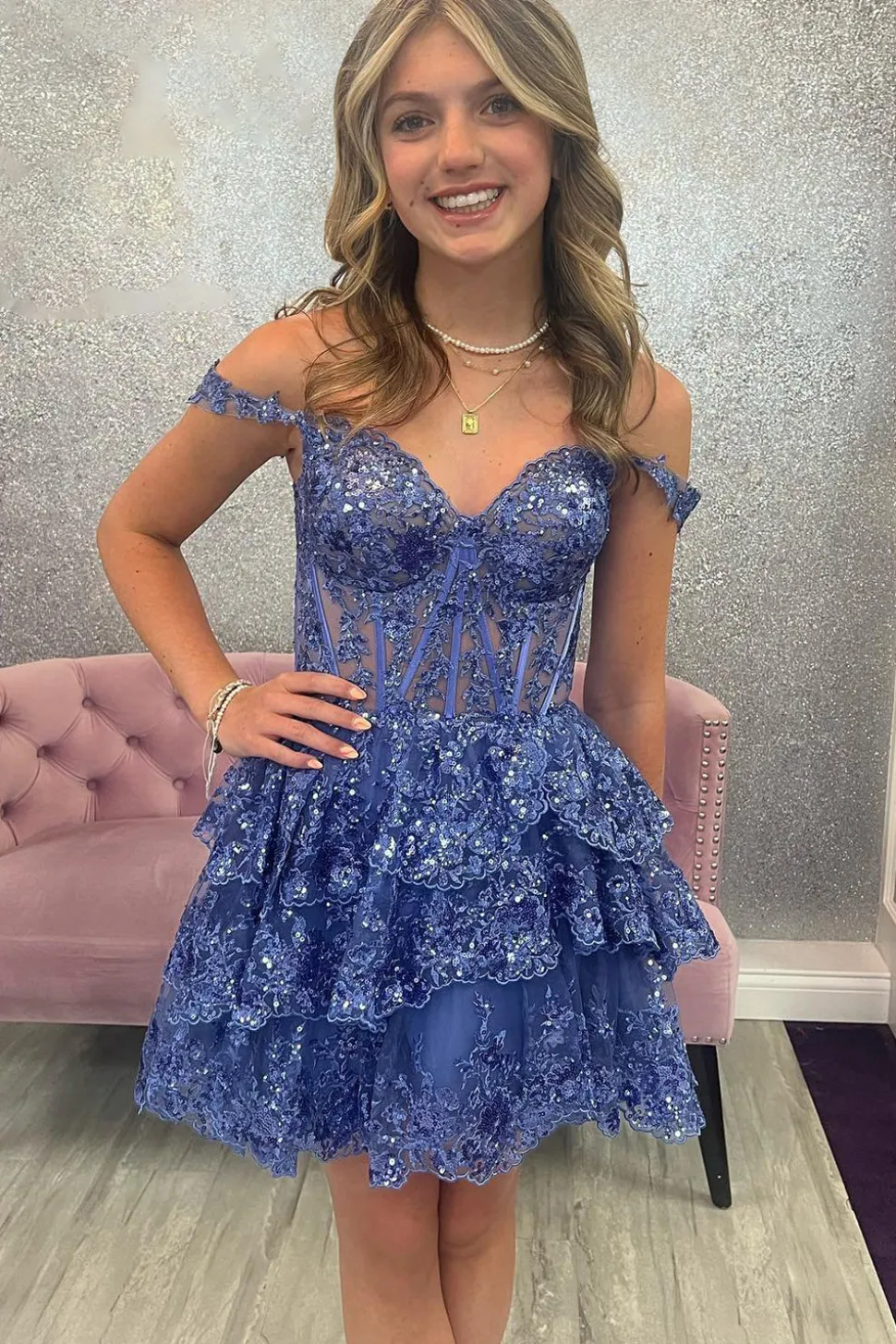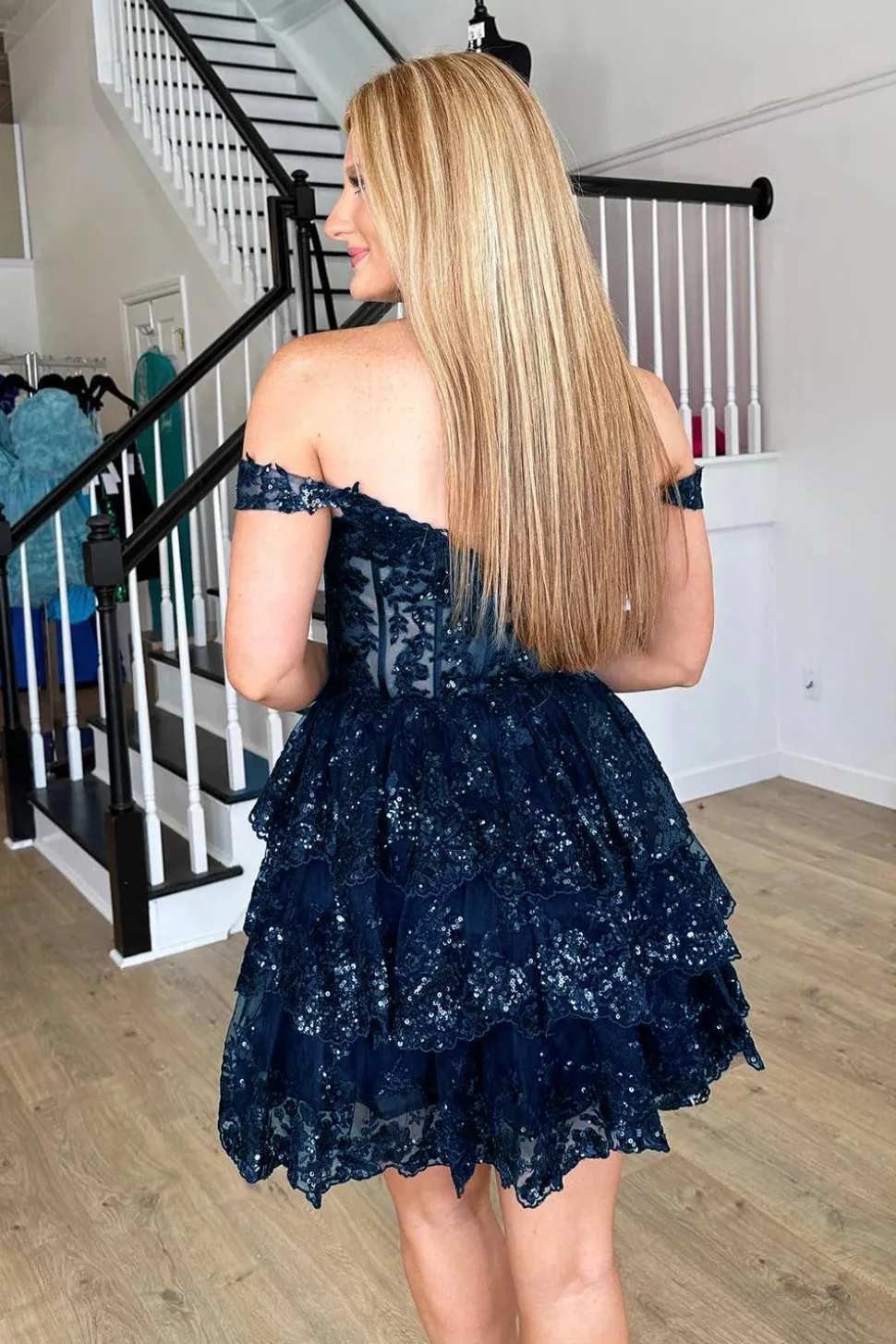 Sparkly Navy Corset Tiered Lace A-Line Short Graduation Dress