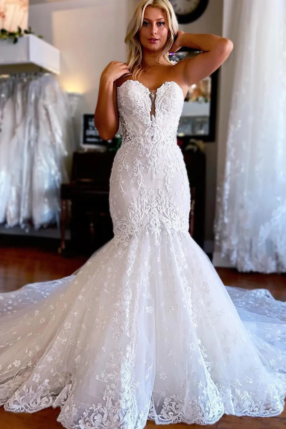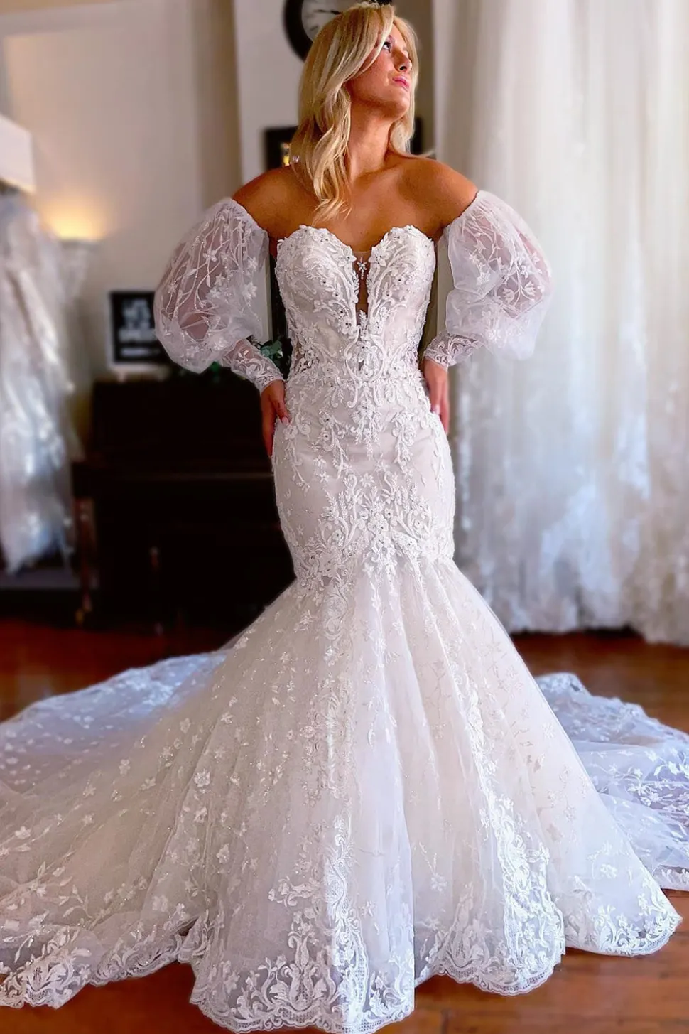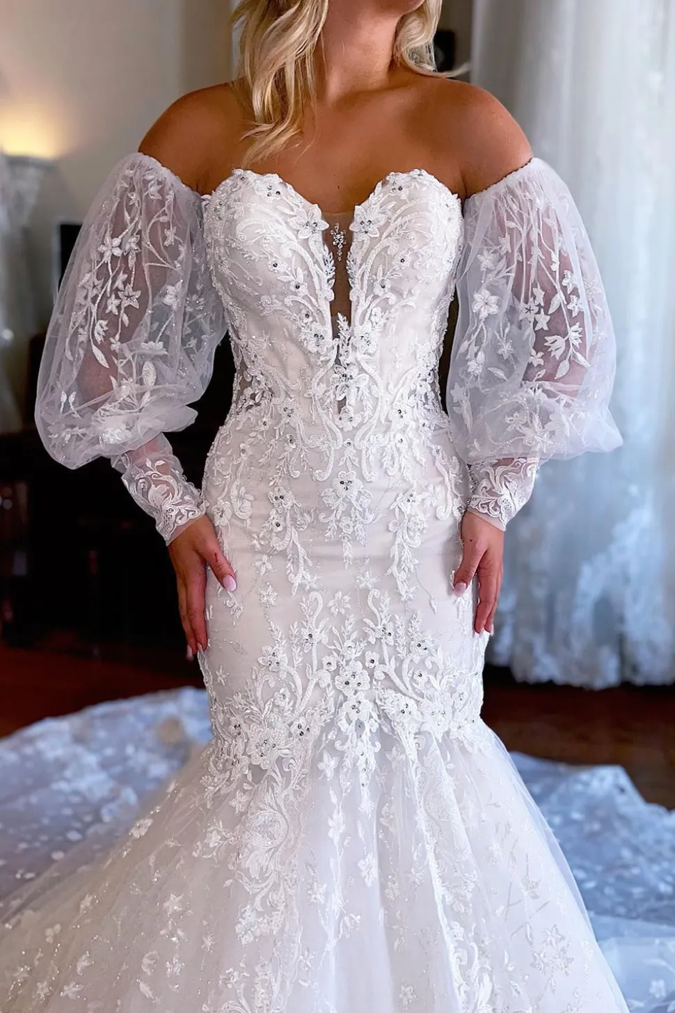 Sparkly White Mermaid Detachable Long Sleeves Lace Wedding Dress
