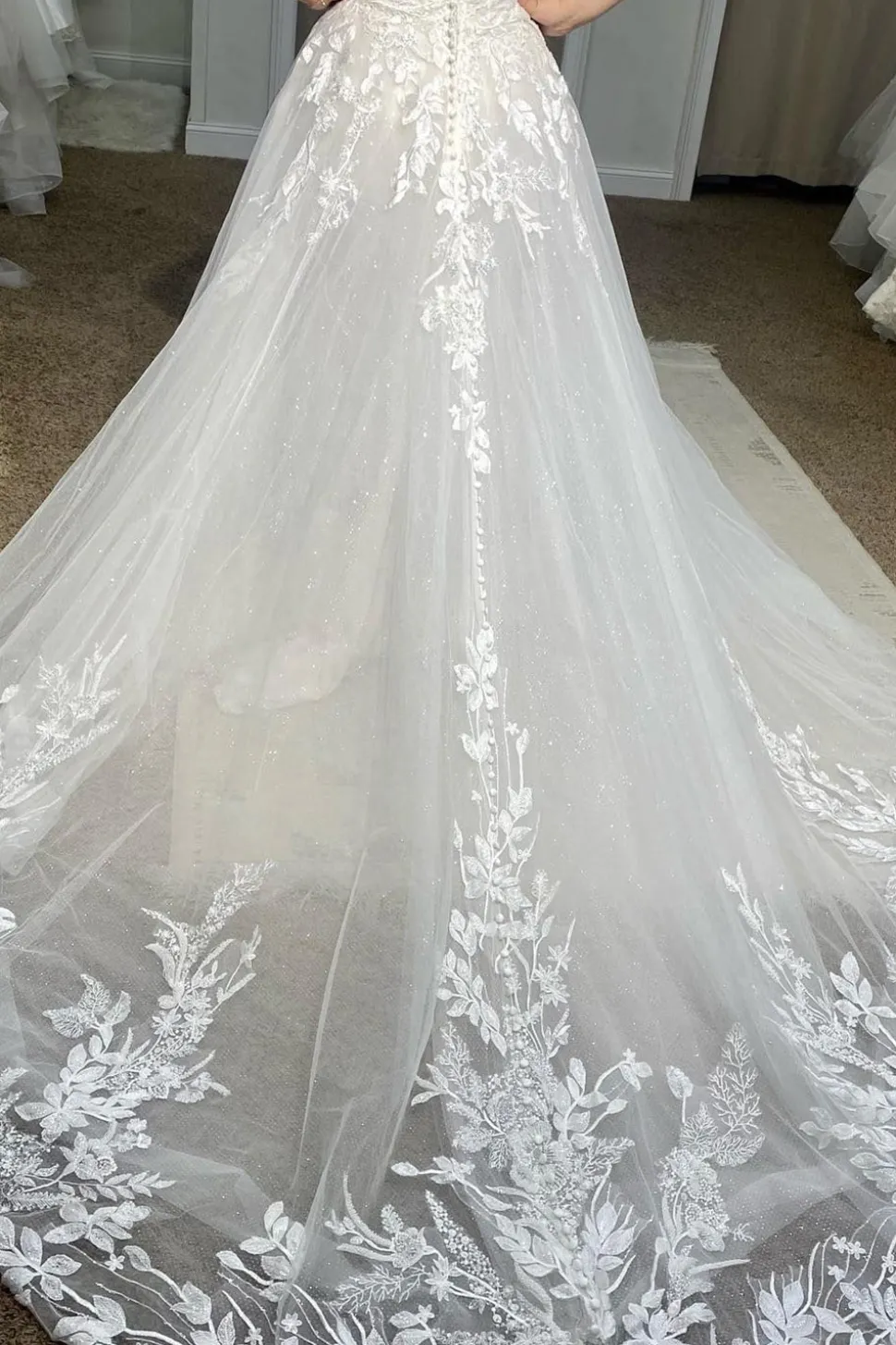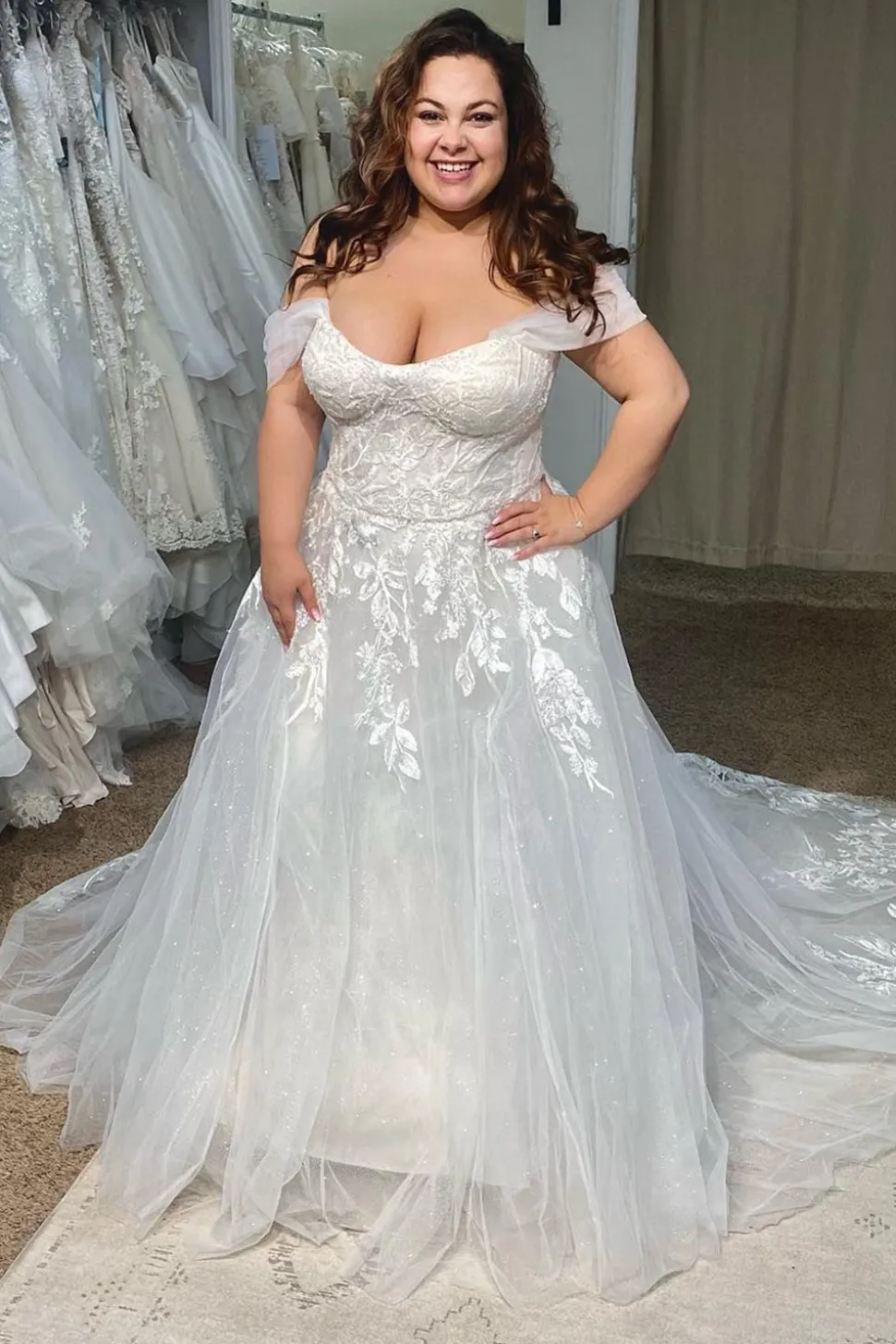 Tulle Off The Shoulder White Long Plus Size Wedding Dress with Appliques